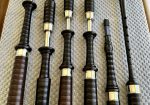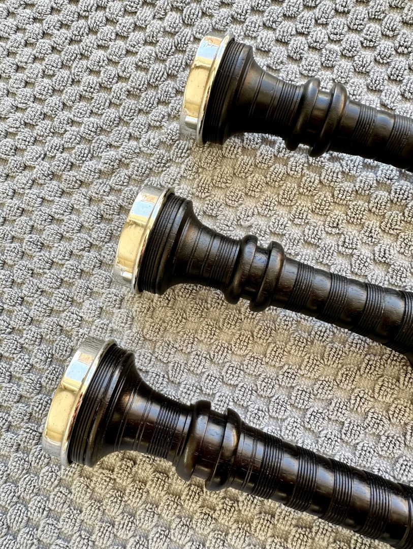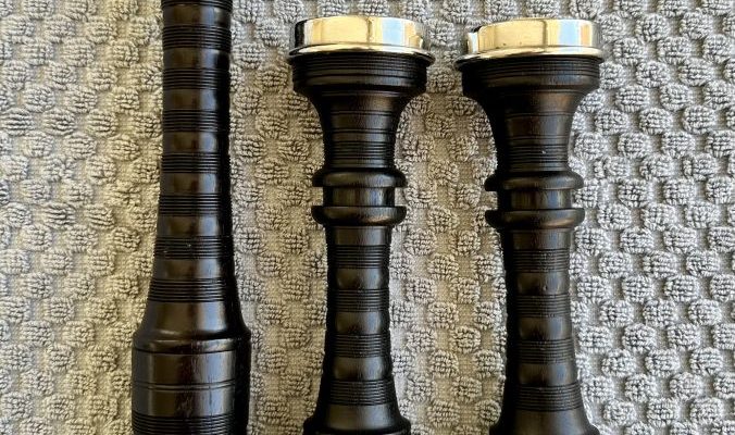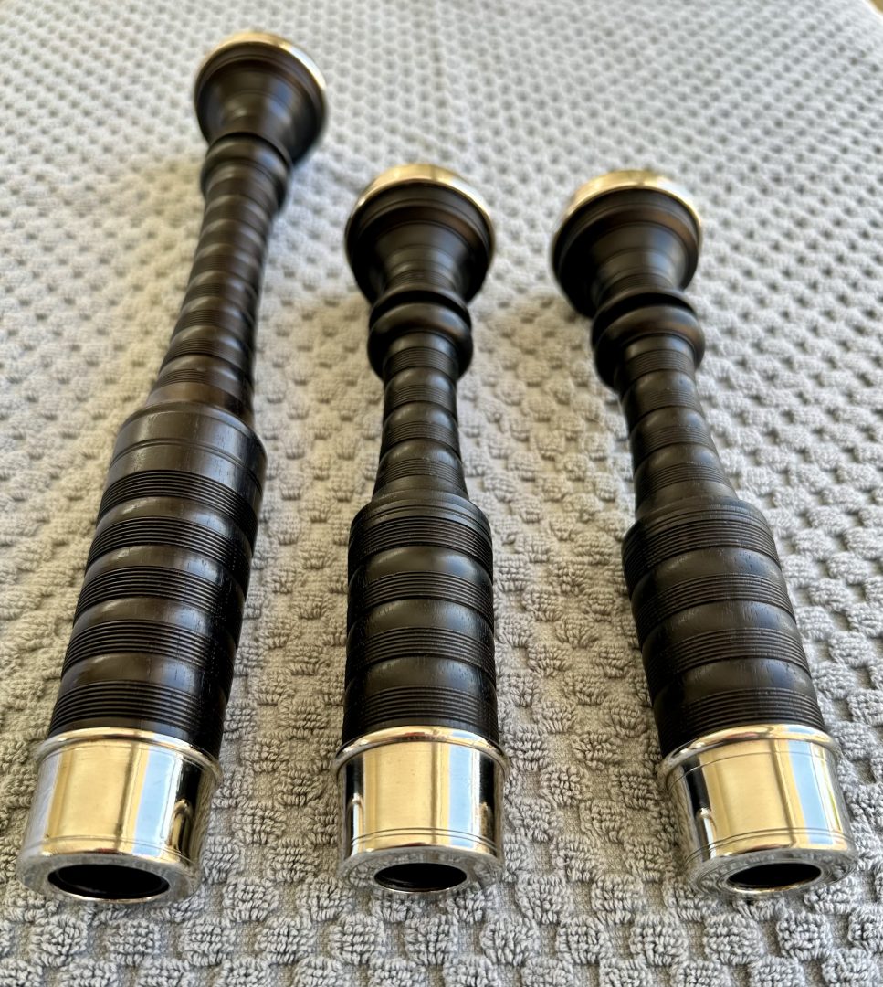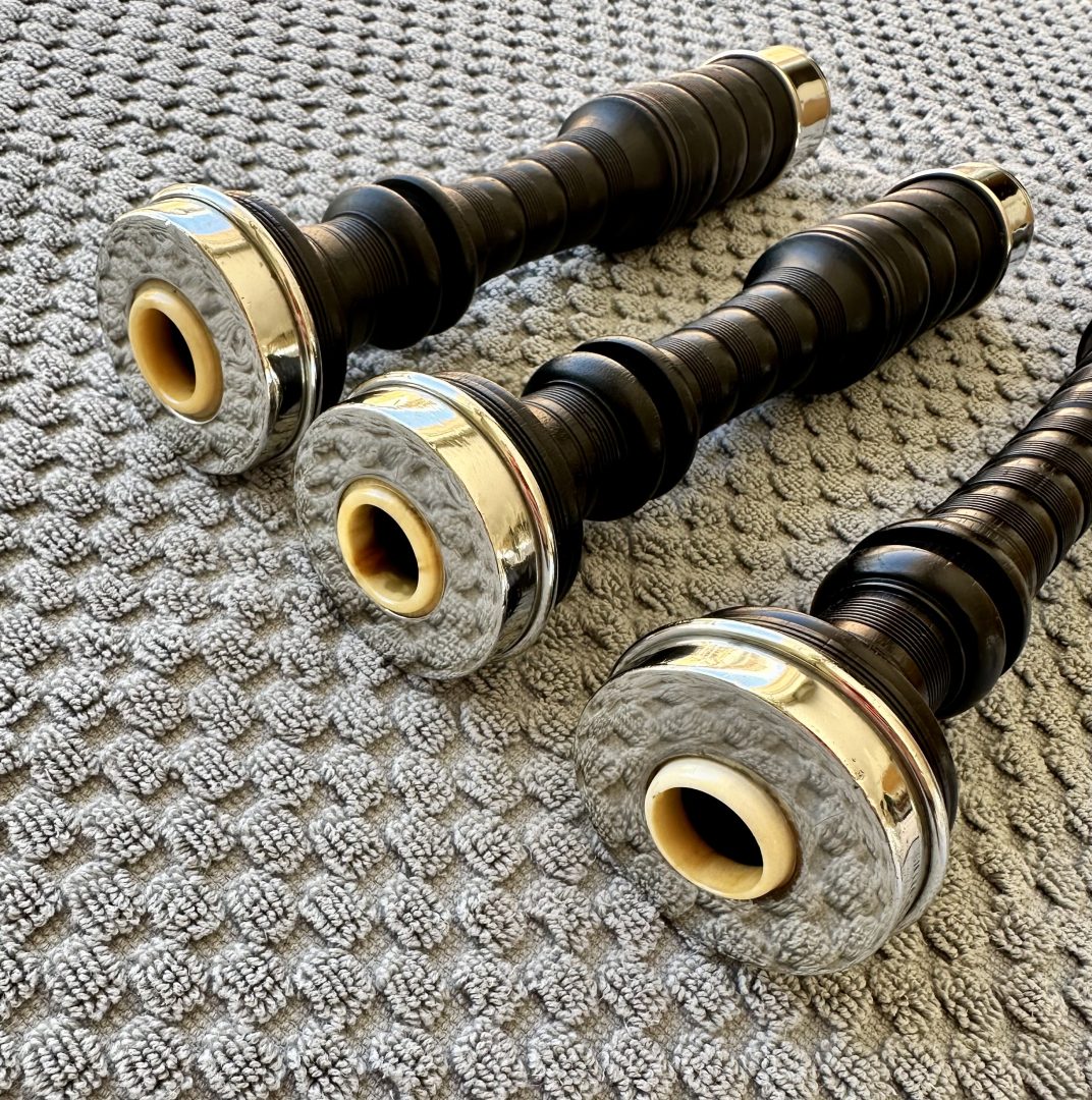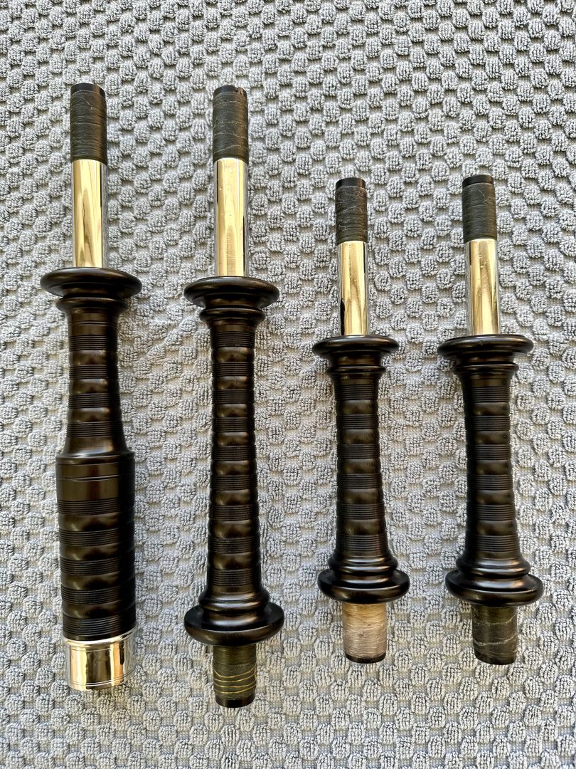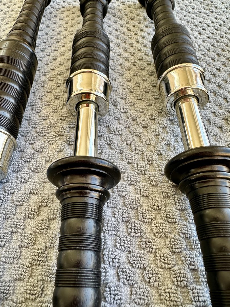 Ebony drones with beautiful wood mounts and nickel slides, ferrules and drone caps with ivory bushings. Stocks are from an older Lawrie set with straight-sided ferrules; 2 stocks are possibly Cocuswood. These are the Rolls Royce of the bagpiping world. Drones are issue free, a couple of repaired hairline cracks in 2 of the stocks. Absolutely airtight and in excellent overall condition. Stored in a humidified case when not in use. The set plays beautifully. They’re rich and vibrant and lock into tune right away. A classic set to be sure.