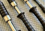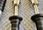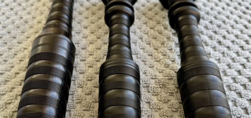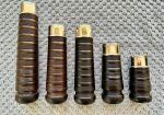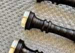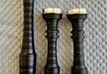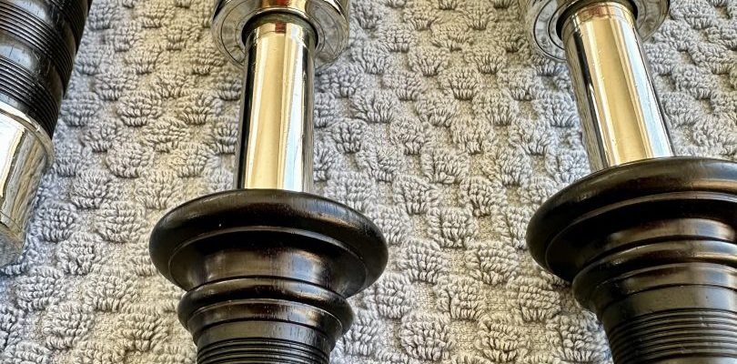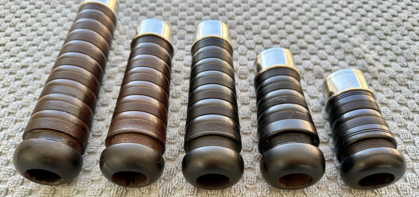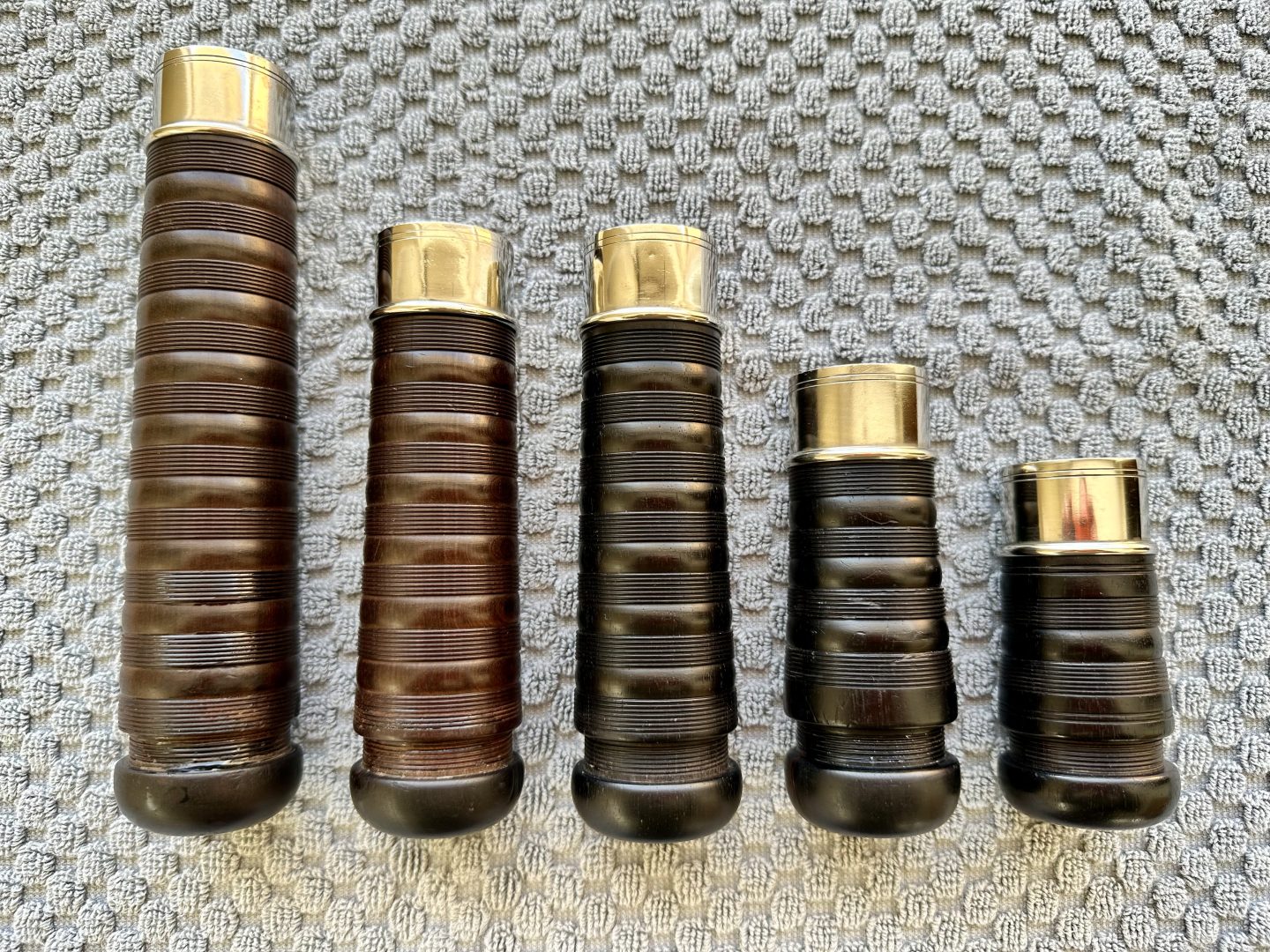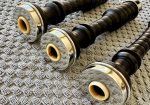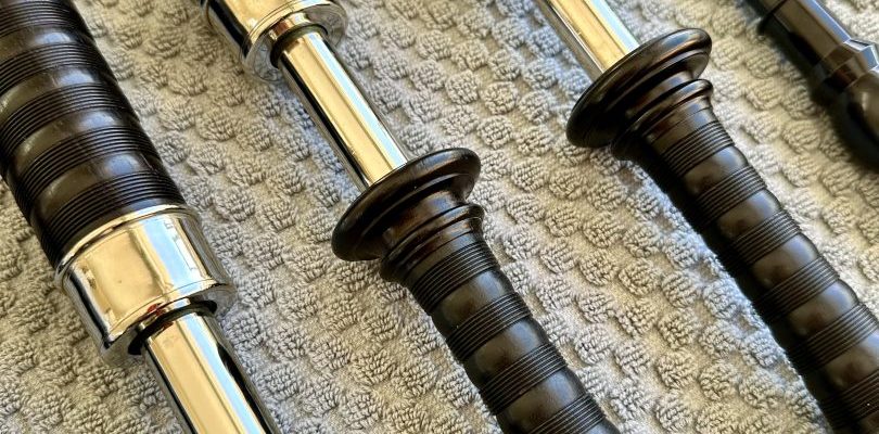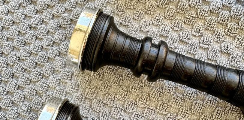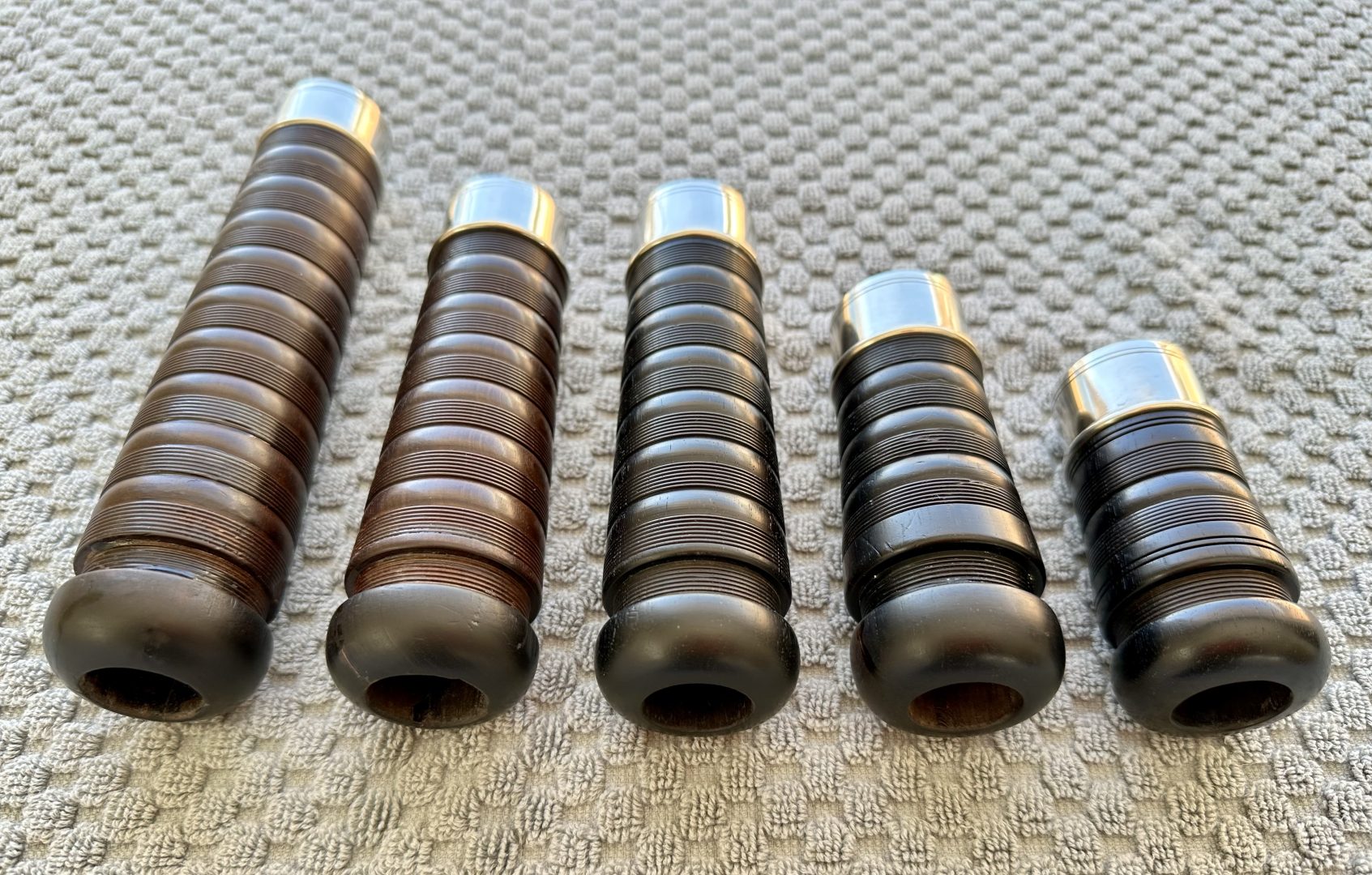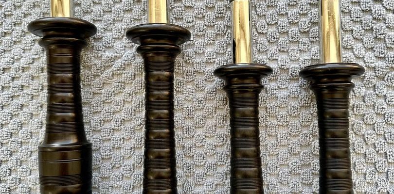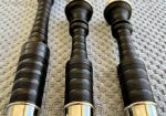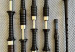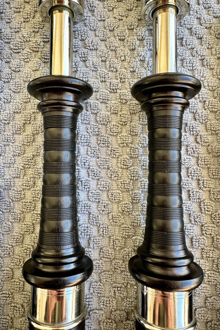 Ebony drones with beautiful wood mounts and nickel slides, ferrules and drone caps with ivory bushings. Stocks are from an older Lawrie set with straight-sided ferrules; 2 stocks are possibly Cocuswood. These are the Rolls Royce of the bagpiping world. Drones are issue free, a couple of repaired hairline cracks in 2 of the stocks. Absolutely airtight and in excellent overall condition. Stored in a humidified case when not in use. The set plays beautifully. They’re rich and vibrant and lock into tune right away. A classic set to be sure.