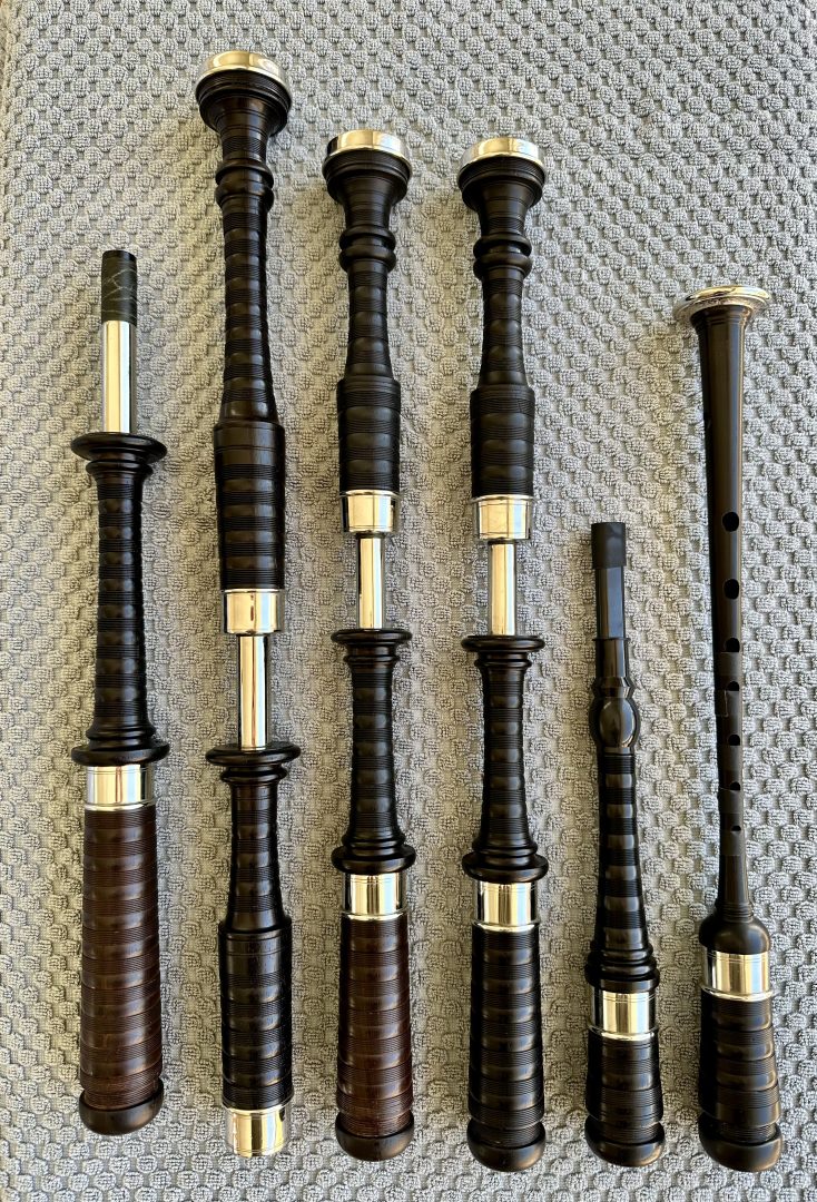Also included is a poly blowpipe split stock and tube trap along with an ABW McCallum McC2 solo chanter with engraved nickel sole. Blowpipe is an Airstream with built in valve.