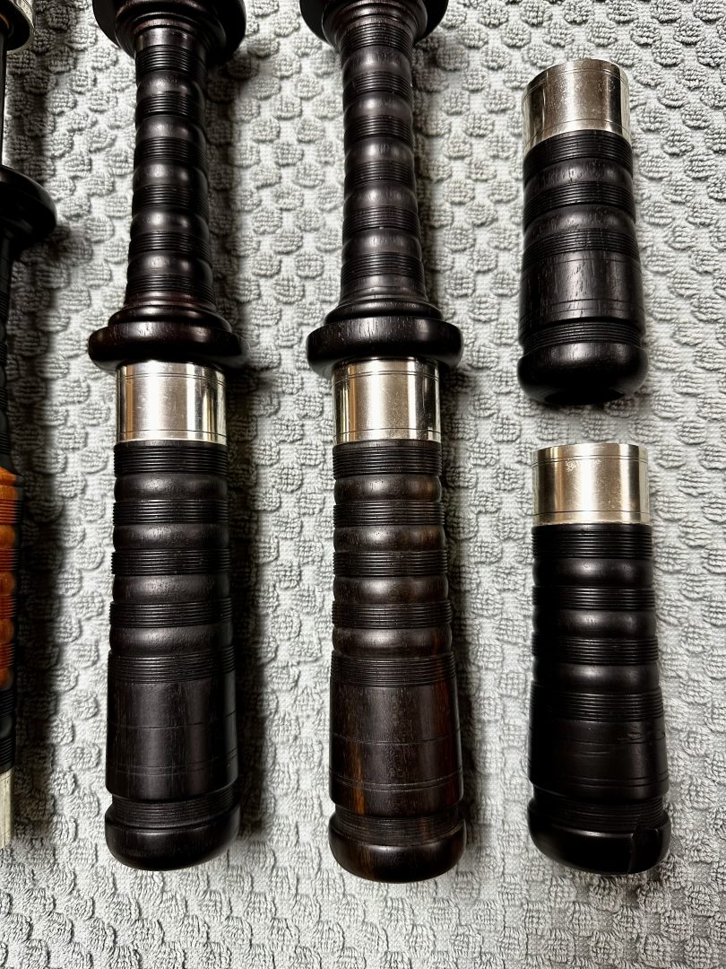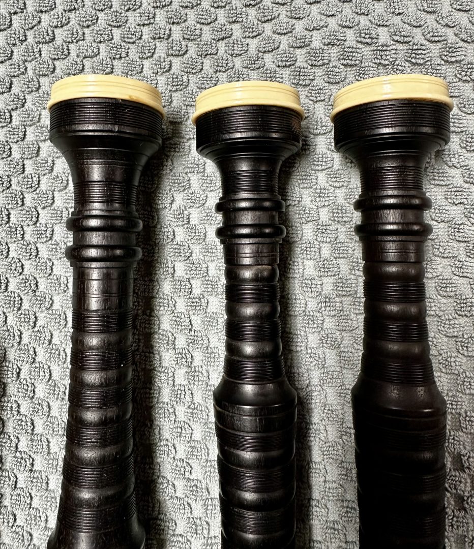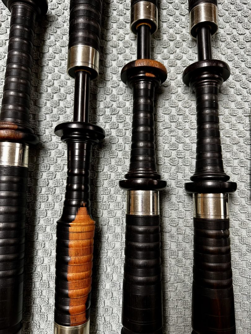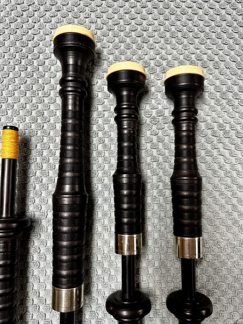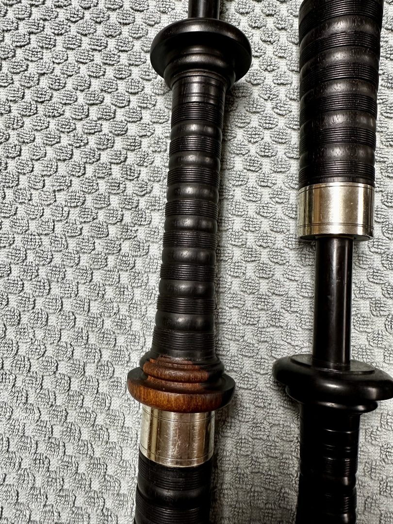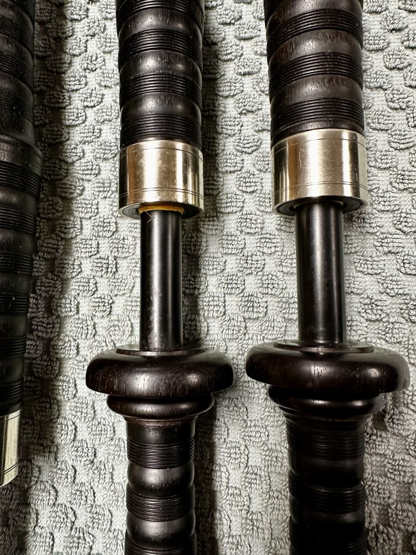 Beautiful 1930’s era Henry Stark bagpipe. Turned from African Blackwood with nickel ferrules and imitation caps. Purchased from Ross MacKenzie at Source Bagpipes over in Scotland. The set was refinished at some point in the past and the drone caps replaced with imitation ivory. I’ve not played these as I have another vintage set I’m keen on playing and so these are for sale. These have seen definite use over the decades and so are not pristine. A few hairline cracks were repaired and the condition of the wood, while still solid, has some great character.