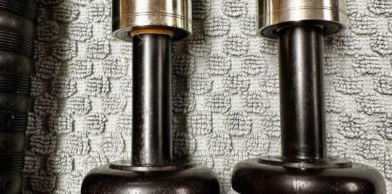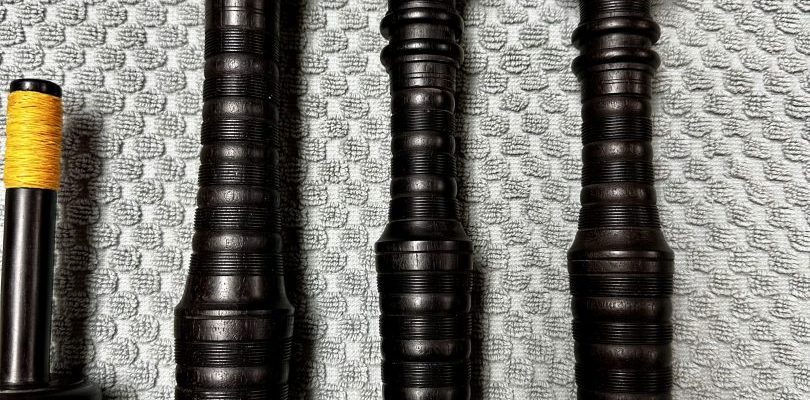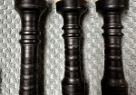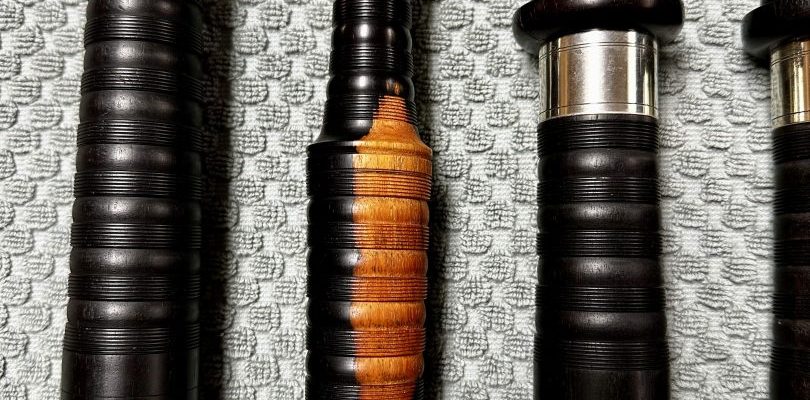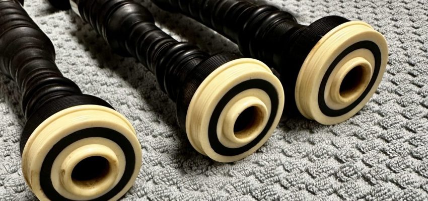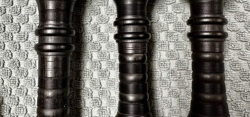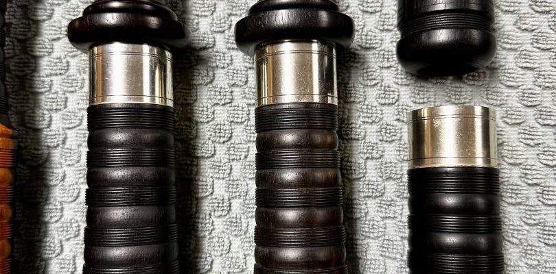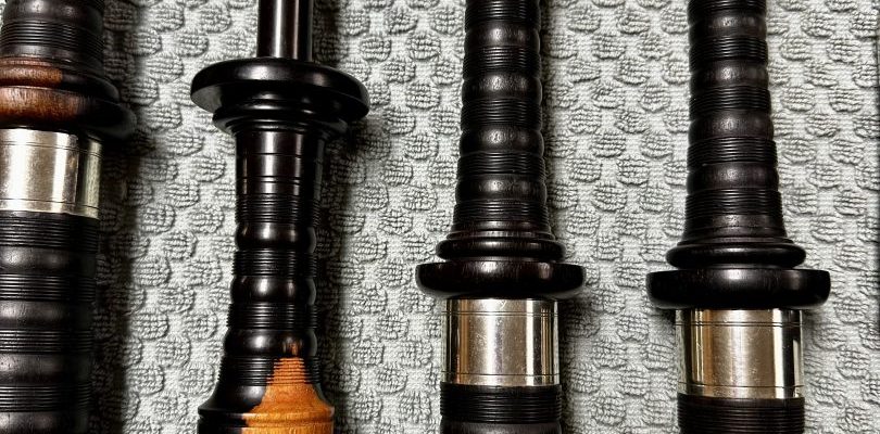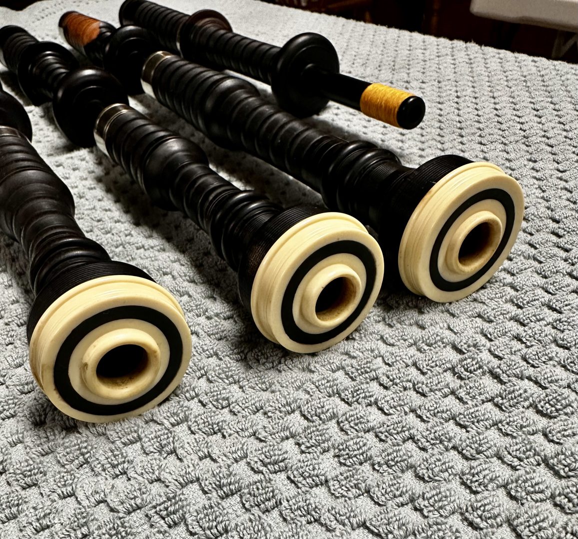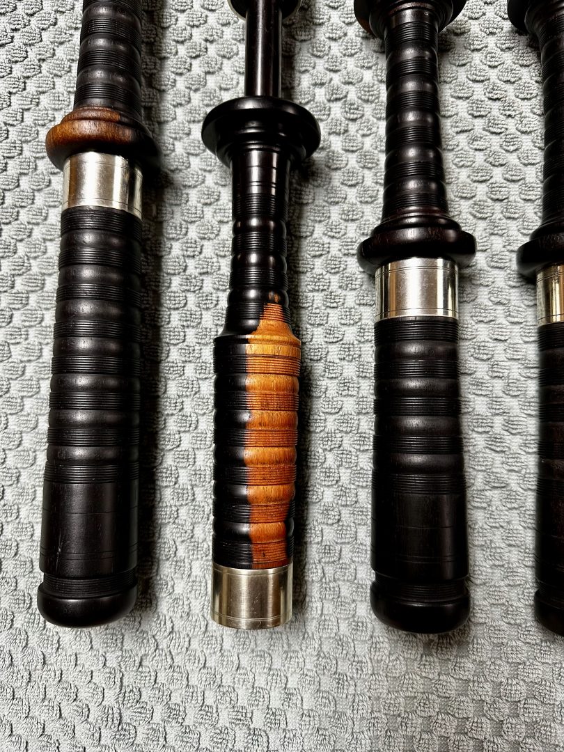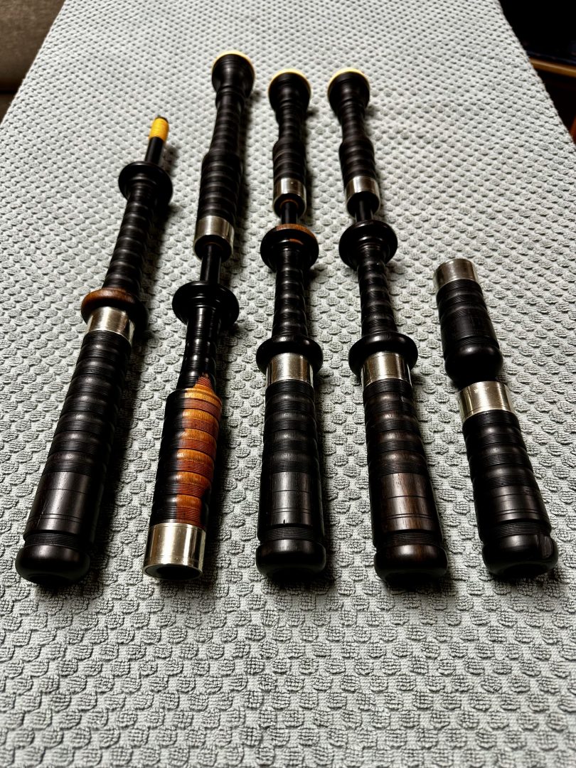 Beautiful 1930’s era Henry Stark bagpipe. Turned from African Blackwood with nickel ferrules and imitation caps. Purchased from Ross MacKenzie at Source Bagpipes over in Scotland. The set was refinished at some point in the past and the drone caps replaced with imitation ivory. I’ve not played these as I have another vintage set I’m keen on playing and so these are for sale. These have seen definite use over the decades and so are not pristine. A few hairline cracks were repaired and the condition of the wood, while still solid, has some great character.