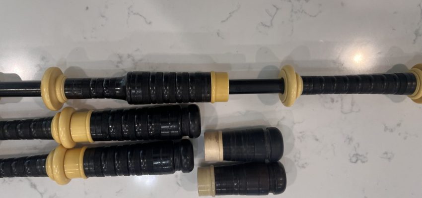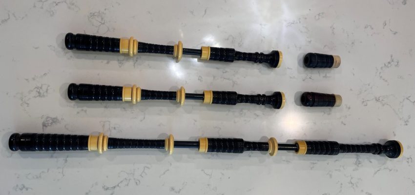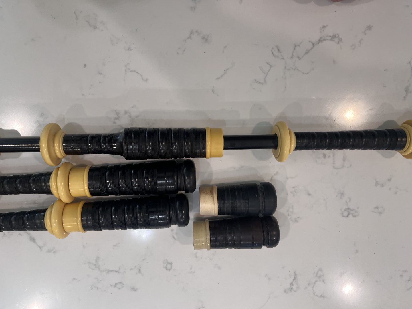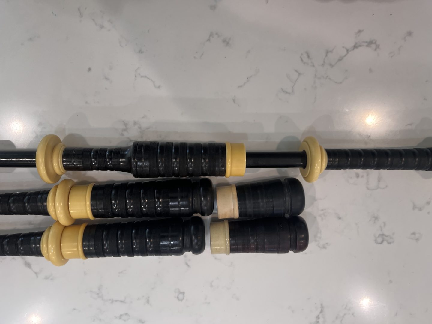 1940s Era Blackwood Lawrie’s. They have the celluloid like imitation ivory mounts and ivory bushes. No cracks in great playable shape. The chanter stock is a replacement and the blow pipe stock is a Poly replacement with a holly ferrule. Selling as stocks and sticks. No blow stick or chanter included. Buyer pays shipping. Check out my other pipes for sale.