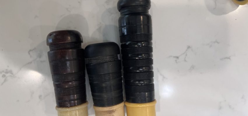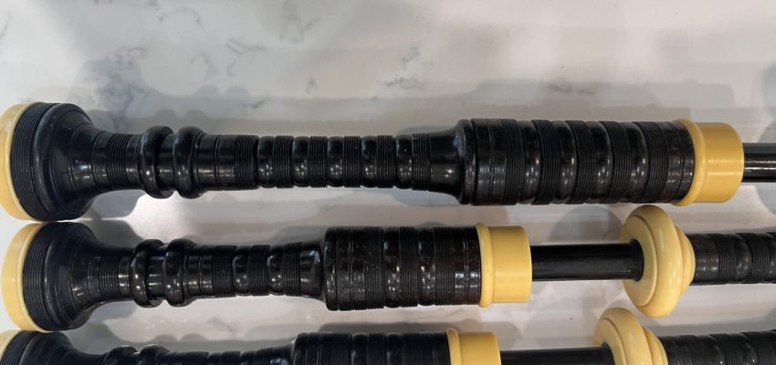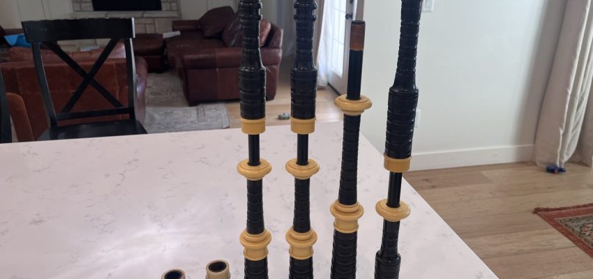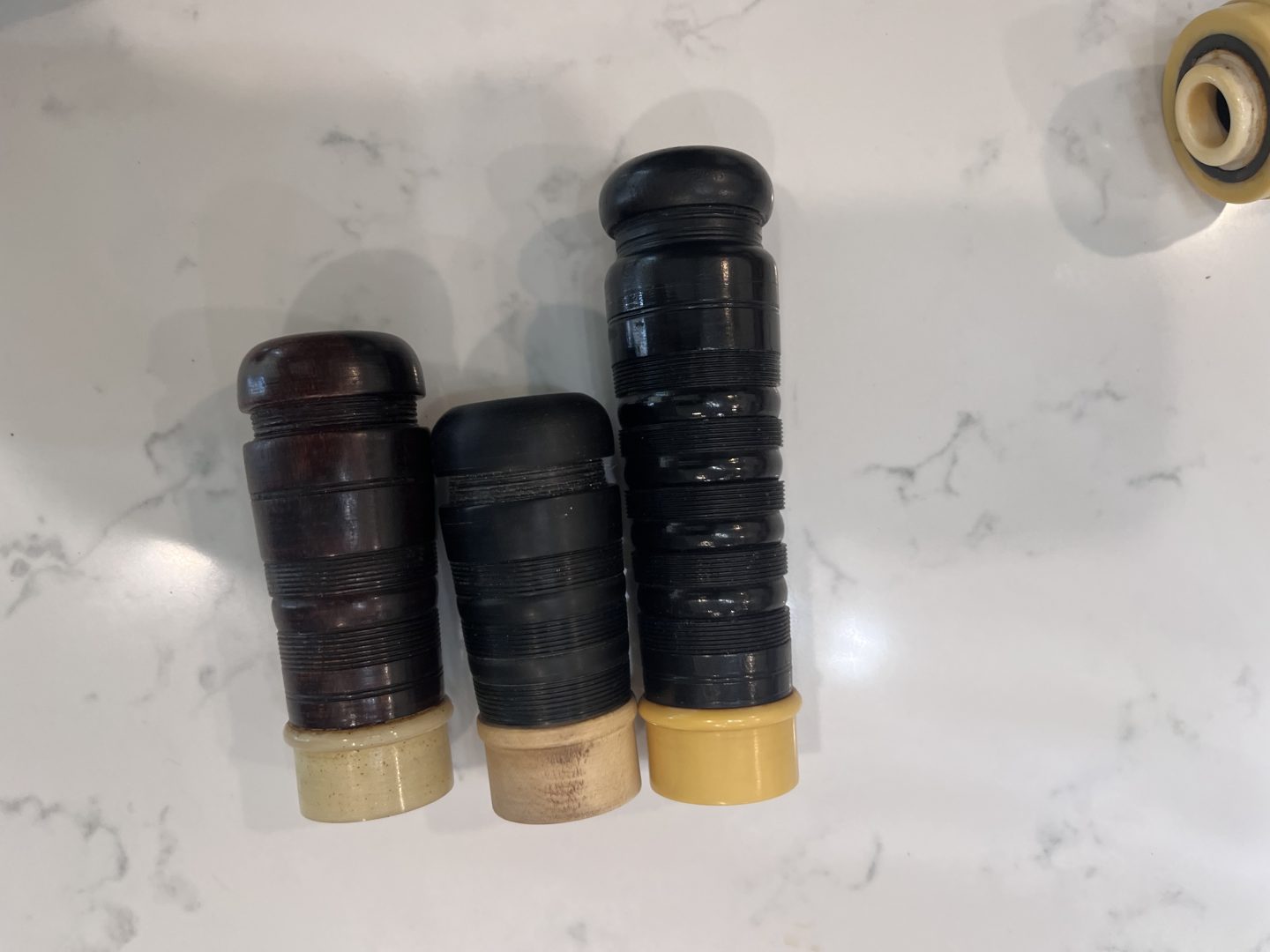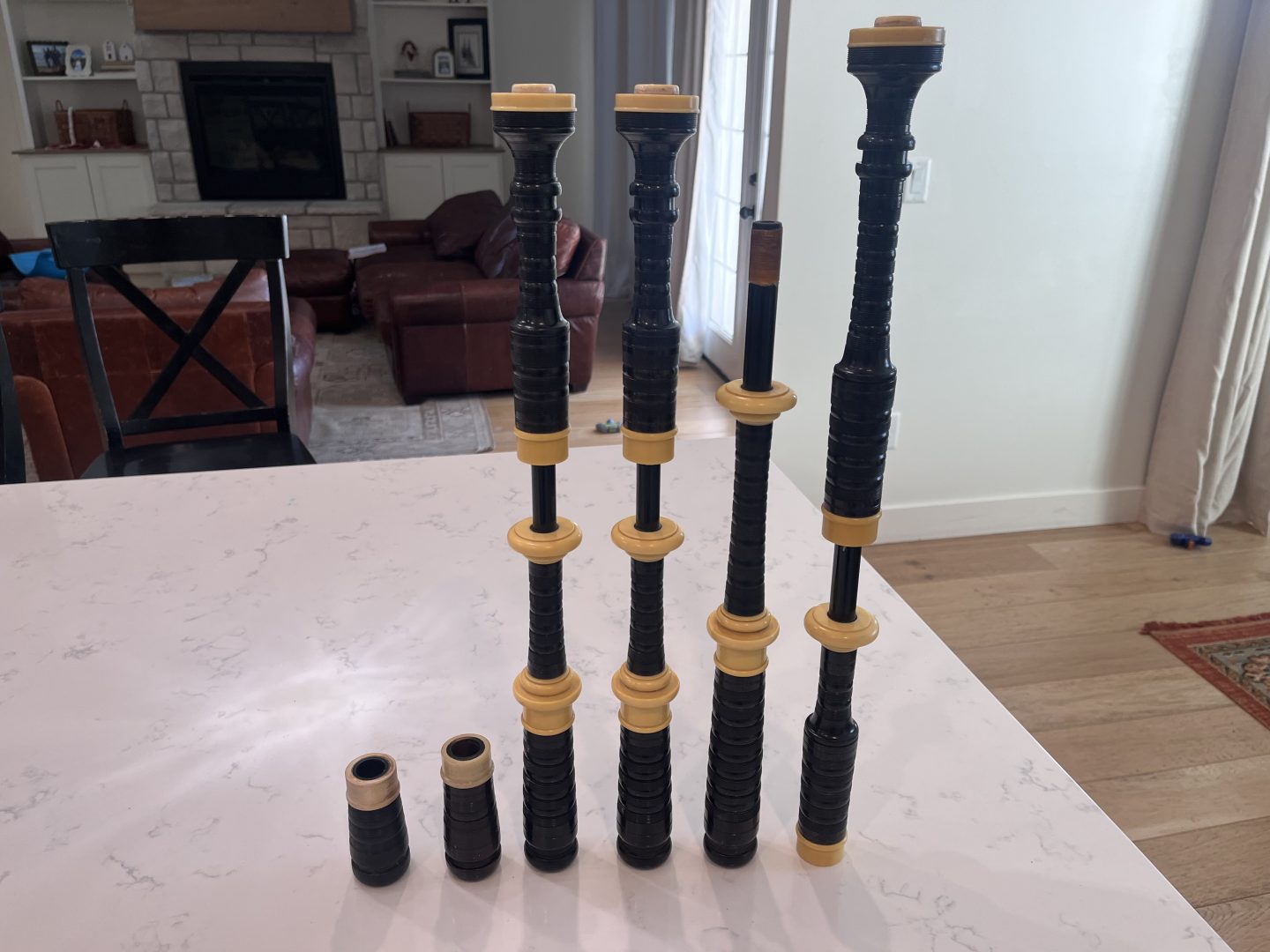 1940s Era Blackwood Lawrie’s. They have the celluloid like imitation ivory mounts and ivory bushes. No cracks in great playable shape. The chanter stock is a replacement and the blow pipe stock is a Poly replacement with a holly ferrule. Selling as stocks and sticks. No blow stick or chanter included. Buyer pays shipping. Check out my other pipes for sale.