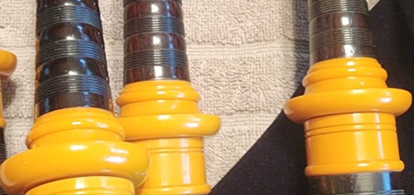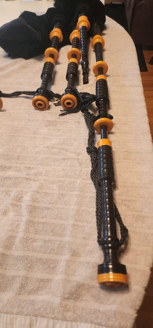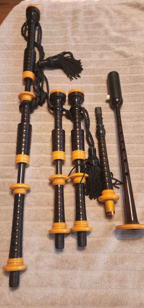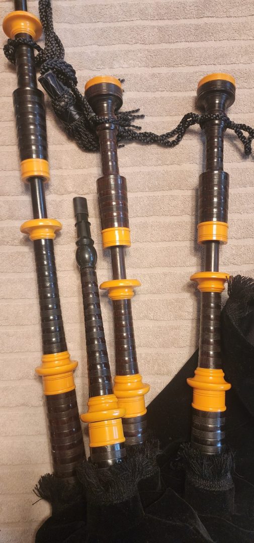 Immaculate set of 1962 grainger and Campbell fully refurbished in 2025 no cracks no warps or chips a beautiful set true bores oiled and re hemped original chanter is like brand new brand new synthetic canmore bag ready to play drone tone is full and rich with my cane reeds paypal excepted buyer pays shipping UPS email me with any questions and more pictures