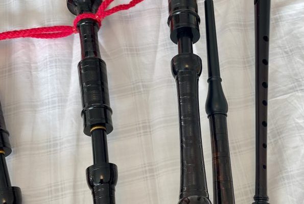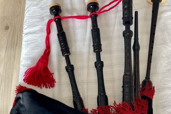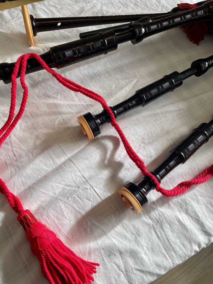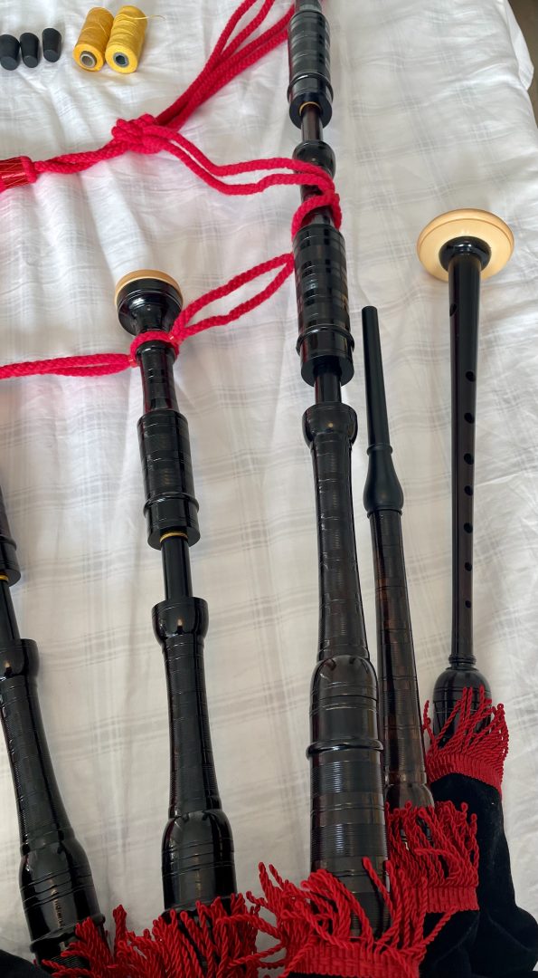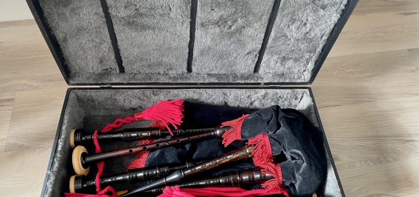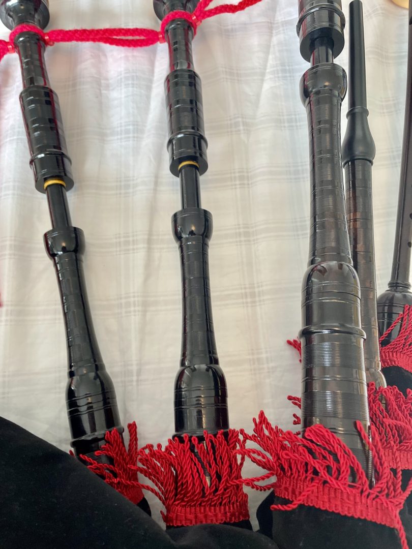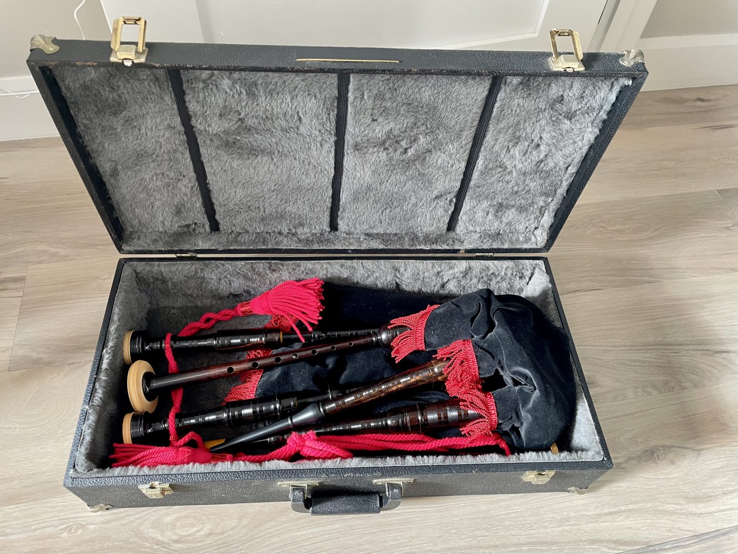 In great condition, please find this 1970’s era Hardie bagpipe, complete with the original chanter. Flat combed with wood button mounts. No cracks anywhere. Really gorgeous wood grain. Light weight, and no worries crossing borders with the set. Make a fantastic student bagpipe as well. Complete with Bannatyne medium bottom zipper bagpipe bag, airtight, cover, cords, new Ezeedrone reeds, and supplies. Hard case is available for free if you pick the set up, or for an extra $45 Canadian to ship it with the pipes. $900 Canadian including shipping and insurance in Canada. For my American friends, add $100 Canadian for your tariff and I can ship to you, for a total of $1000 Canadian (about $725 US).