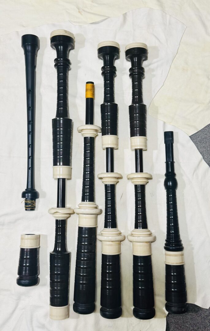 31 year old set of D. Naill African Blackwood and imitation ivory pipes were purchase from D.Naill Scotland in July of 1994 and arrived as a gift from my mother for my 9th birthday. These pipes have played many gigs, marches, competitions and band rehearsals. They have been well loved and taken care of. In my teenage years they were tossed about and chipped some imitation ivory. But, no cracks or leaks. They have been a wonderful set of bagpipes but it’s time to let them go to someone who is going to love and play them. Right now they sit in a pelican case for safe keeping and to keep the dust away from them . Asking $1100 OBO “BUYER PAYS SHIPPING outside of USA”.