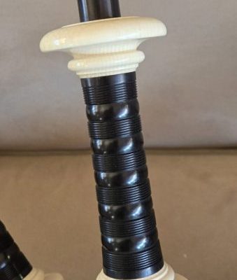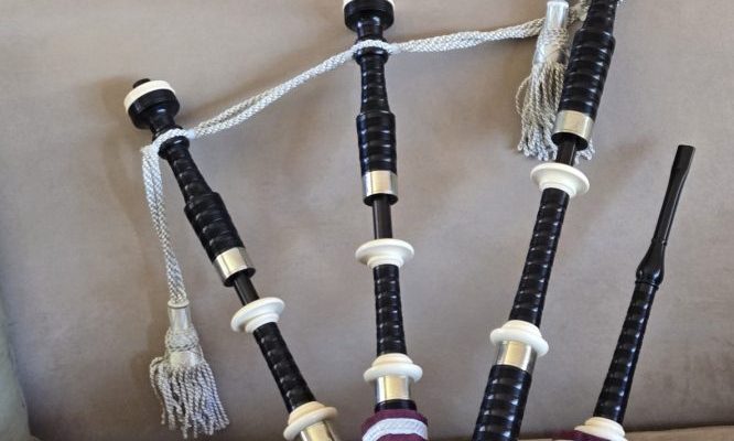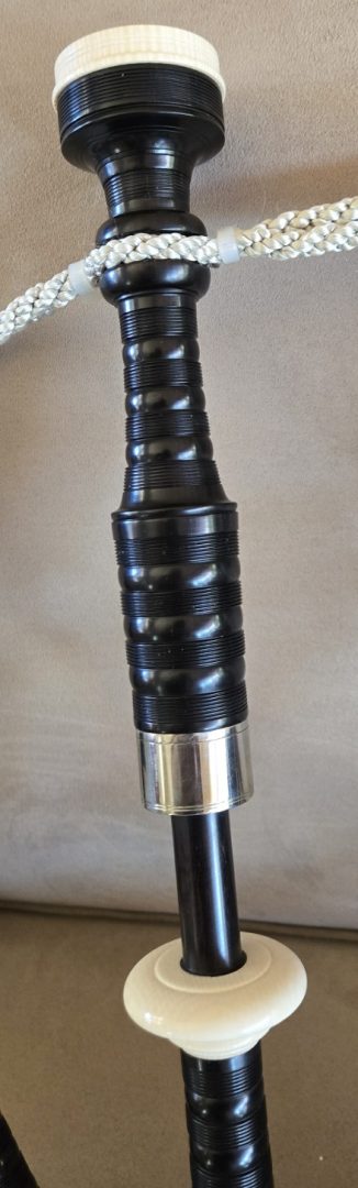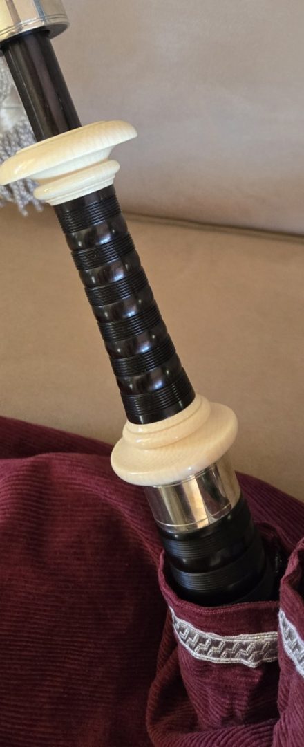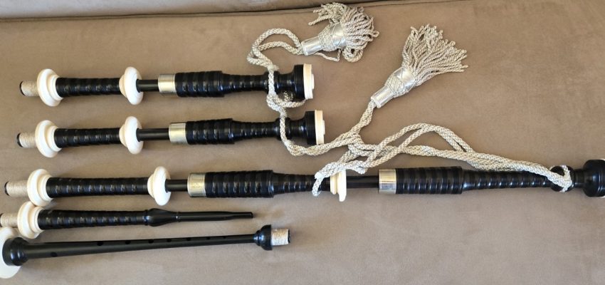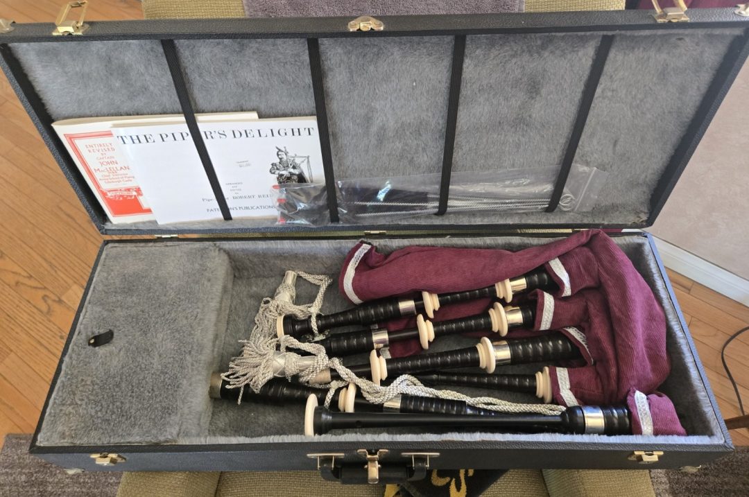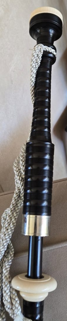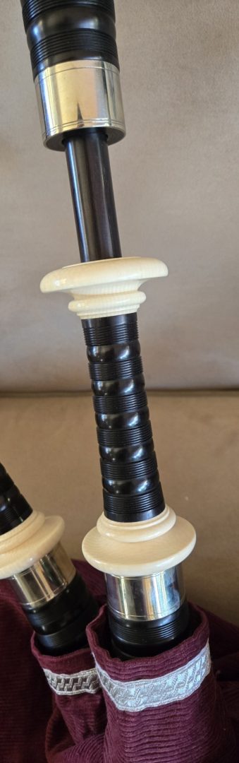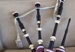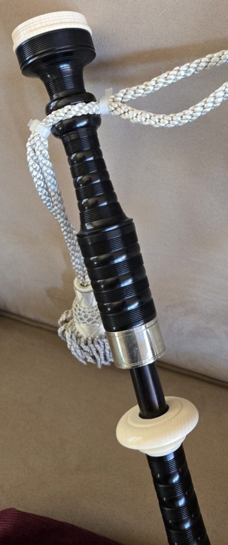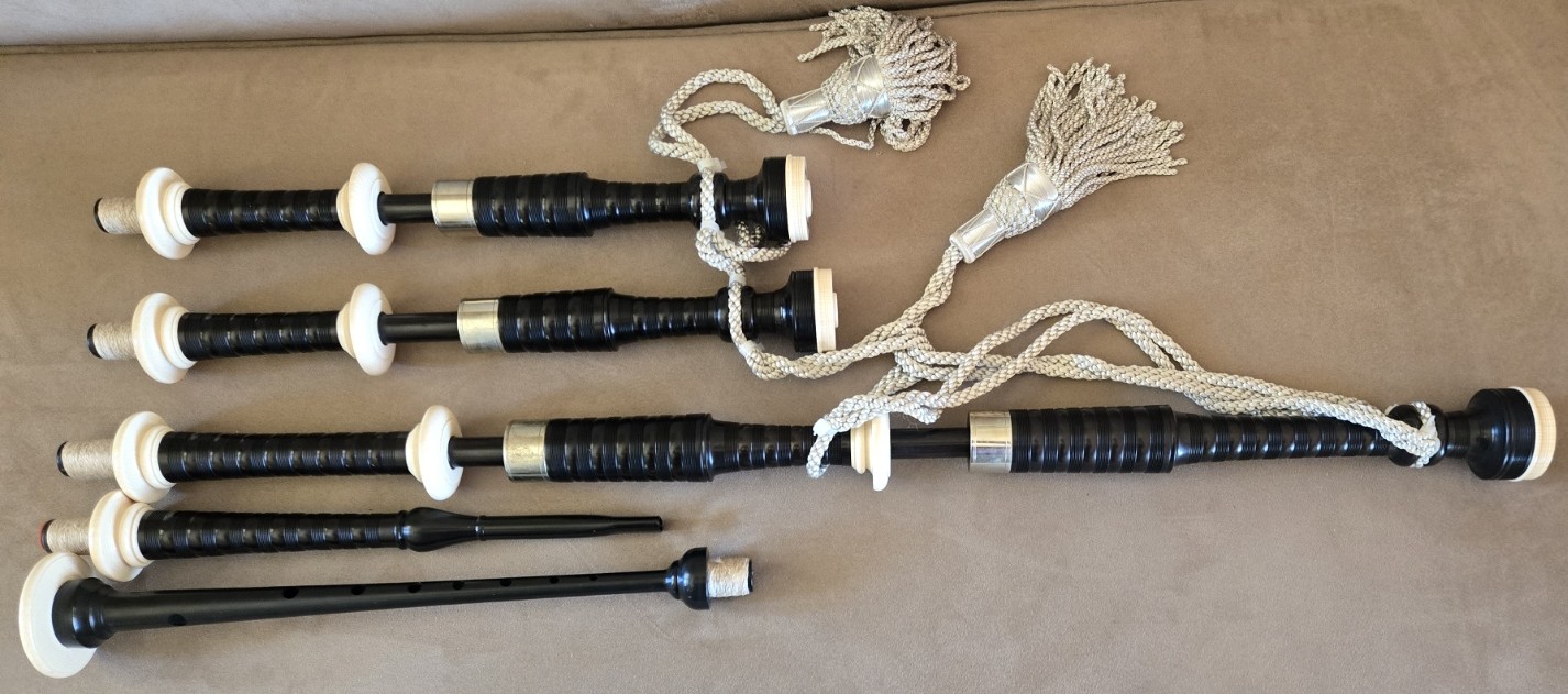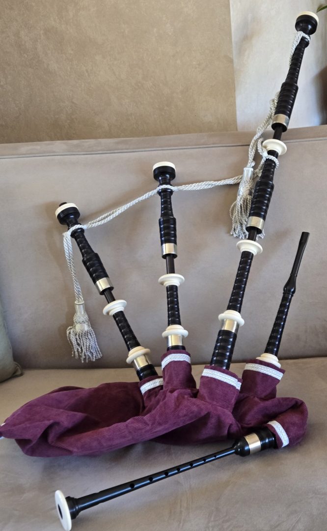 I am offering this mint 2025 set of Ronnie Hein RH03 bagpipes made of African Blackwood with imitation ivory mounts and nickel ferrules. The last pic is the drones before he turned them on the lathe. Ronnie is an amazing prize winning piper at several competitions in Scotland and elsewhere, as well as pipe maker. His customer service is amazing and his pipe bores are based on 1910 Hendersons. The imitation ivory has grain like real ivory. I bought these pipes new in late 2025 and have not played them other than to try out drone reeds a few times. Turns out after not having played pipes for over 30 years, I am no longer able to handle full size pipes. I would like to sell or trade for a set of smallpipes or parlor pipes such as Gibson Fireside pipes or maybe McCallum Folk Pipes. I prefer cocobolo Gibsons or blackwood McCallums. These pipes come with accessories and a pipe major hard shell case. The bag is a Canmore medium zipper bag. I bought the pipes as sticks and stocks, and got the bag from a piper who tried it and decided to step down to an extended small bag. There are a couple of tutor books with it, and cleaning brushes as well as some extra accessories such as a set of Ezeedrone reeds and a set of new cane reeds. You can watch Matt Willis’ review of Hein pipes on YouTube; he thoroughly recommends them. These are a premium set of pipes for new and advanced pipers. They can be picked up in Ventura California or they can be shipped. I will pay shipping in the U.S.