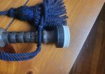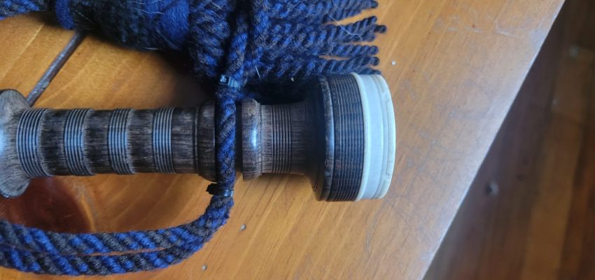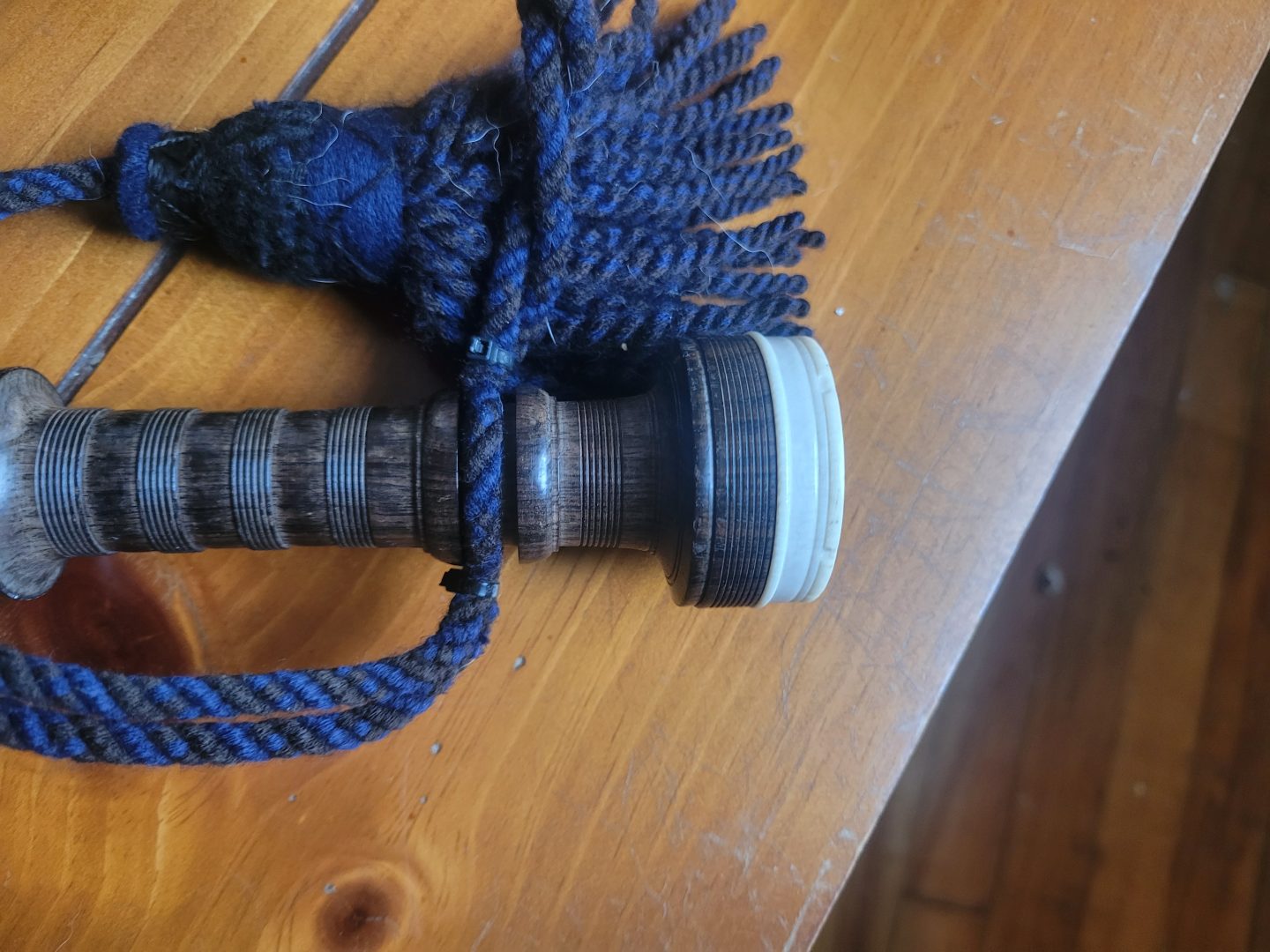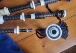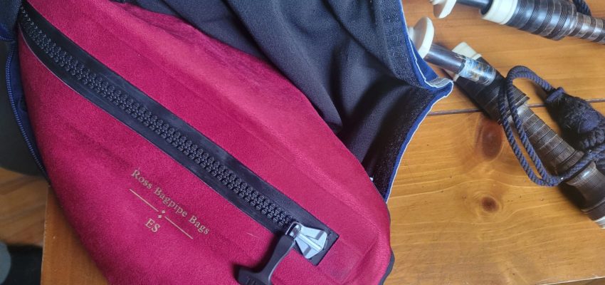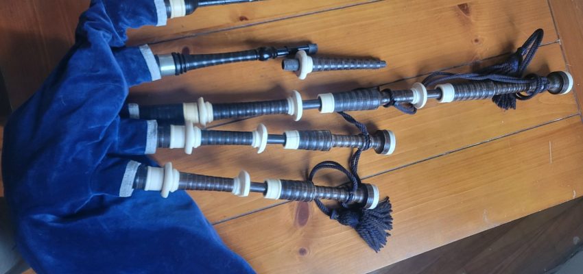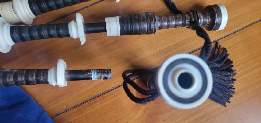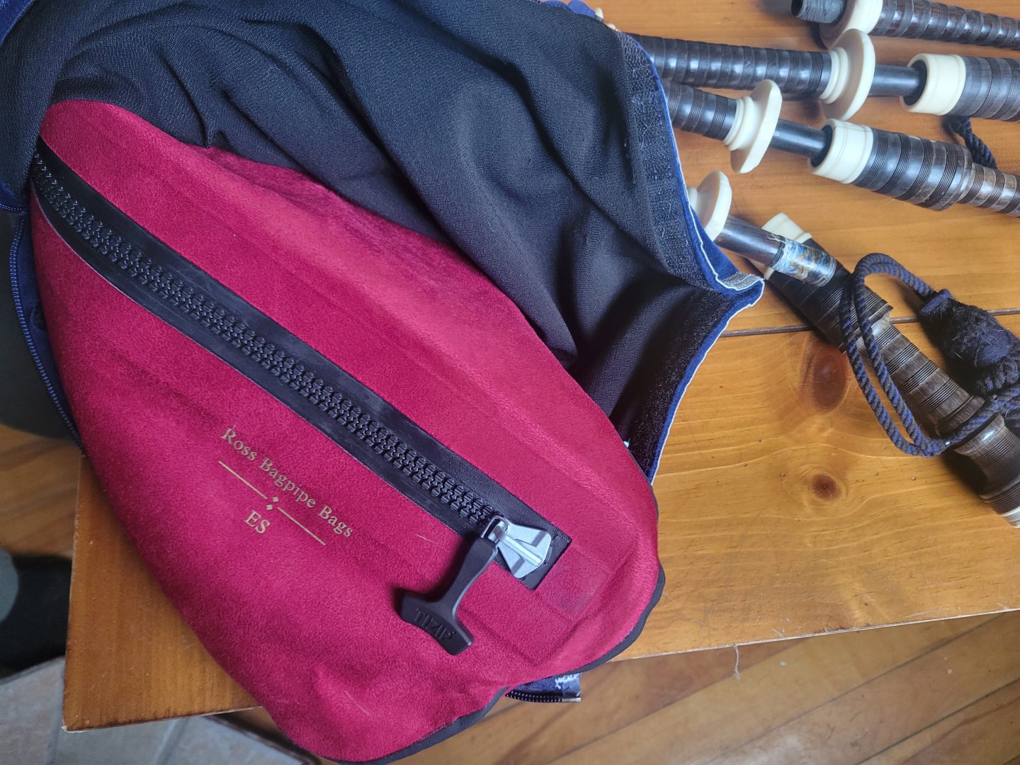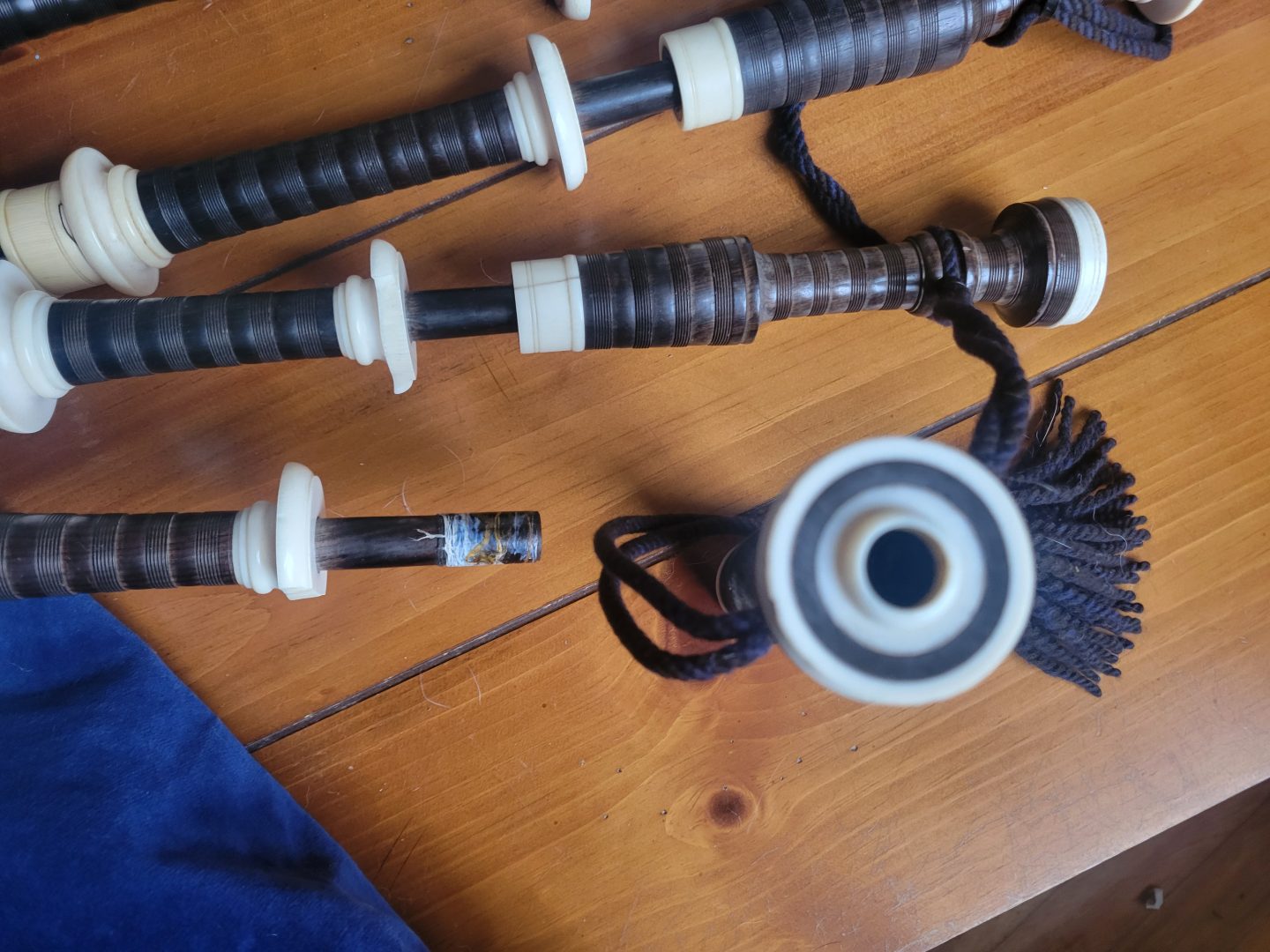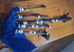 A solid, sweet drone sound played at high level for years. Bores are true. Ivory has a crack and acouple of broken pieces you will see in pic.Brand new Ross extended small bag. RJM chanter. I believe these are Hardies.