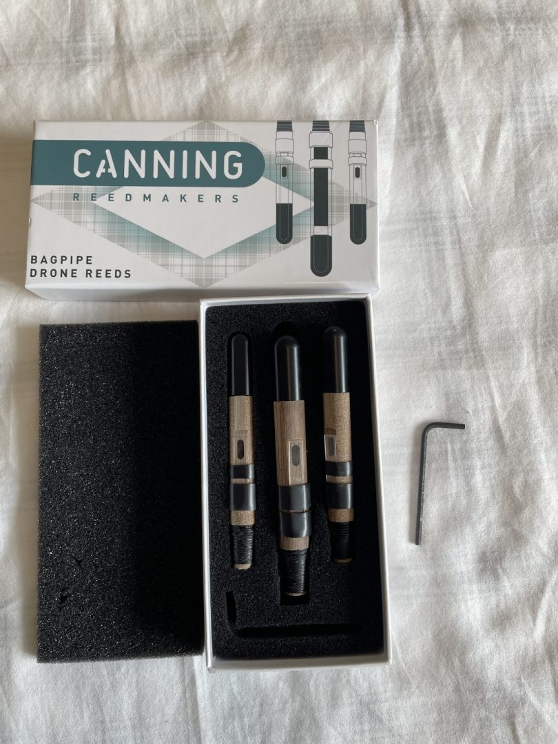 As new set of Canning drone reeds with polycarbonate bass. Came with a set of bagpipes, but I already have the same set, so a second is not needed. Fantastic sounding, easy to set up, and seem to strike in with ease. Compare vs. new pricing, and this set will have no taxes, shipping or tariffs. $90 Canadian including shipping in Canada. To my American friends, I can not ship to the U.S. at this time, unless you have family/friends on the Canadian side of the border.
