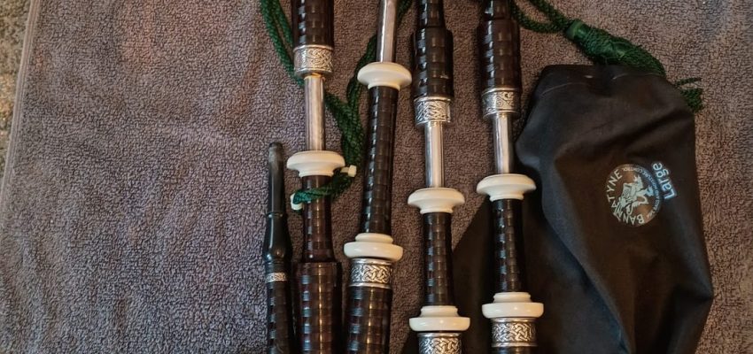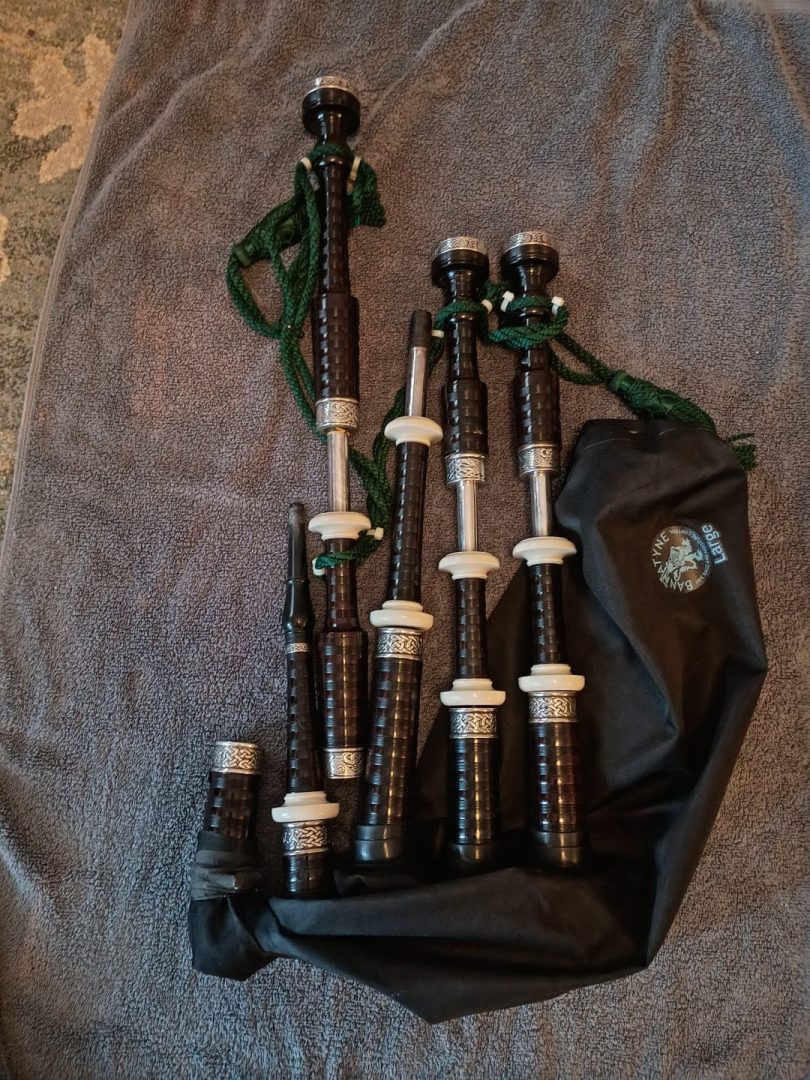 No chanter, pipes have no cracks or splits, immaculate condition.