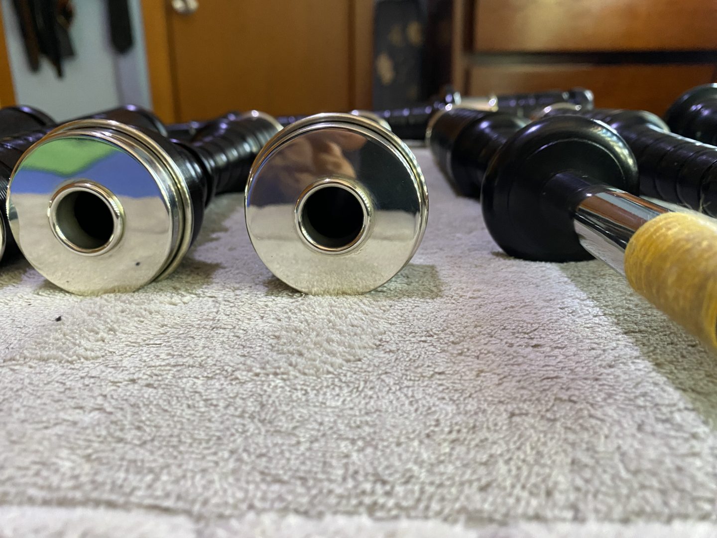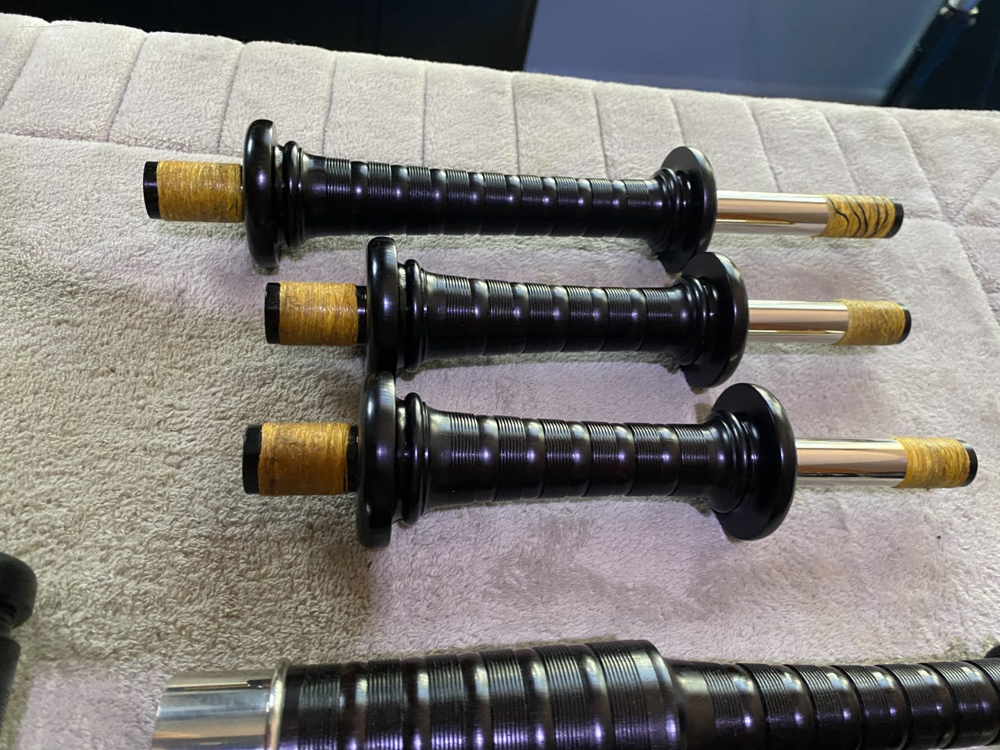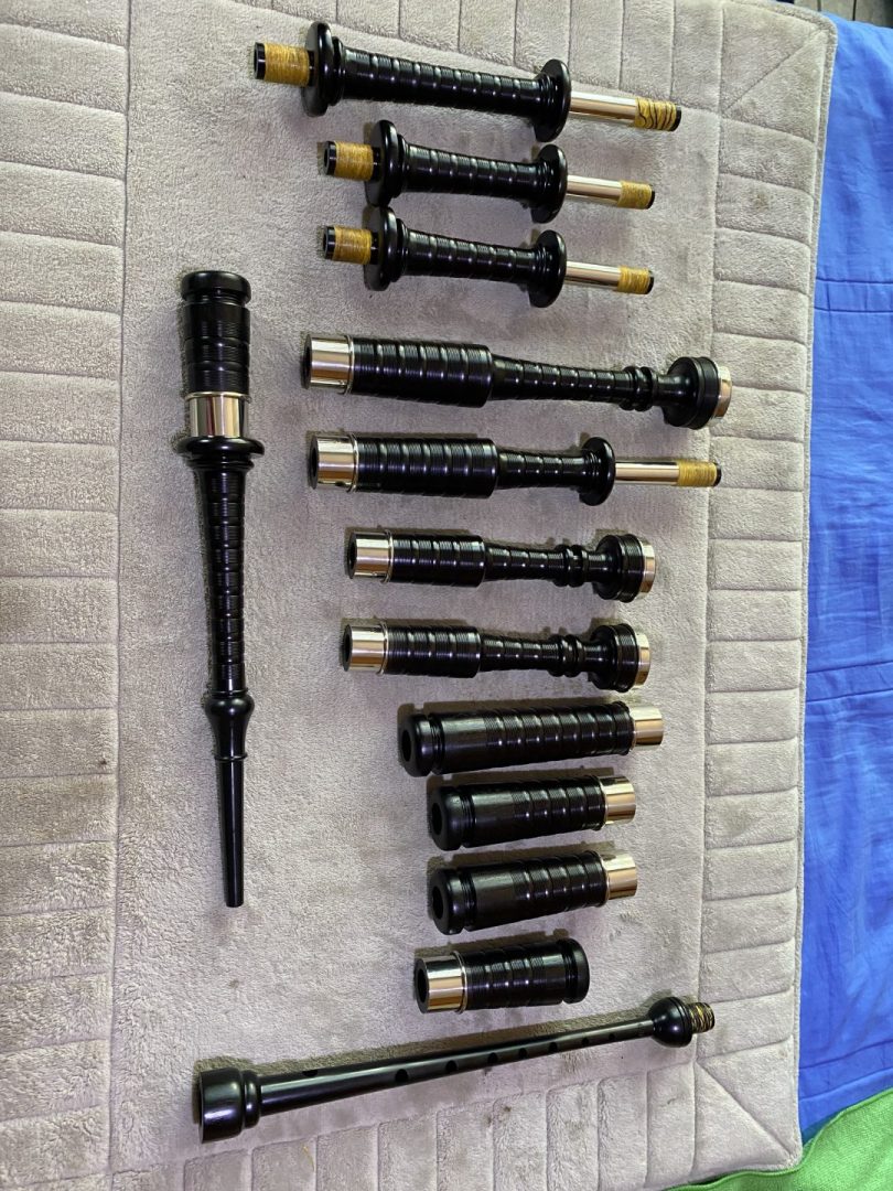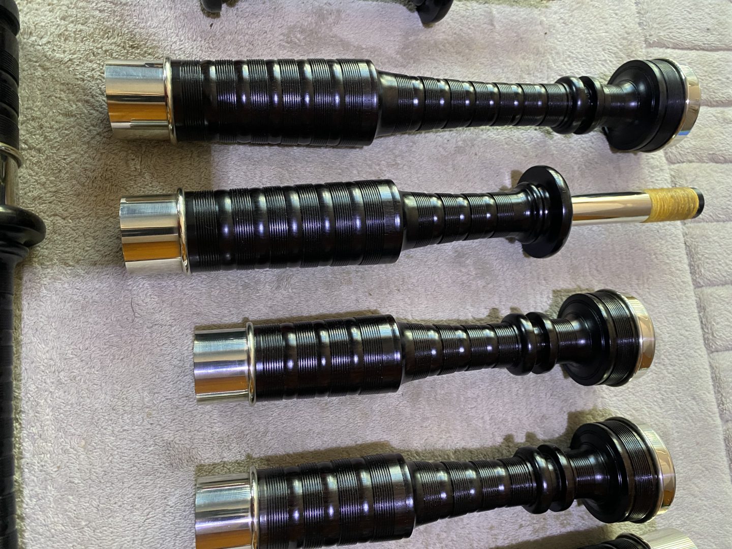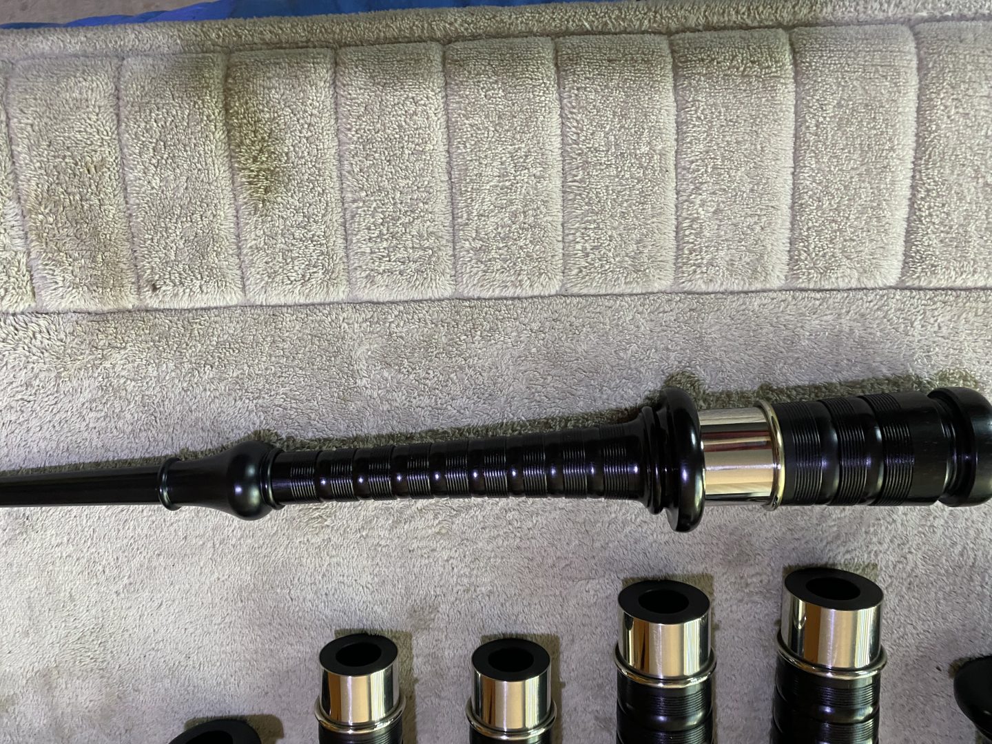 Selling this DN2 AB is pristine condition. I’m the originail owner. The pipes have only been played indoors and well taken care of. The original blowpipe and blowstock stock were never used. The pipes have been recently oiled and the metal fittings polished. No cracks, no warping. I’m throwing either a blackwood Shepherd or Infinity chanter plus a full set of Kinnaird Evolution reeds in excellent condition.