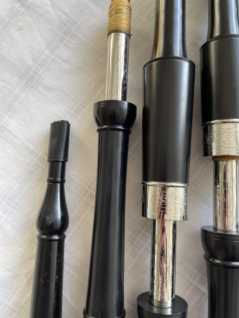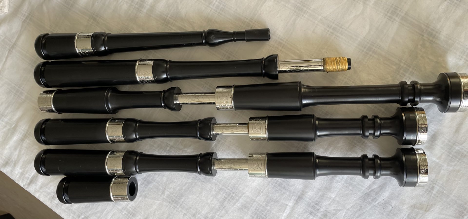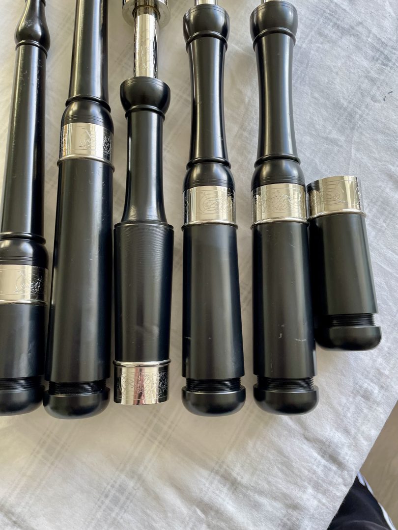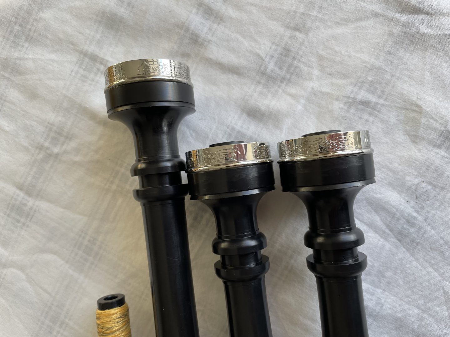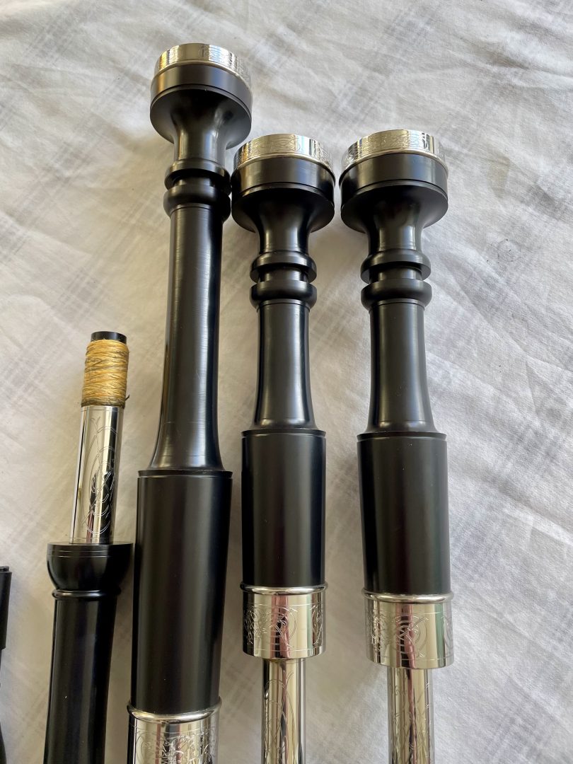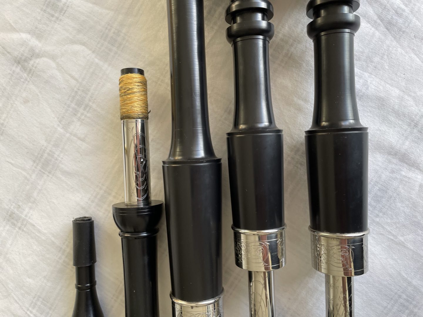 Beautiful and great sounding Derek Marr made polypenco bagpipes. No beading and combing, with engraved nickel ferrules, tuning slides, and caps. Pattern is zoomorphic. Threaded drone reed seats. The set is easy to reed, locks in really well, and has a big sound. Complete with an unaltered Dunbar Elite 1 polypenco chanter. This would be a fantastic all weather set, for band play, or travel, which was why I purchased the set. For me, the weight was a tad much for this 140 lb frame, but otherwise, one of the best poly sets I’ve played. $900 Canadian including shipping and insurance in Canada for sticks, stocks, blowpipe and chanter. If you’d like the bagpipe set up as shown with cover, cords, medium bannatyne bag, ezeedrone reeds, and supplies, $1100 Canadian shipped. For my American friends, we have to add your tariff to the price. For sticks, stocks, blowpipe and chanter: $900 Canadian + $100 for the tariff (tax) = $1000 Canadian, or about $720 US. Set up: $1100 + $150 for the tariff = $1250 Canadian shipped, or about $900 US. If you are local to me, a free case is available. Great bagpipe by an excellent maker and player