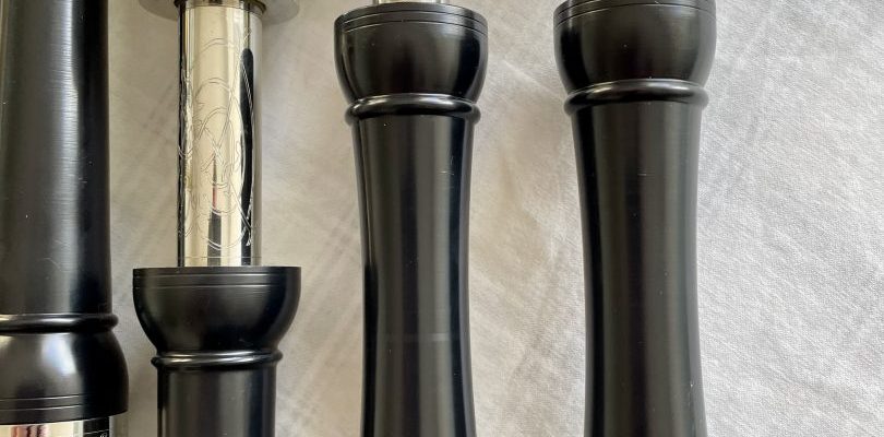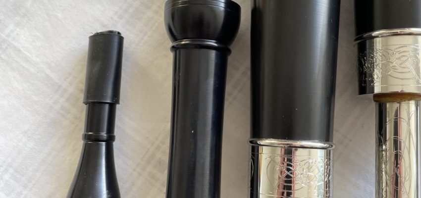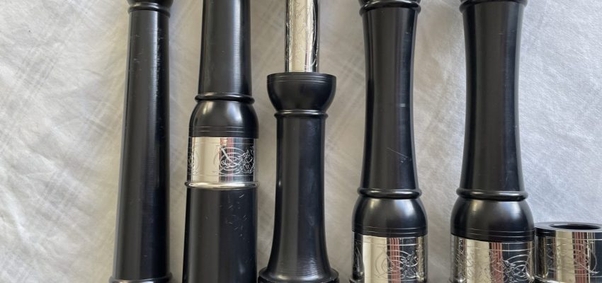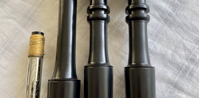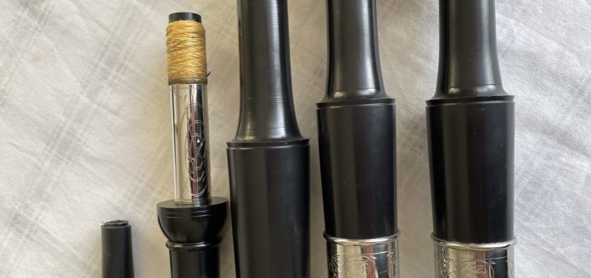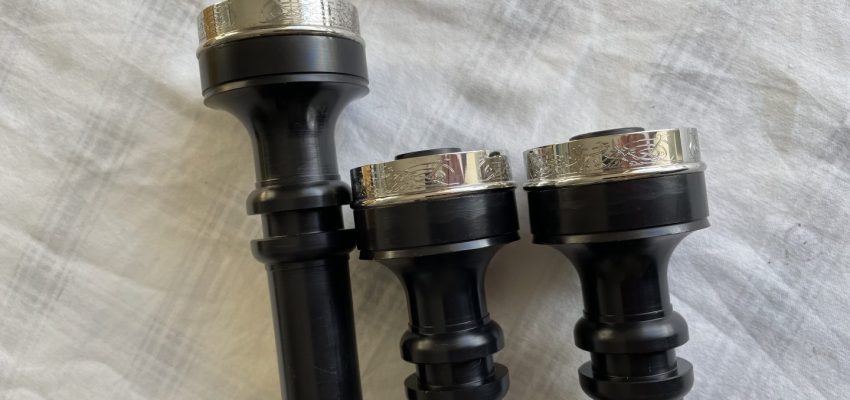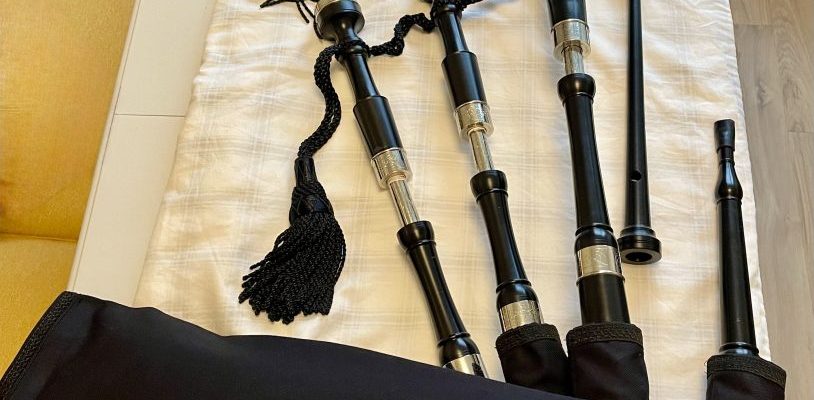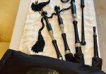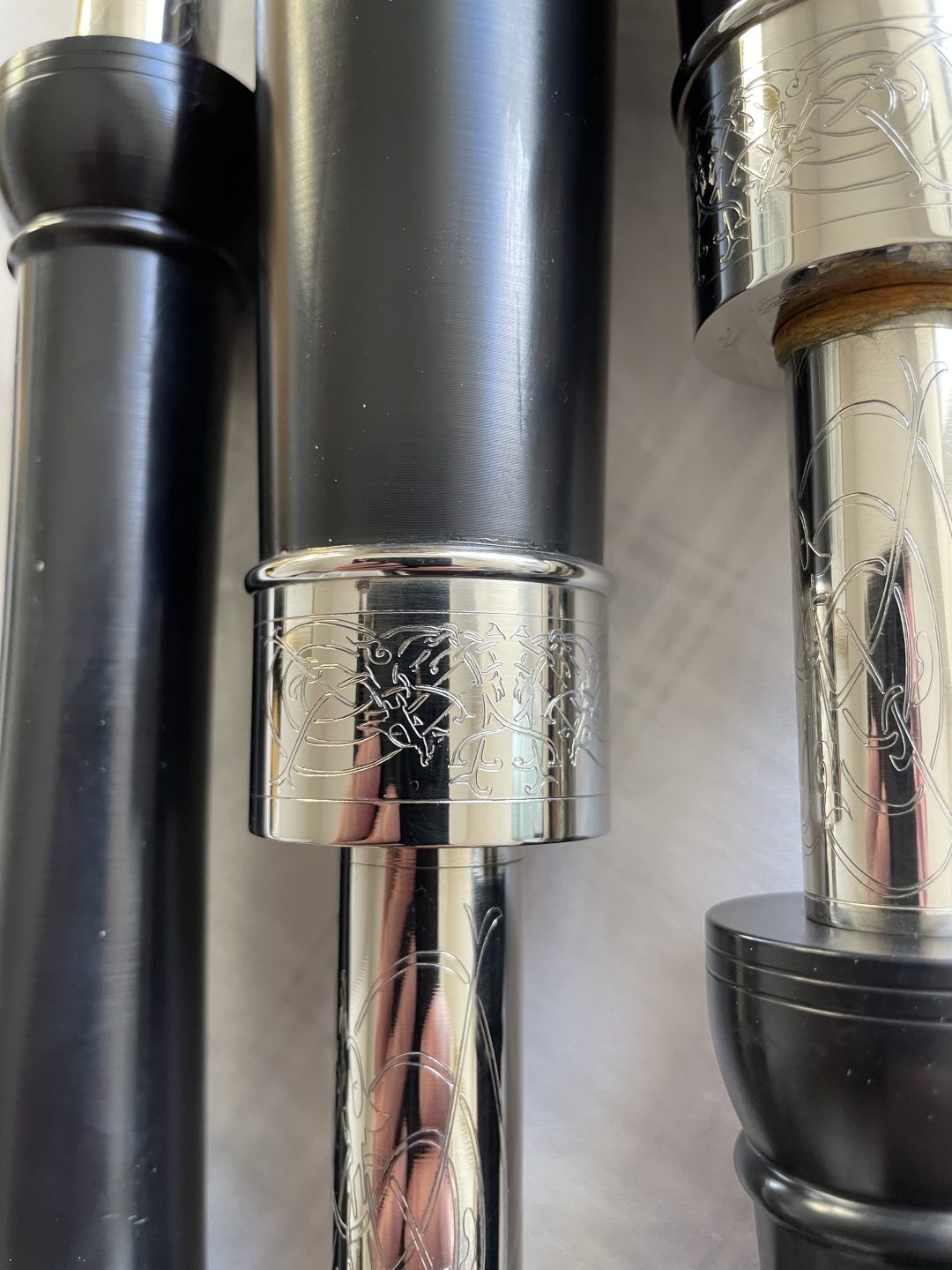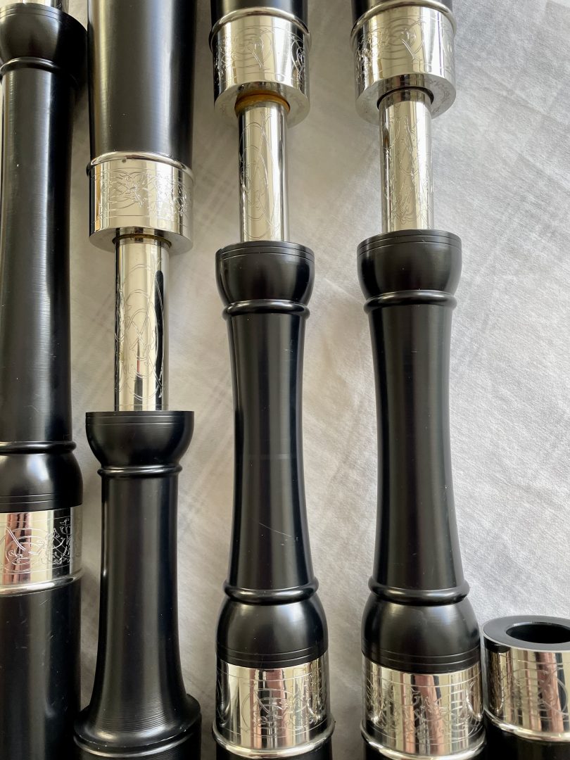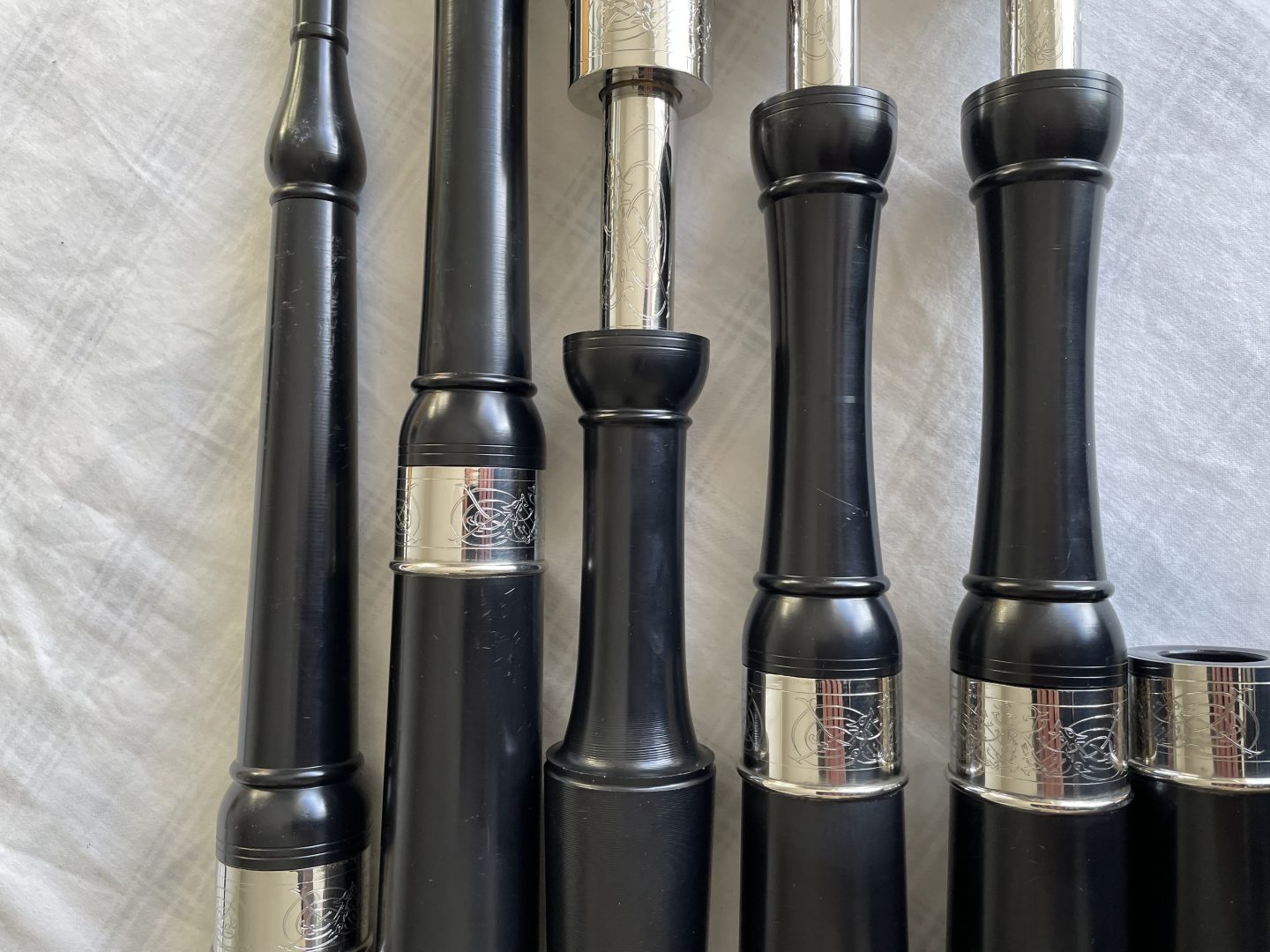 Beautiful and great sounding Derek Marr made polypenco bagpipes. No beading and combing, with engraved nickel ferrules, tuning slides, and caps. Pattern is zoomorphic. Threaded drone reed seats. The set is easy to reed, locks in really well, and has a big sound. Complete with an unaltered Dunbar Elite 1 polypenco chanter. This would be a fantastic all weather set, for band play, or travel, which was why I purchased the set. For me, the weight was a tad much for this 140 lb frame, but otherwise, one of the best poly sets I’ve played. $900 Canadian including shipping and insurance in Canada for sticks, stocks, blowpipe and chanter. If you’d like the bagpipe set up as shown with cover, cords, medium bannatyne bag, ezeedrone reeds, and supplies, $1100 Canadian shipped. For my American friends, we have to add your tariff to the price. For sticks, stocks, blowpipe and chanter: $900 Canadian + $100 for the tariff (tax) = $1000 Canadian, or about $720 US. Set up: $1100 + $150 for the tariff = $1250 Canadian shipped, or about $900 US. If you are local to me, a free case is available. Great bagpipe by an excellent maker and player