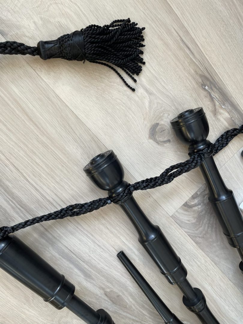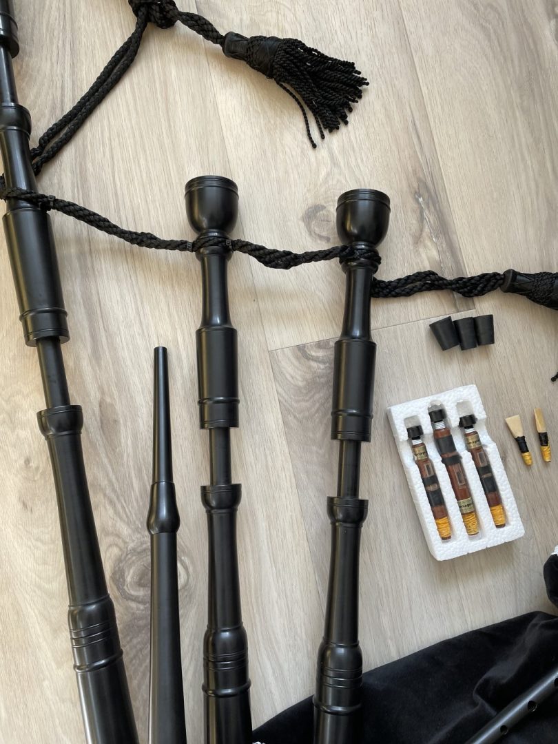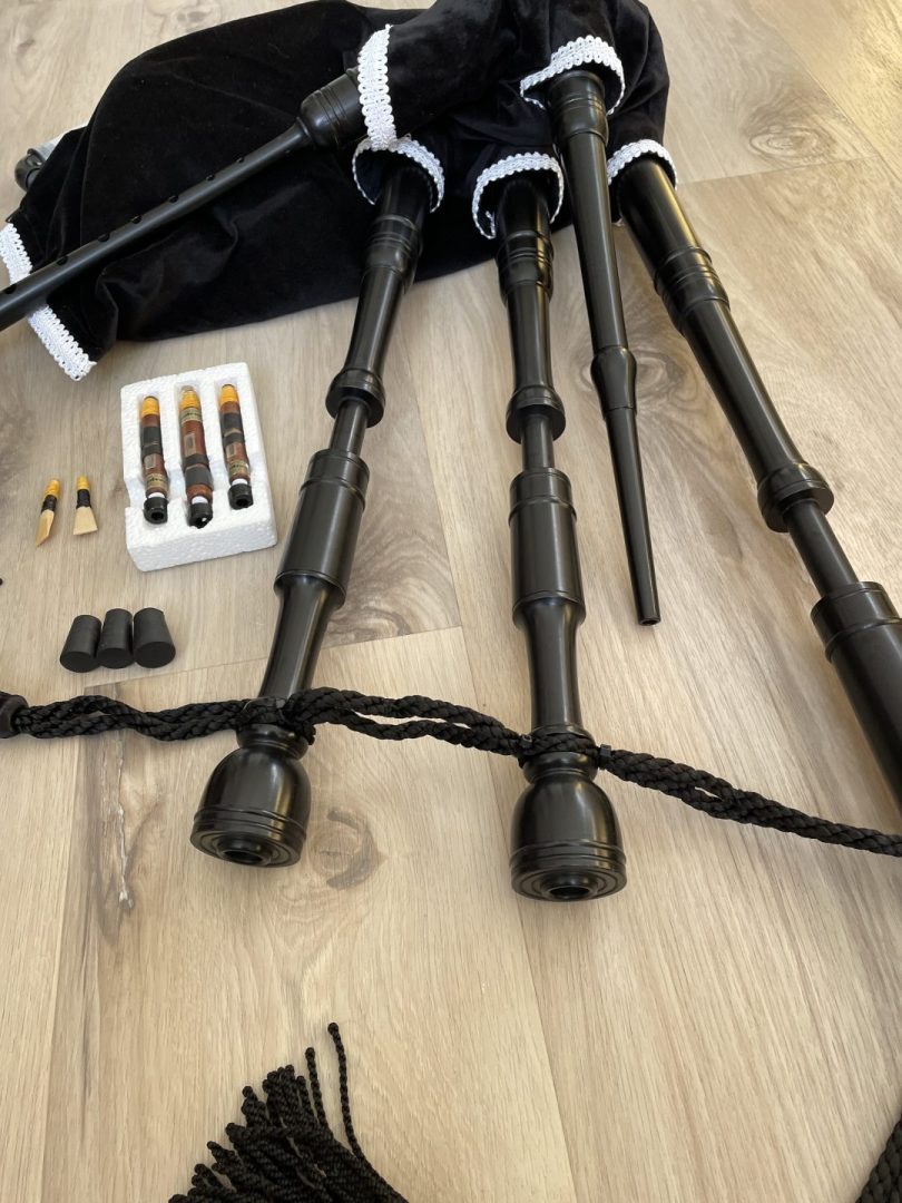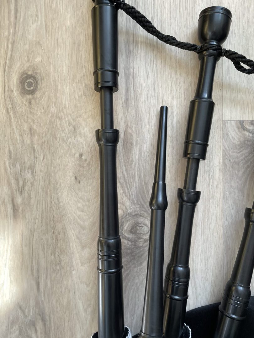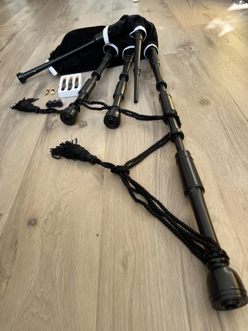 Excellent condition Dunbar polypenco P1 model bagpipe. Complete with brand new medium bannatyne bag with bottom zipper and bottle trap. O-rings for joints. Complete with bag cover, cords, Ezeedrone reeds, chanter reed, drone plugs, and drone brushes. Drone reed seats threaded. Fantastic all weather pipes, great for travel, and for students. Compare vs. new pricing. $900 Canadian including shipping and insurance. For my American friends, add $90 Canadian to cover your tariff, so $990 Canadian including shipping and insurance, which is aprroximately $725 US.