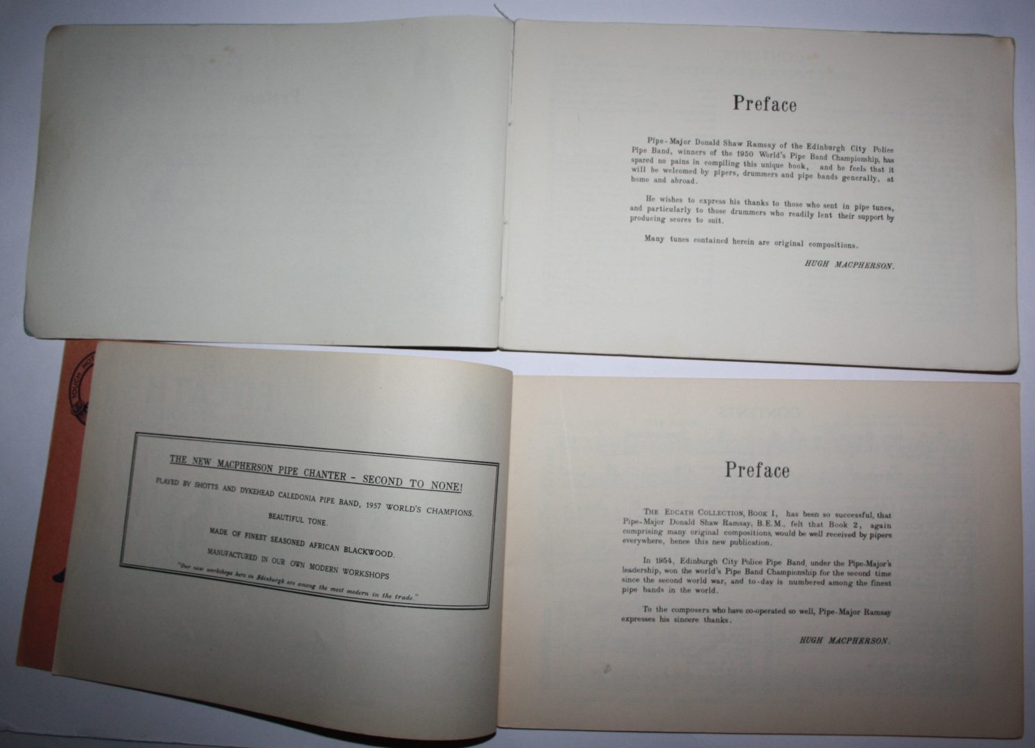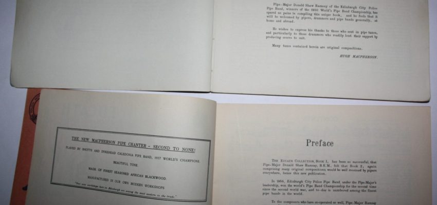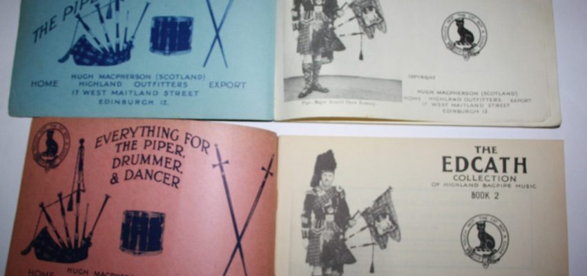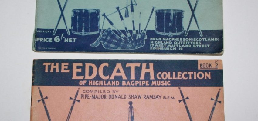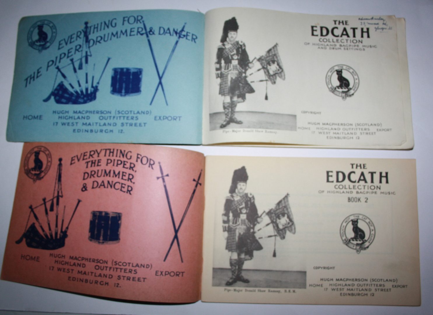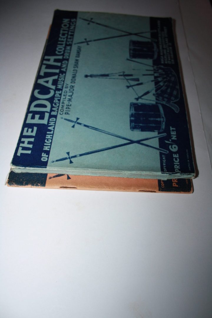 ‘The Edcath Collection of Highland Bagpipe Music and Drum Settings’ published 1953. Most probably the scarce first printing of this collection with no ‘Book 1’ logo to front cover. Price 6/- with later copies increasing in value (Cannon has 1968 edition at 7/6d).