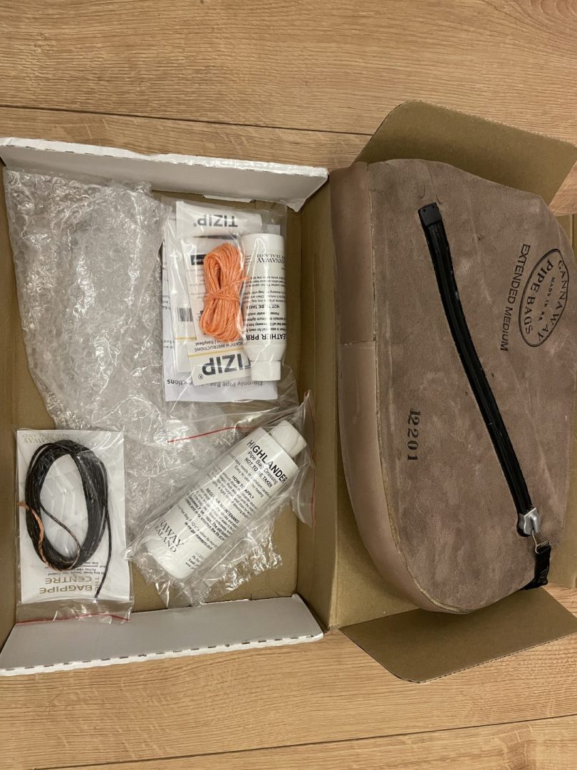 Brand new, unused Gannaway pipe bag. Extended medium size. Includes tie in string, bag dressing and primer as seen in photo. I’ve opted for a sheepskin bag instead so this bag is now surplus to my needs.
