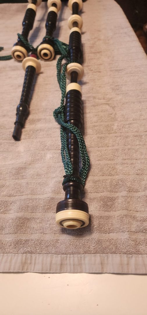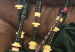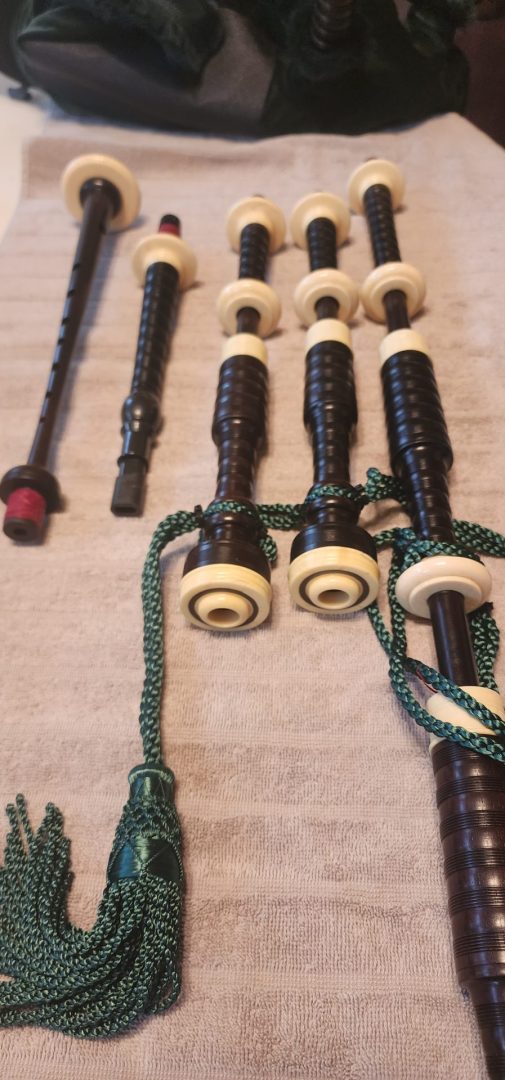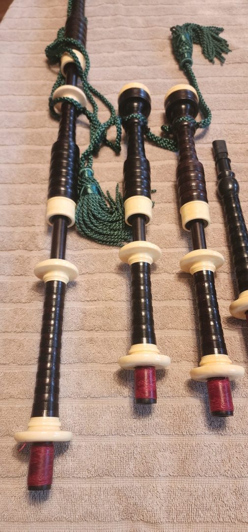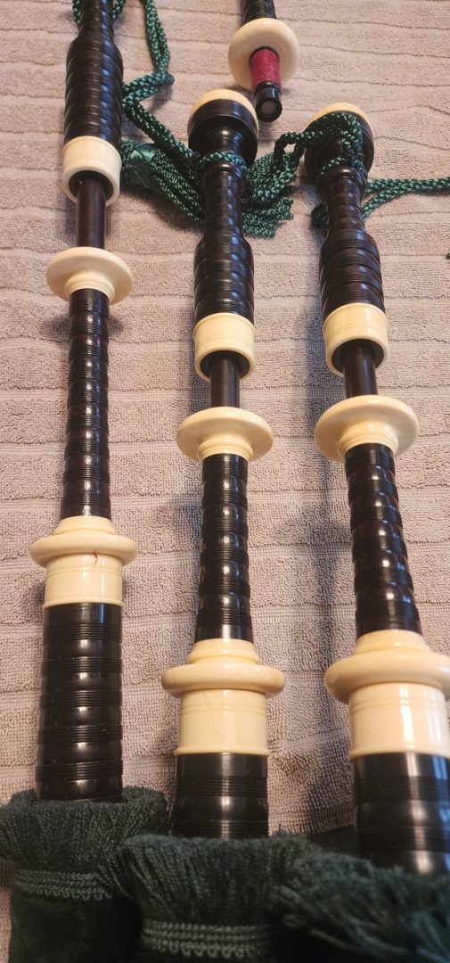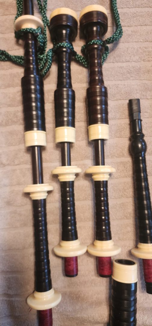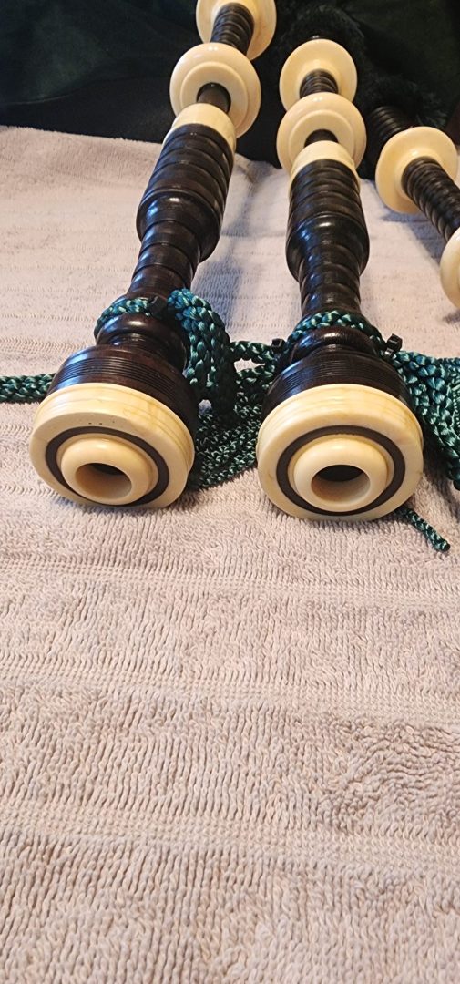 One of the very last sets made by grainger and Campbell before the closing in 1989 fully refurbished by lone star piper in 2025. ABW imitation ivory completely re hemped well oiled set has a brand new bannatyne bag ready to play beautiful set in amazing condition both tenor stocks are poly with the original ferrules mounted original chanter was cracked and has been repaired in refurb buyer pays shipping UPS