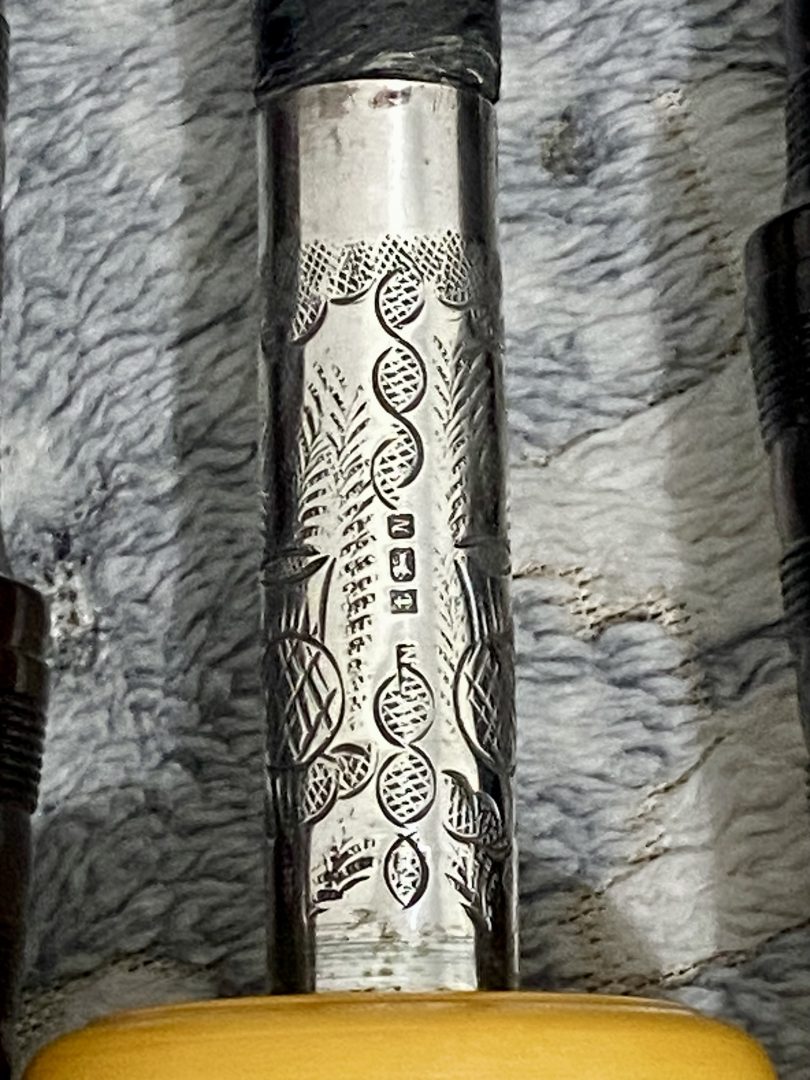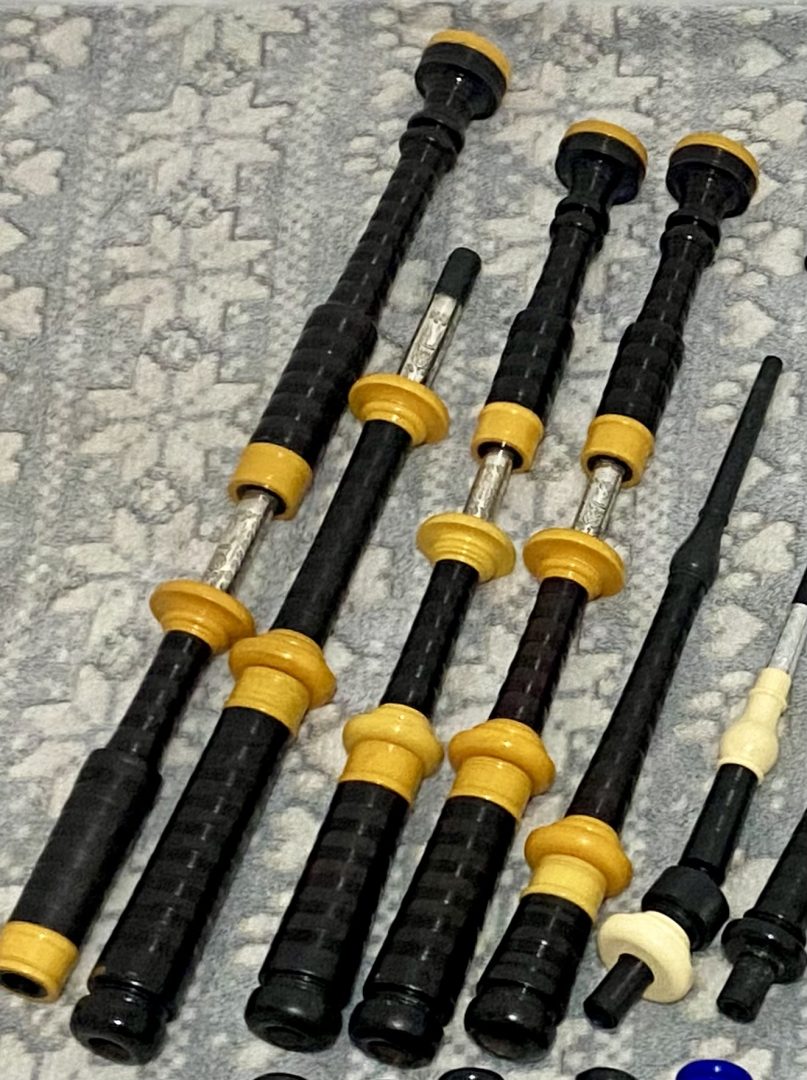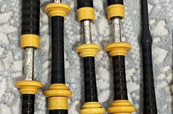 Beautiful Well Maintained Set of Grainger & Campbell Pipes with Silver Stamped/Hallmarked Slides Put on by Brian Donaldson Himself, Full Catalin Mounts Sound Fantastic when they are Set Up Drones Reeds Stay Solid as a Rock! These pipes are of the very best Craftsmanship made by a company with the likes of Wee Donald Macleods input and help hence their looks, sturdiness, durability, beautifully captivating looks and sweet resonance they produce! I have always oiled and maintained these pipes myself, hence the beautiful pictures… however I can’t continue to play 3 sets so had to let go of these beautiful pipes, reason for this hard sale! Just Sticks & Stocks, Ball Joint Mouth piece is NOT included as ALL ORIGINAL well looked after strong sturdy fantastic set. Will come with foam lined aluminium nearly new love case & key… 1 only bad point is the chanter stock is split beyond repair ( not there / most people using split stocks anyways to avoid splitting the stock like my father done due to stuck pipe chanter ) hence the price lowered giving these pipes if you know pipes are worth twice this amount all day long!