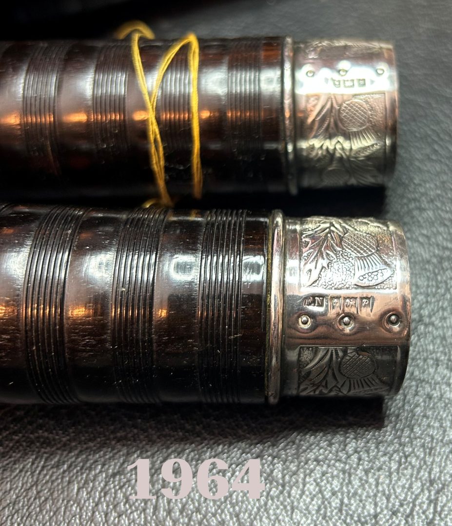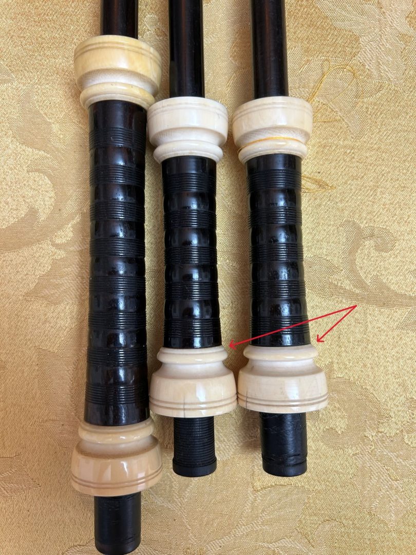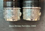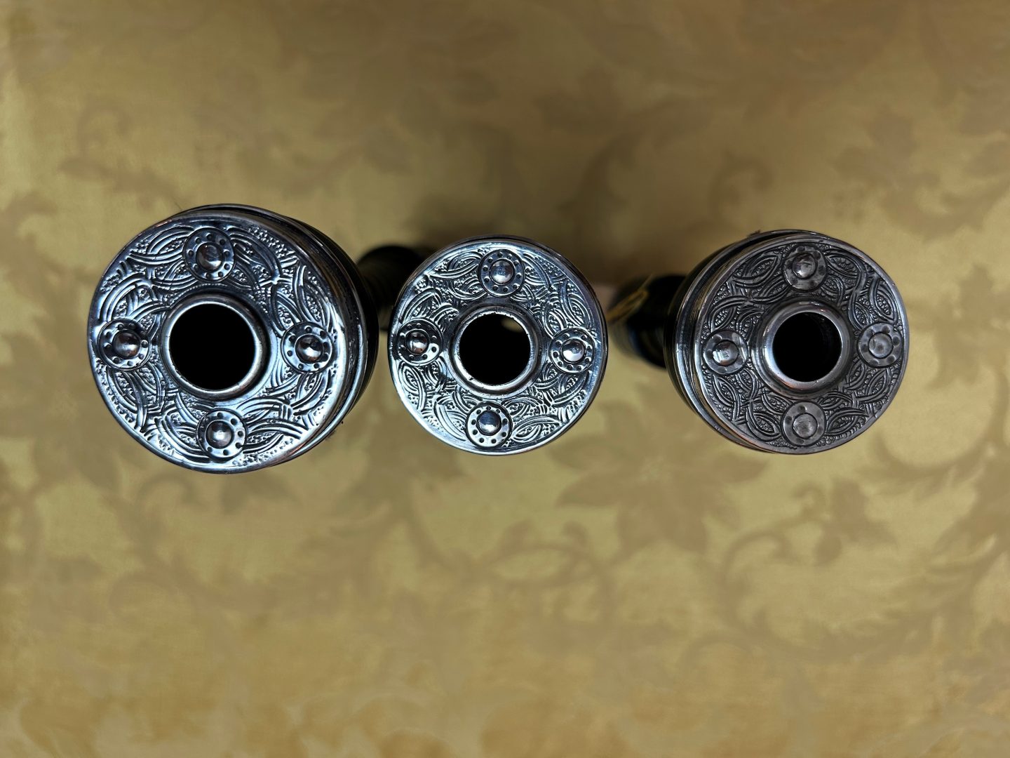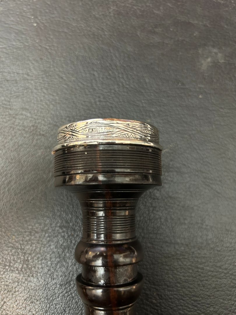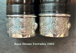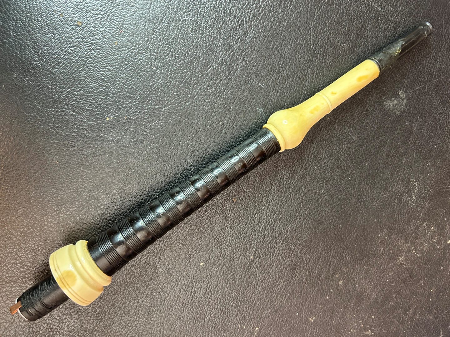 Besides the mismatched silver, It appears the bass drone may not match the tenors, or at least the bass drone mid section seems mismatched. The silver on the tenor Ferruless wraps around, and the silver on the Bass drone is more like the alloy ferrules that don’t wrap below. The silver on drones is chased runic, and the silver on the stocks is thistle, and some mismatched. It has been suggested that some of the button mounts were actually turned down from standard projecting mounts. (He was a woodshop teacher) There are minor cracks in the natural material. The blowpipes has suffered from an overambitious placement of a little MAC valve, and has had the tenon with the crack ”whipped”. The valve is a plain rubber one now.
