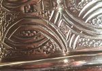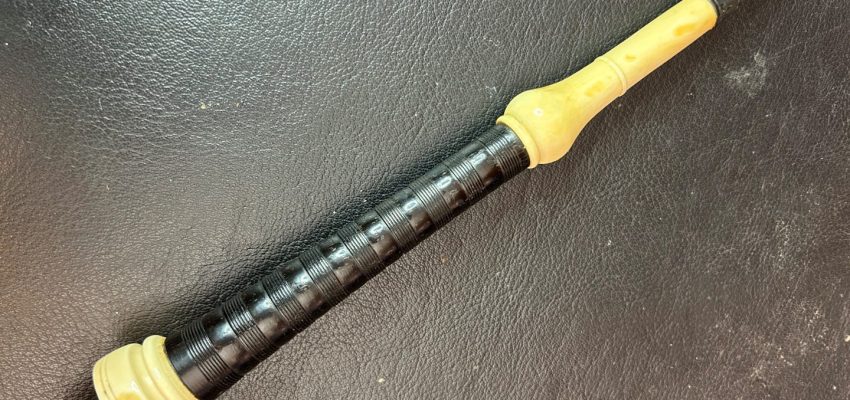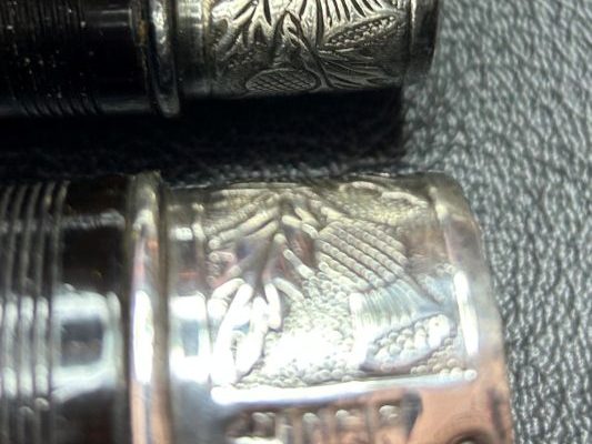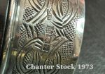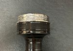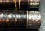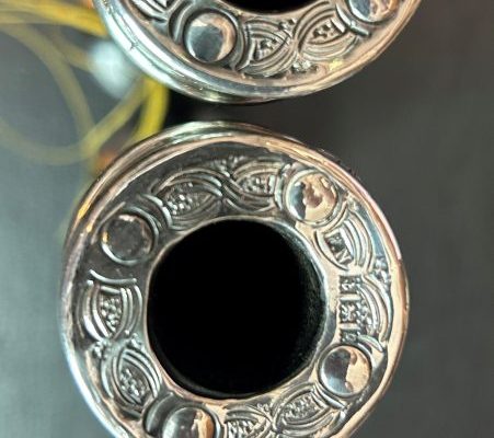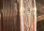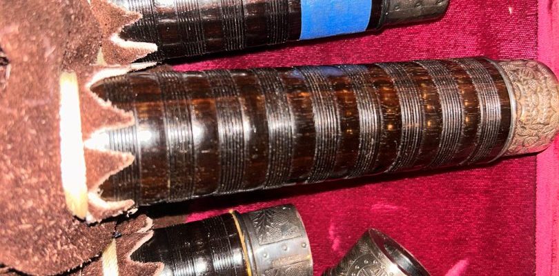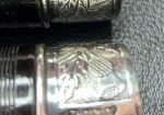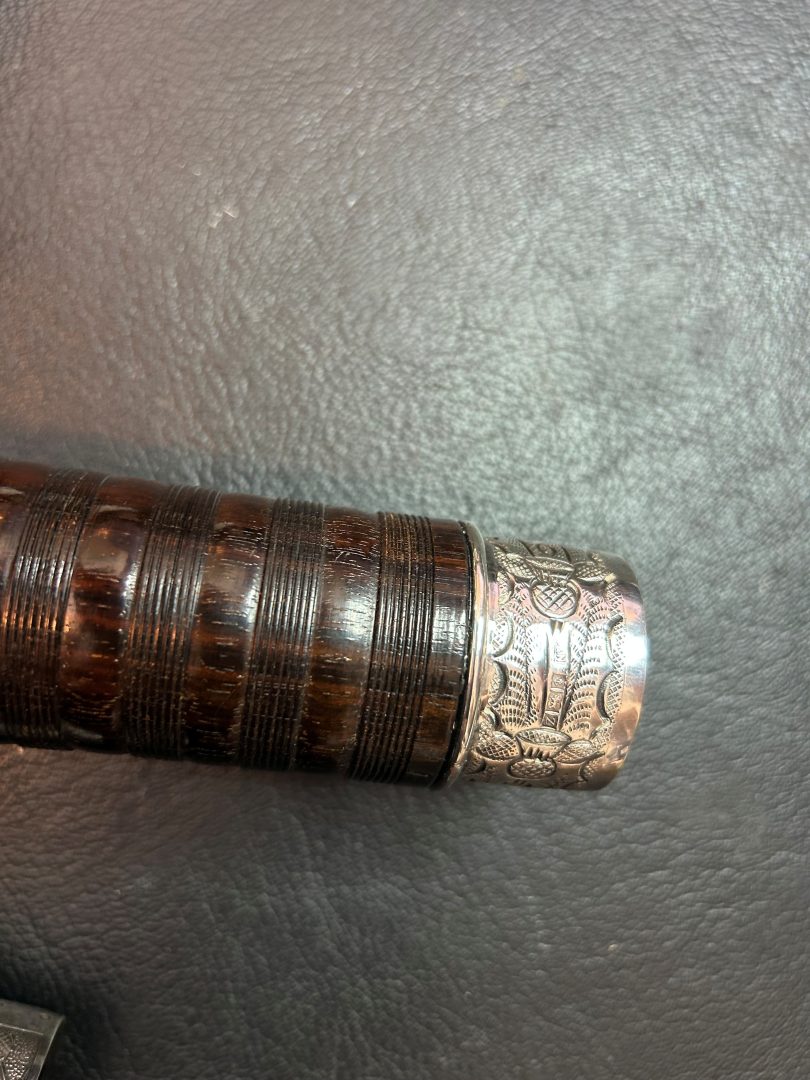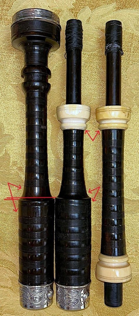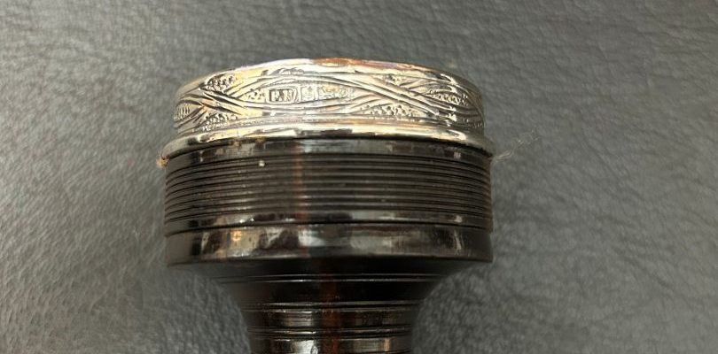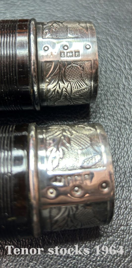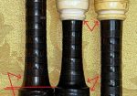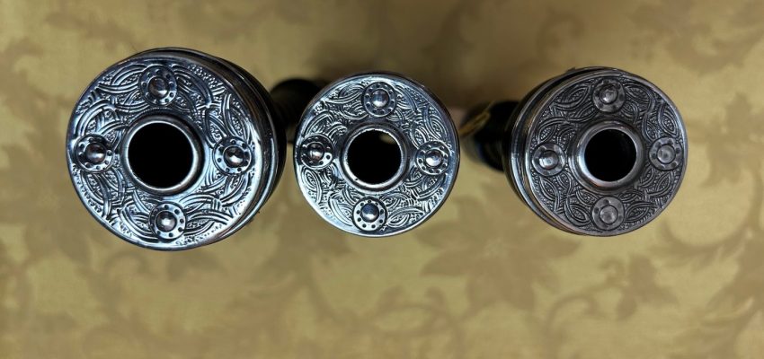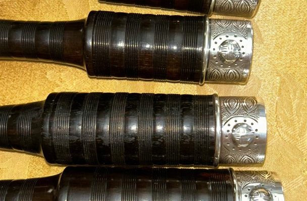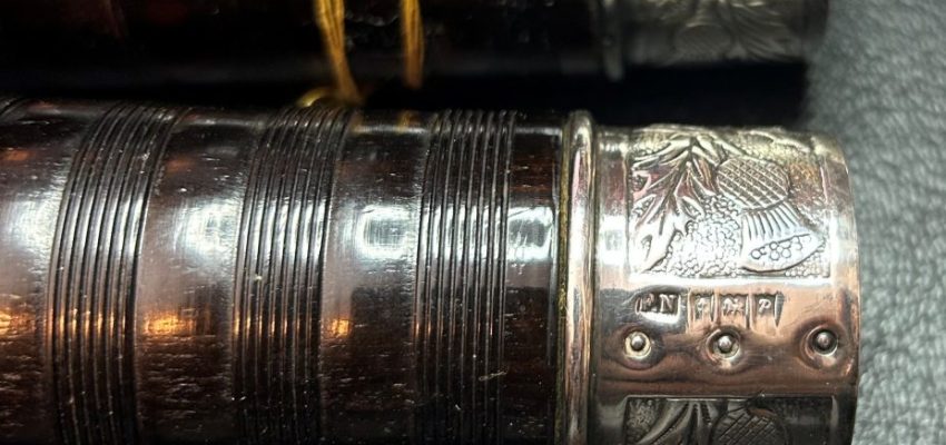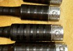 Besides the mismatched silver, It appears the bass drone may not match the tenors, or at least the bass drone mid section seems mismatched. The silver on the tenor Ferruless wraps around, and the silver on the Bass drone is more like the alloy ferrules that don’t wrap below. The silver on drones is chased runic, and the silver on the stocks is thistle, and some mismatched. It has been suggested that some of the button mounts were actually turned down from standard projecting mounts. (He was a woodshop teacher) There are minor cracks in the natural material. The blowpipes has suffered from an overambitious placement of a little MAC valve, and has had the tenon with the crack ”whipped”. The valve is a plain rubber one now.