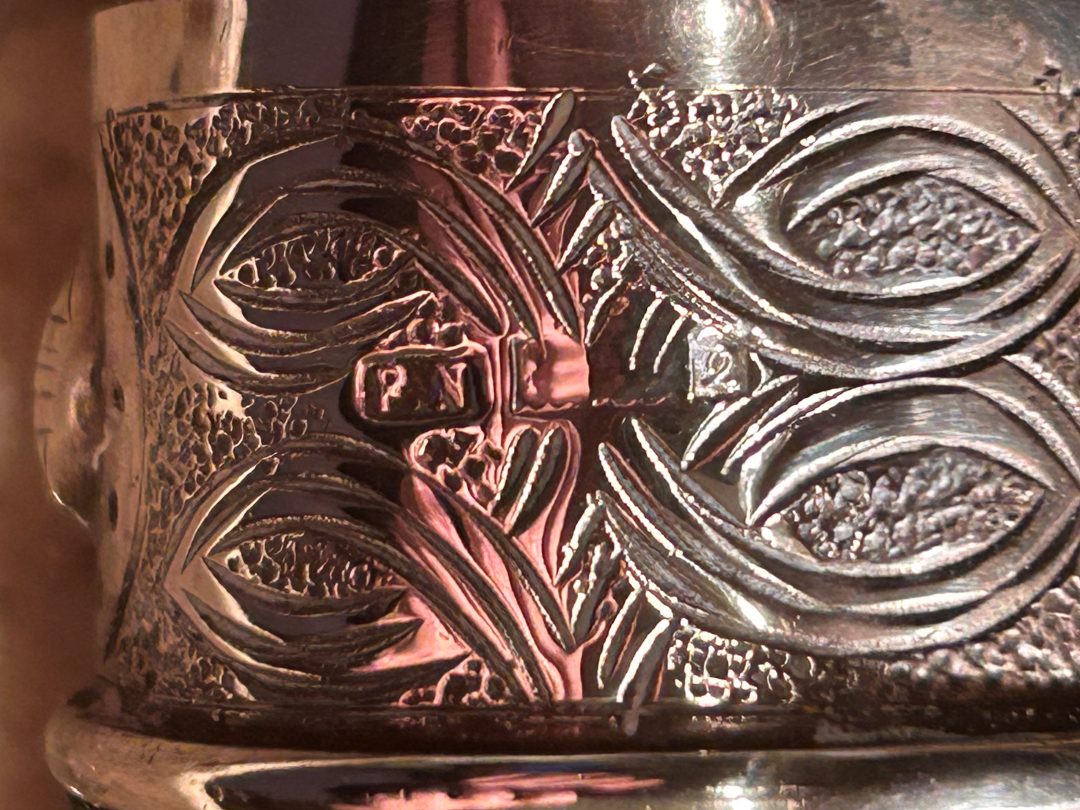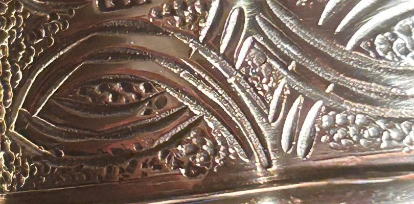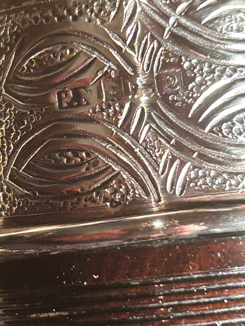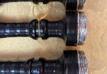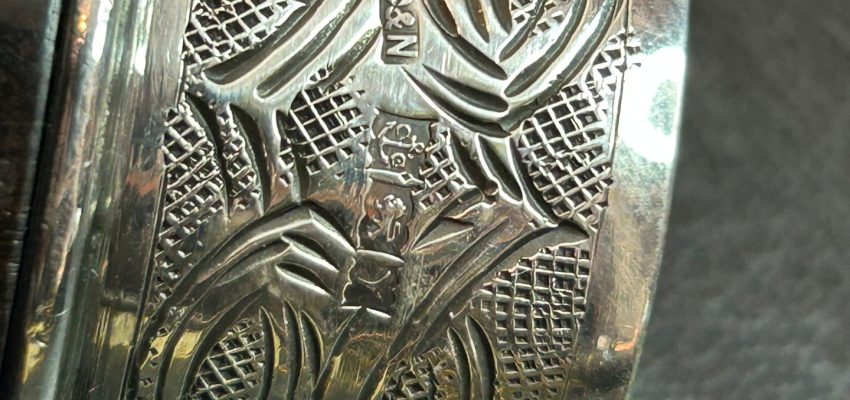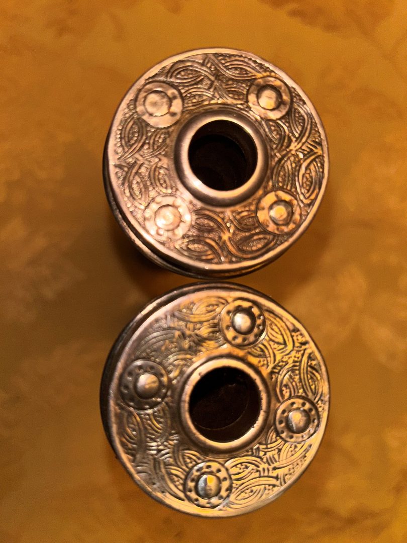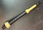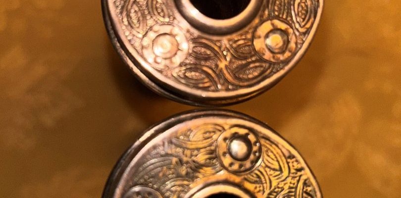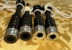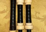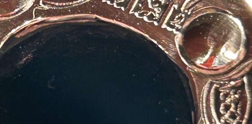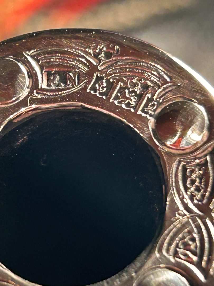 Besides the mismatched silver, It appears the bass drone may not match the tenors, or at least the bass drone mid section seems mismatched. The silver on the tenor Ferruless wraps around, and the silver on the Bass drone is more like the alloy ferrules that don’t wrap below. The silver on drones is chased runic, and the silver on the stocks is thistle, and some mismatched. It has been suggested that some of the button mounts were actually turned down from standard projecting mounts. (He was a woodshop teacher) There are minor cracks in the natural material. The blowpipes has suffered from an overambitious placement of a little MAC valve, and has had the tenon with the crack ”whipped”. The valve is a plain rubber one now.