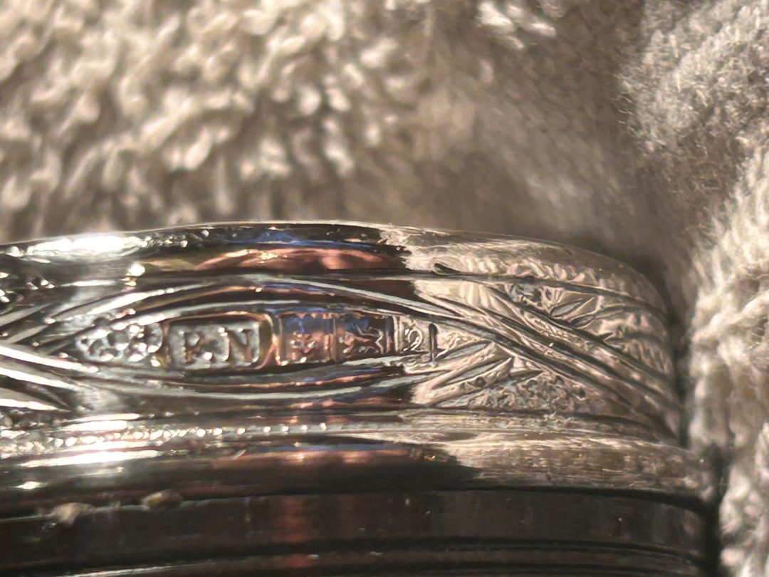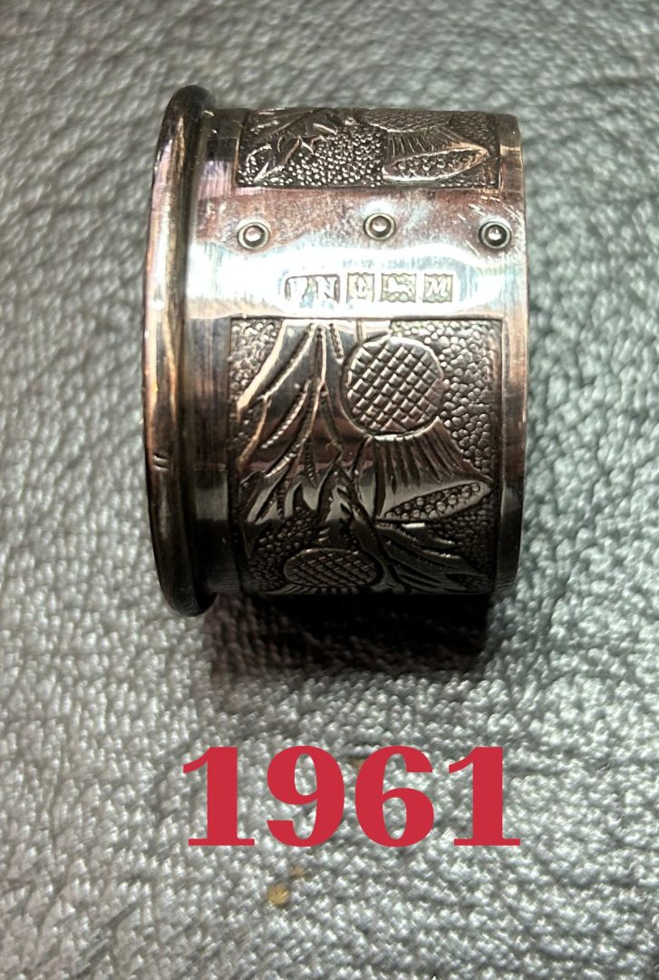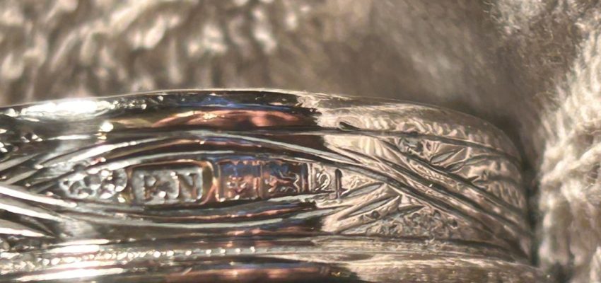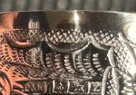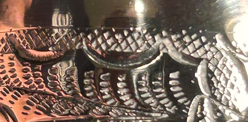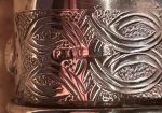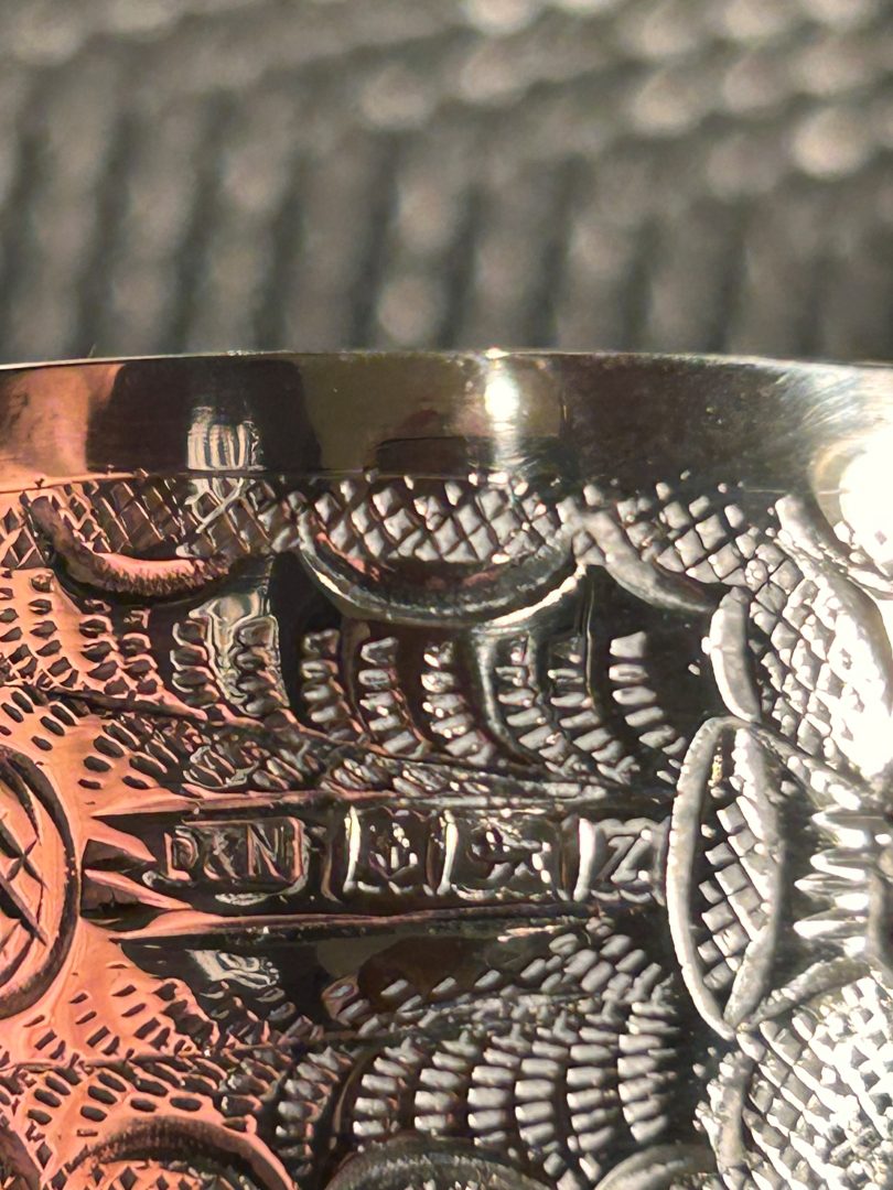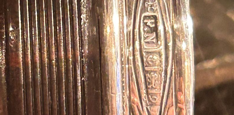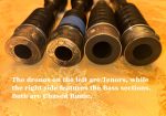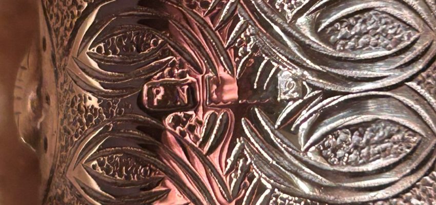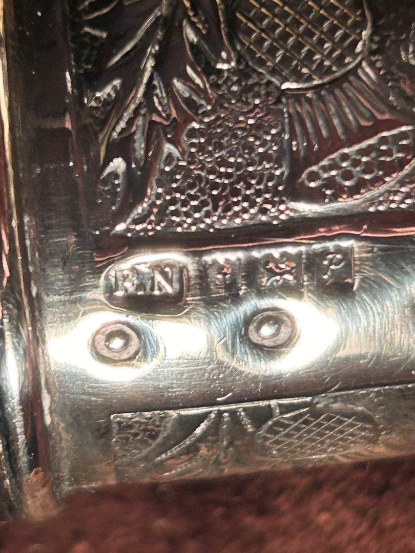Besides the mismatched silver, It appears the bass drone may not match the tenors, or at least the bass drone mid section seems mismatched. The silver on the tenor Ferruless wraps around, and the silver on the Bass drone is more like the alloy ferrules that don’t wrap below. The silver on drones is chased runic, and the silver on the stocks is thistle, and some mismatched. It has been suggested that some of the button mounts were actually turned down from standard projecting mounts. (He was a woodshop teacher) There are minor cracks in the natural material. The blowpipes has suffered from an overambitious placement of a little MAC valve, and has had the tenon with the crack ”whipped”. The valve is a plain rubber one now.