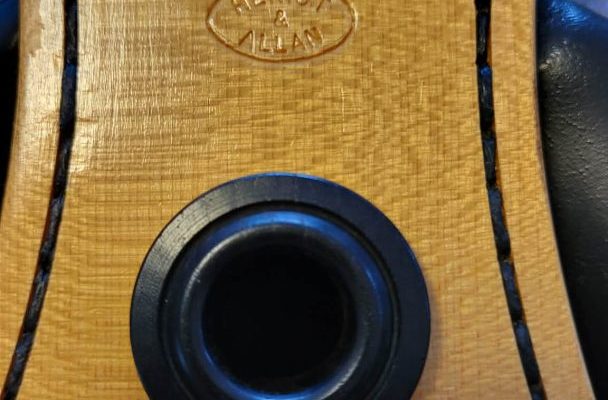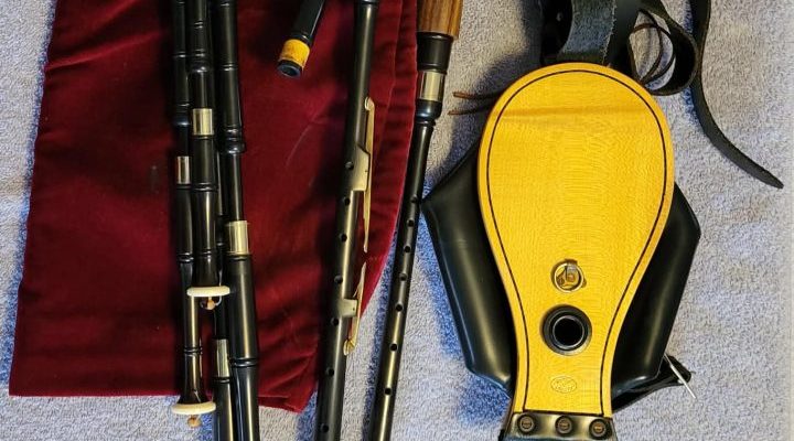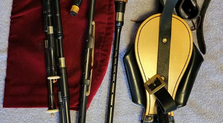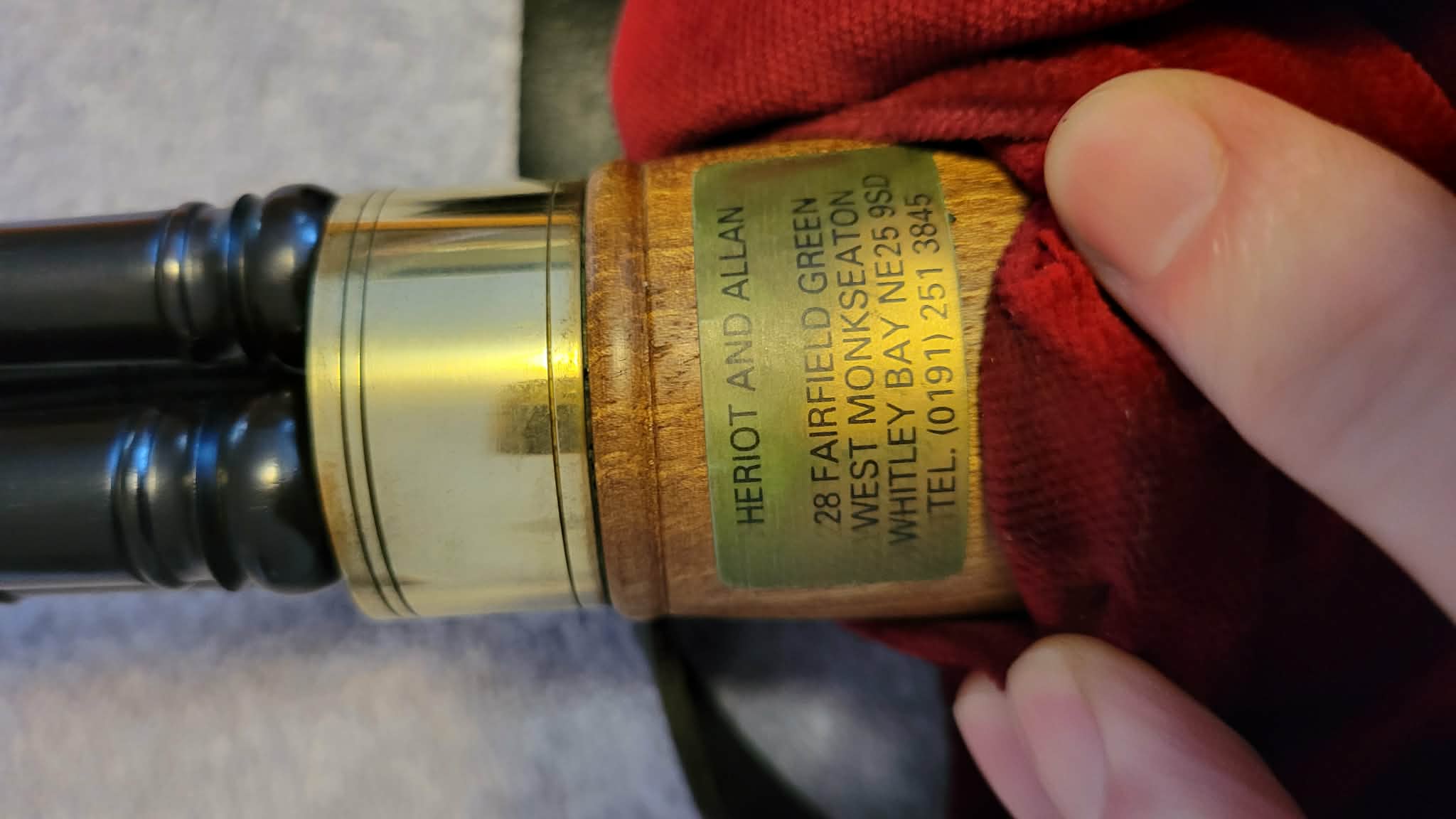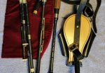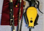 This is a wonderful set of Scottish smallpipes made in 1999 by Hariot and Allan. They are bellows-blown with African blackwood A and D chanters and drones and brass ferrules. Cane chanter reeds. Drone reeds are brass barrels with cane tongues. The A chanter has high B and C natural brass keys. Natural hide bag with wood and leather bellows. Red velvet bag cover. Comes with a hard case and soft case and a spare, unused cane chanter reed. Very lightly used high quality instrument. I haven’t played it in some time and am unlikely to get back to it, so it’s time to pass it along to someone that can really enjoy it.