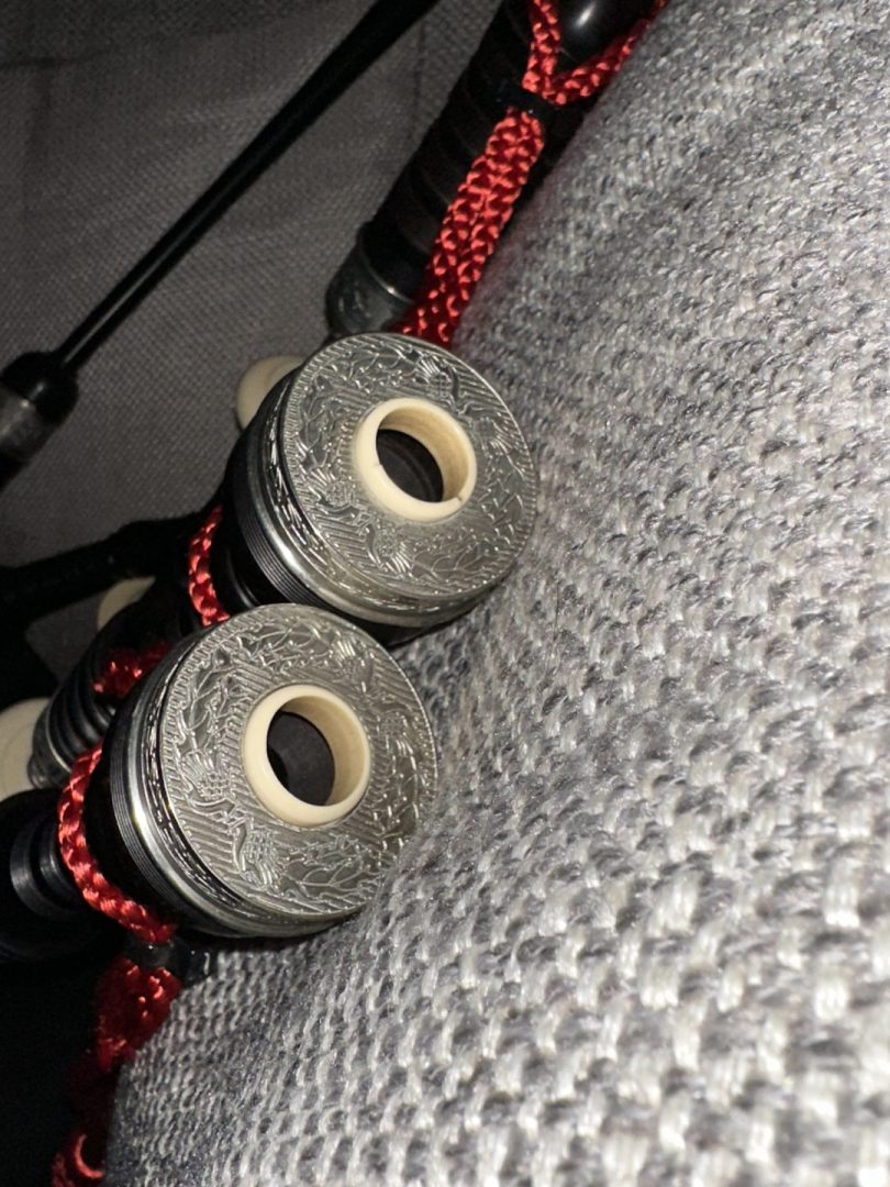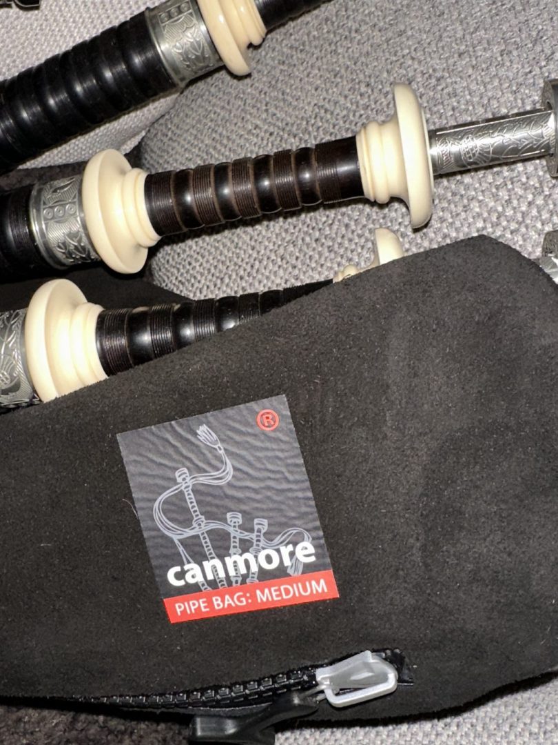 A bargain at £650 plus shipping complete set ready to play with soft carry case Wallace b flat poly pipe chanter with imitation sole kinaird drone reeds moisture control system brand new cover cords and brand new medium size Canmore hybrid Hyde pipe bag thistle engraving on alloy ferrules imitation mounts African Blackwood no cracks or splits very nice tidy set of pipes
