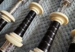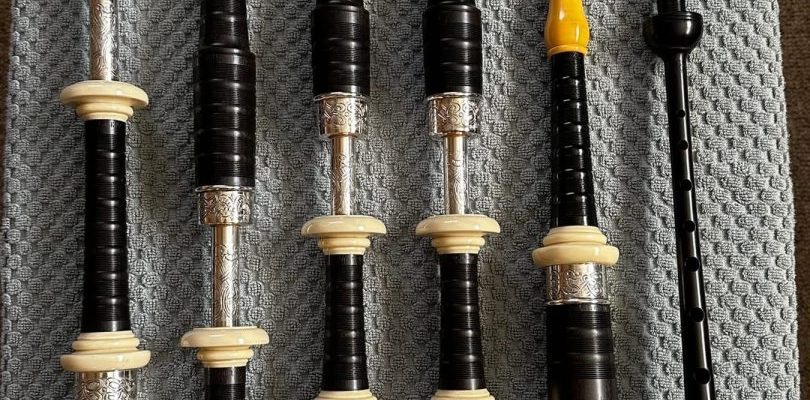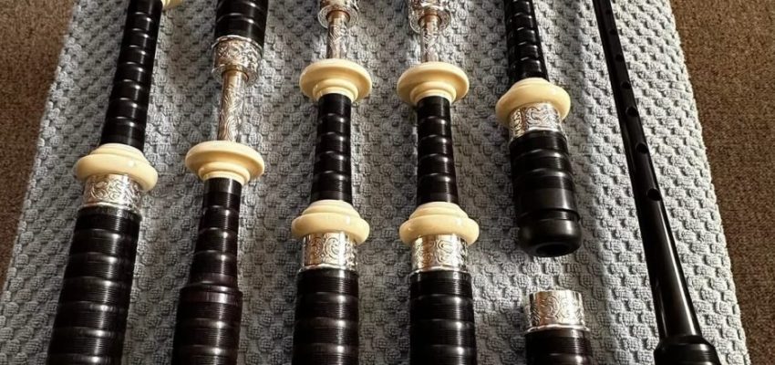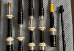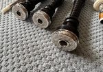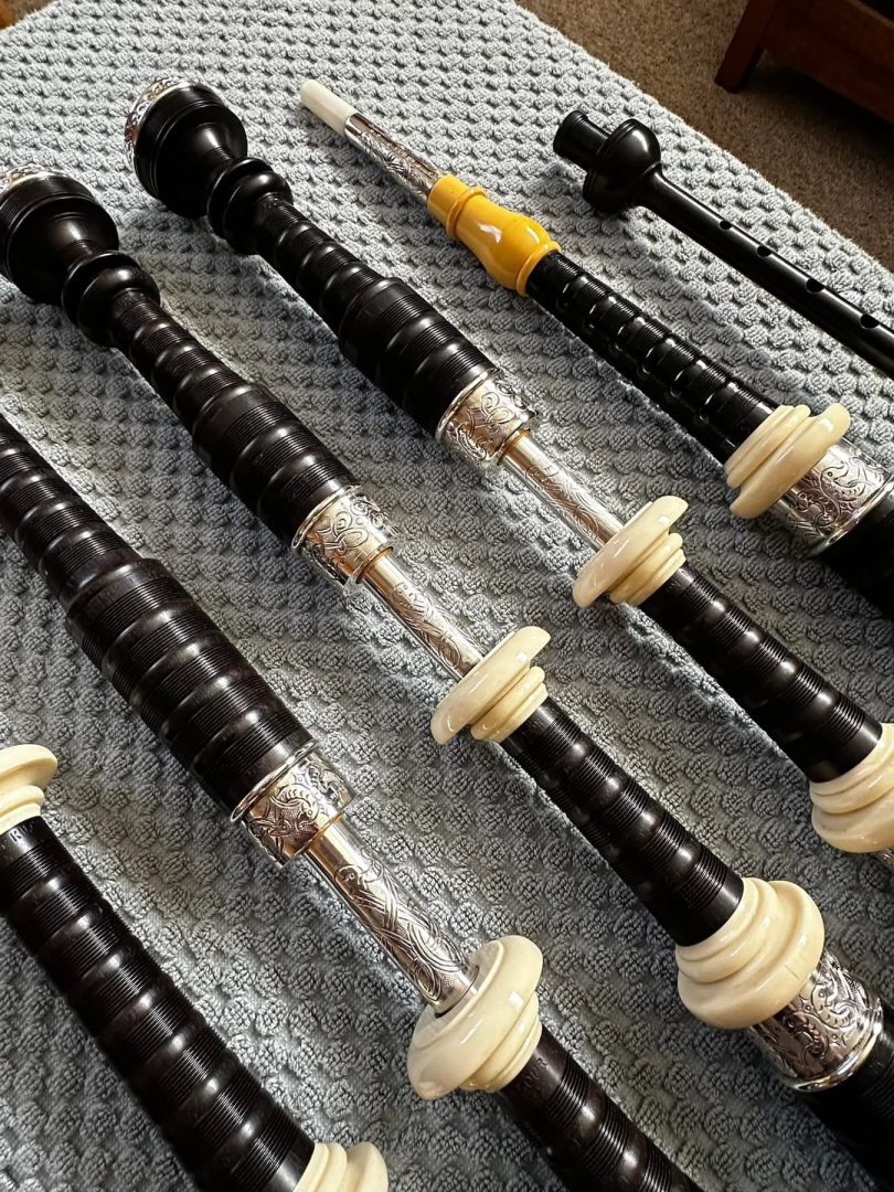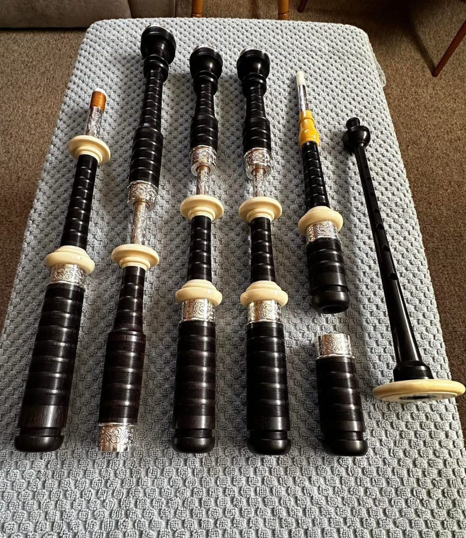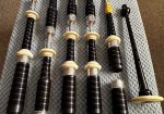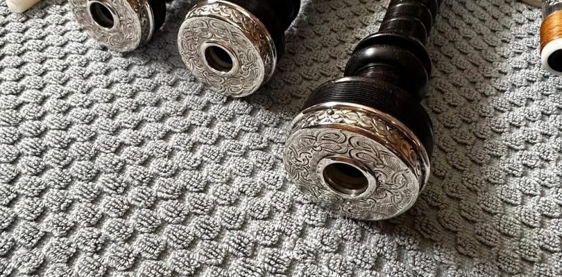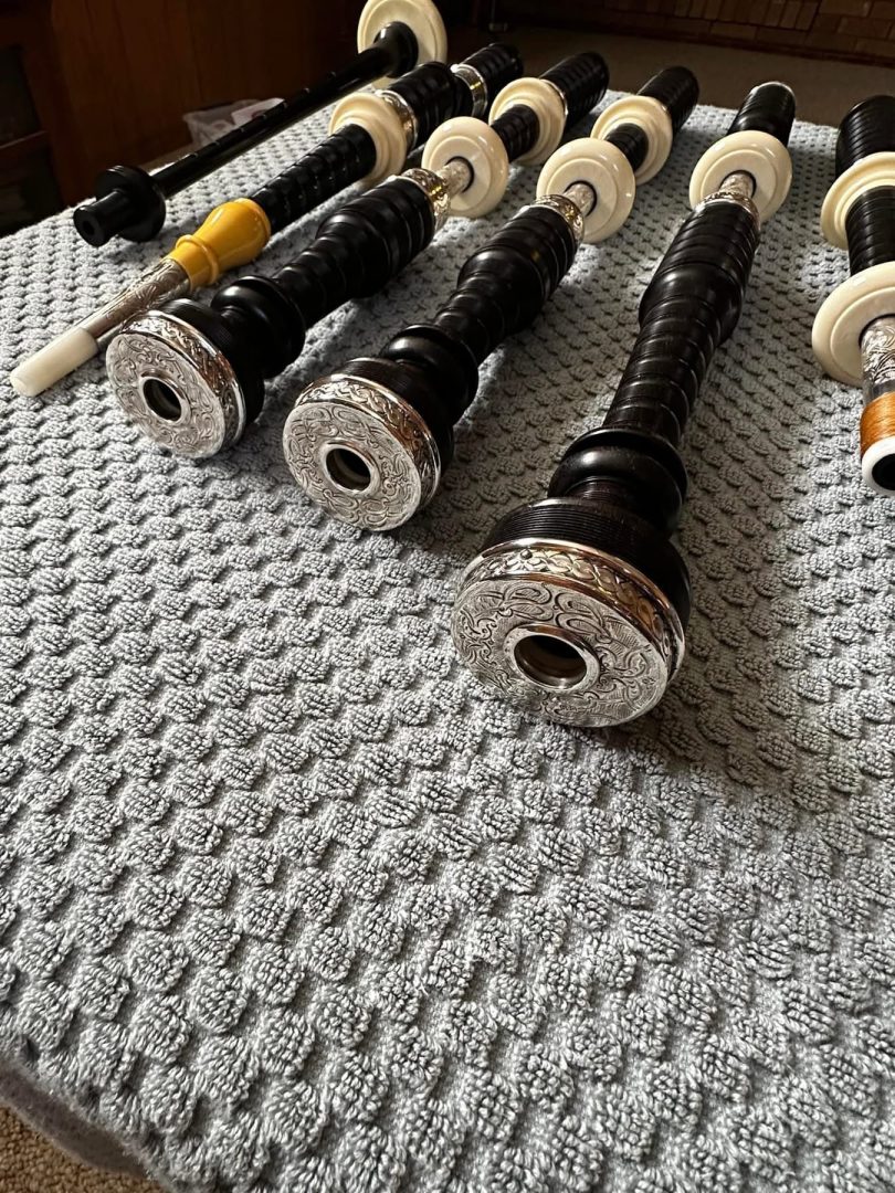 Absolutely no cracks or dings in the wood. One small ding on one of the tenor drone tops but not noticeable. Standard bore design with excellent harmonics and chanter blend. These would make a fantastic pipe for Piobaireachd. Compatible with any modern drone reed combo or cane if you so choose. Also included is a new delrin split stock w/tube trap and Airstream Tilt/adjustable blowpipe, and a new set of Kinnaird Regular Carbon drone reeds.