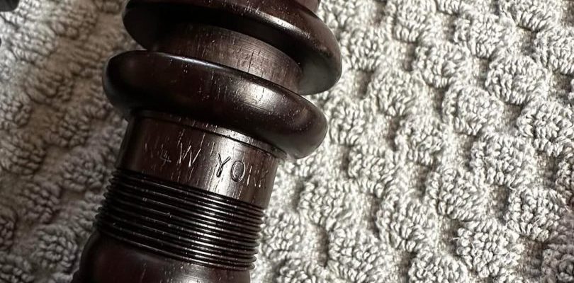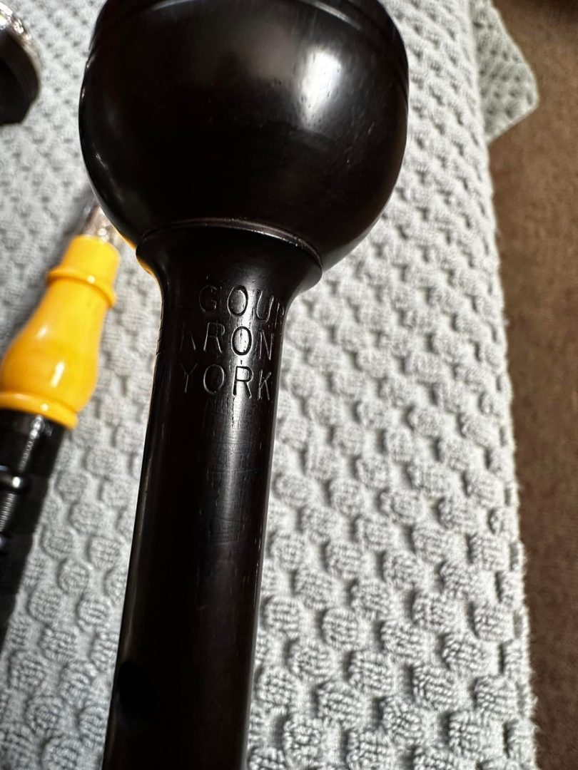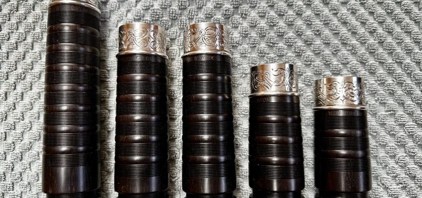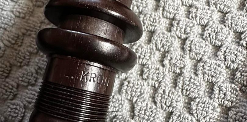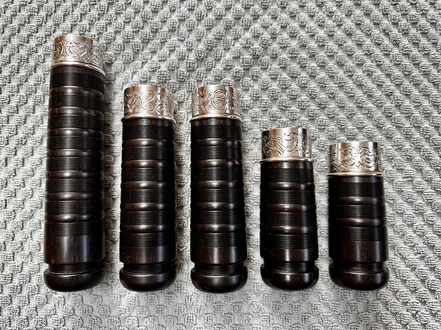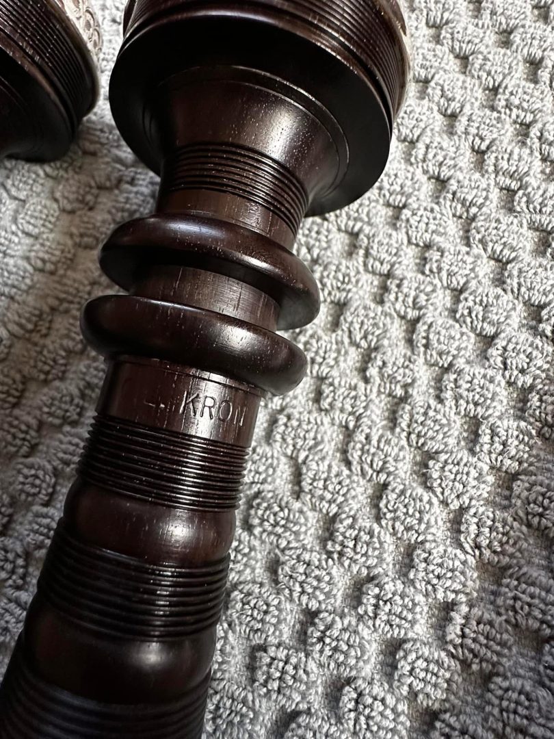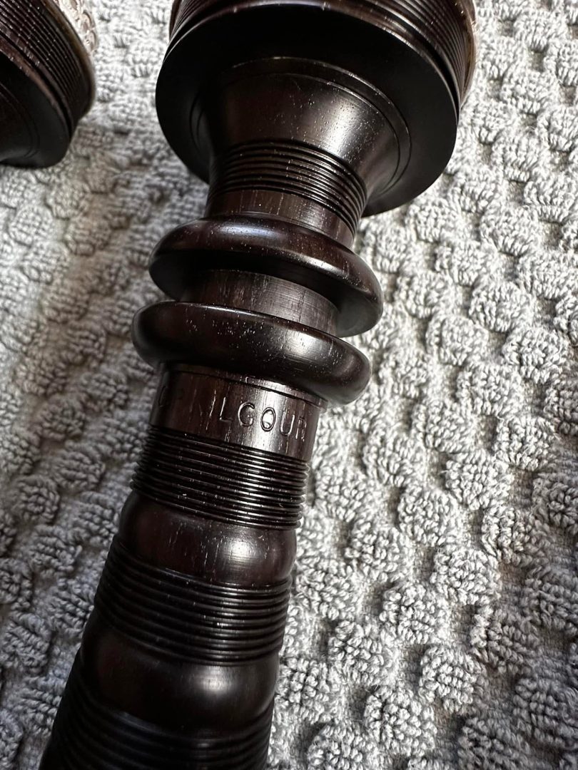 Beautiful set of early ABW Kilgour & Kron highland bagpipes. From the time George Kilgour and Charlie Kron partnered together in the 80’s and early 90’s in Dobbs Ferry NY. All wooden pieces, including the matching chanter are stamped G. Kilgour, C.E. Kron, New York.