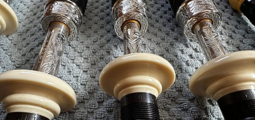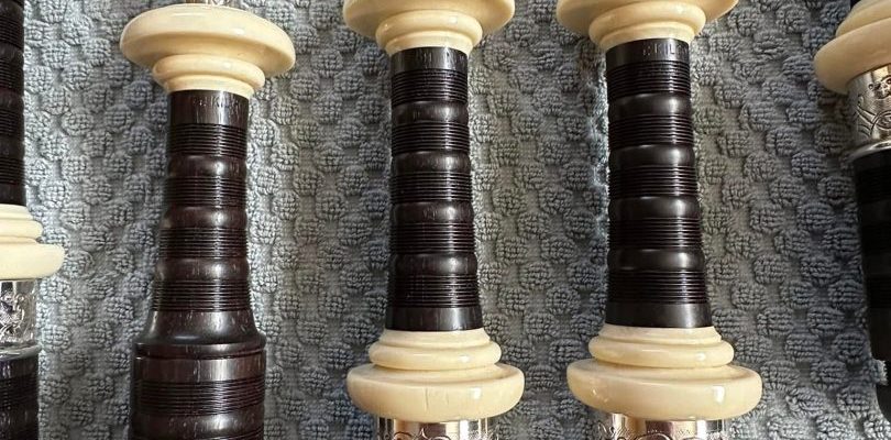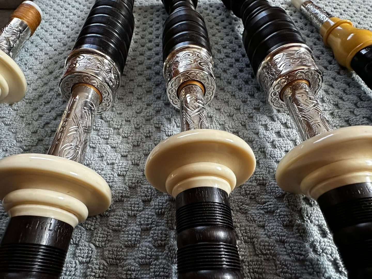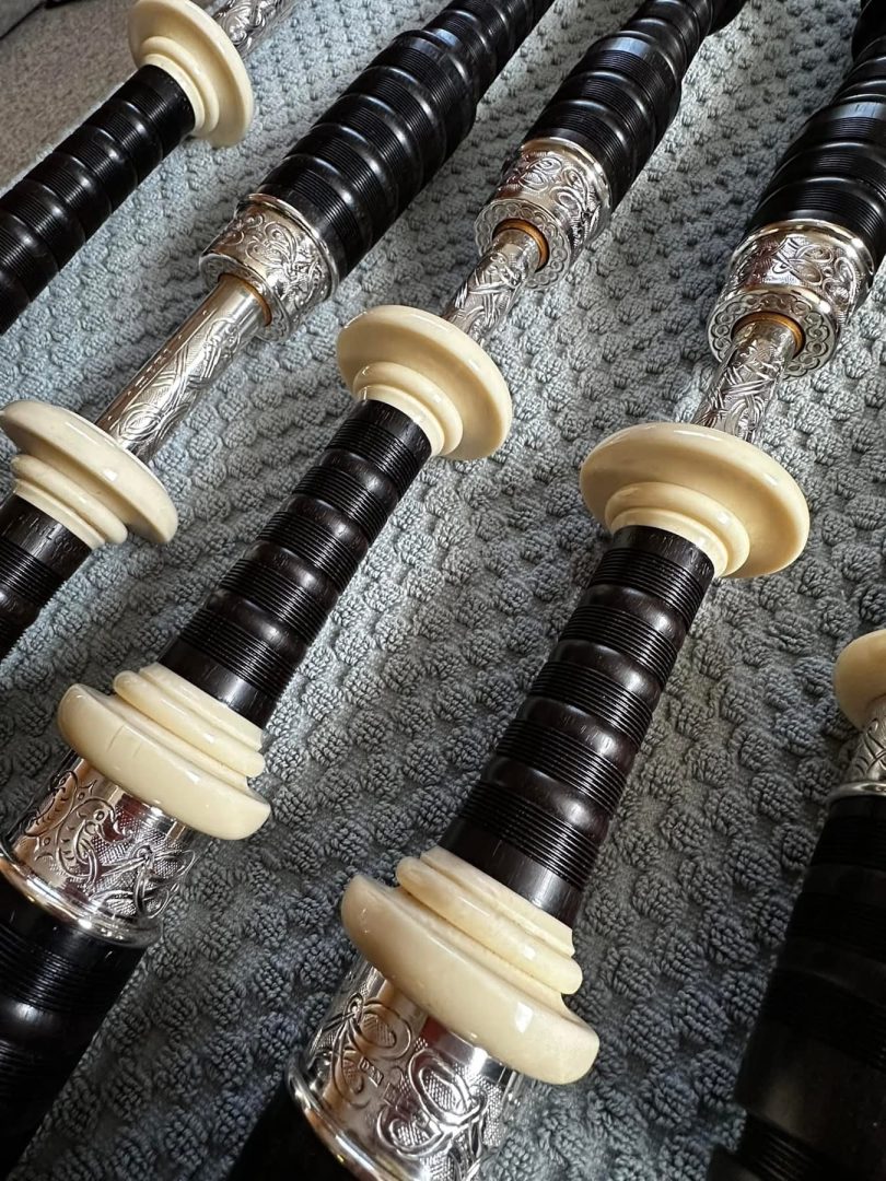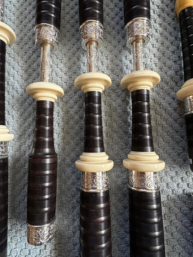 Hand turned, combed and beaded from African Blackwood and feature stunning hand chased silver ferrules, tuning slides and one-piece drone caps along with the original blowpipe mouthpiece sleeve. Each silver piece is stamped & hallmarked by British silversmiths Dalman & Narborough in Birmingham, England and dated to 1992. Projecting mounts are made from Charlies premium imitation ivory. Matching blackwood chanter with imitation sole also included. (No modifications)