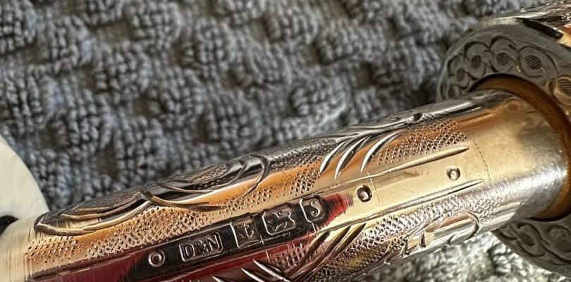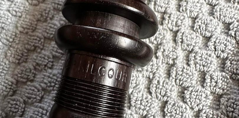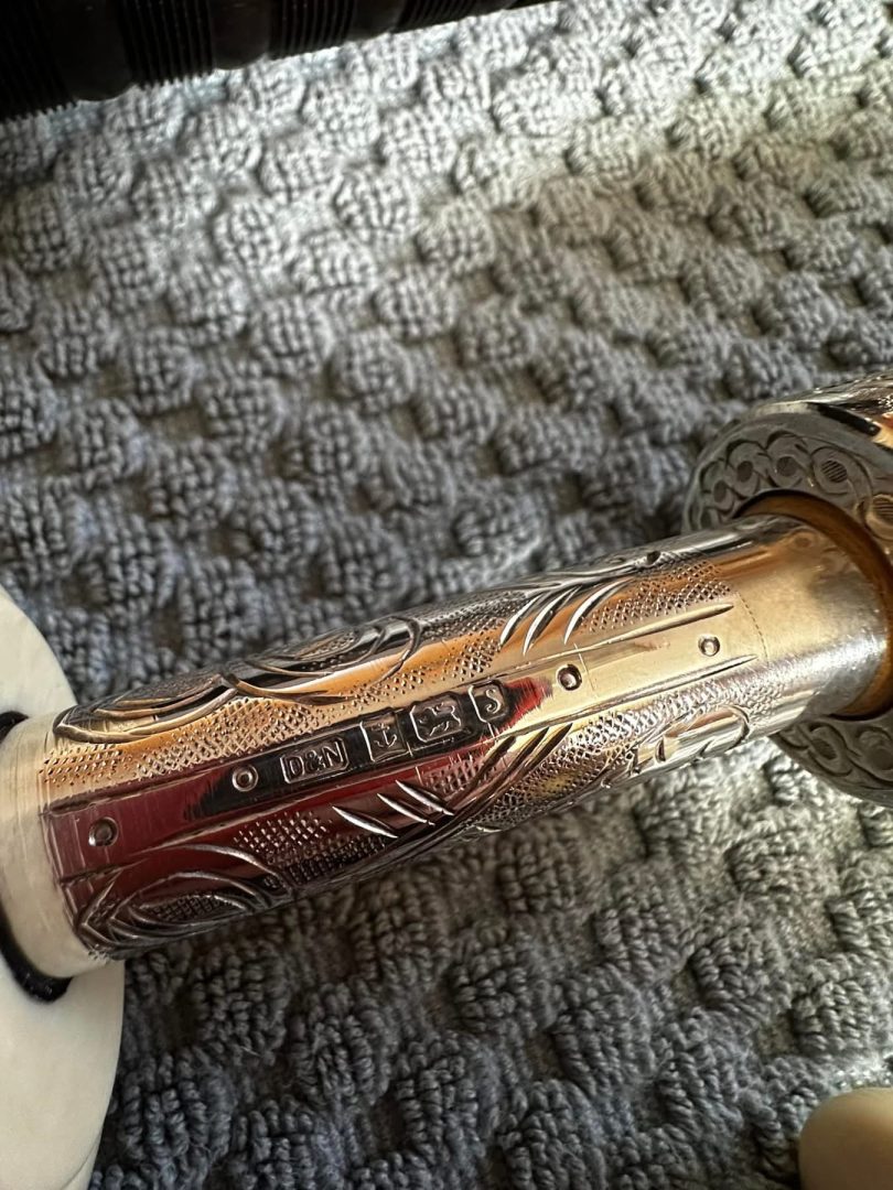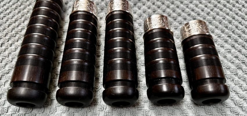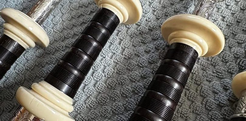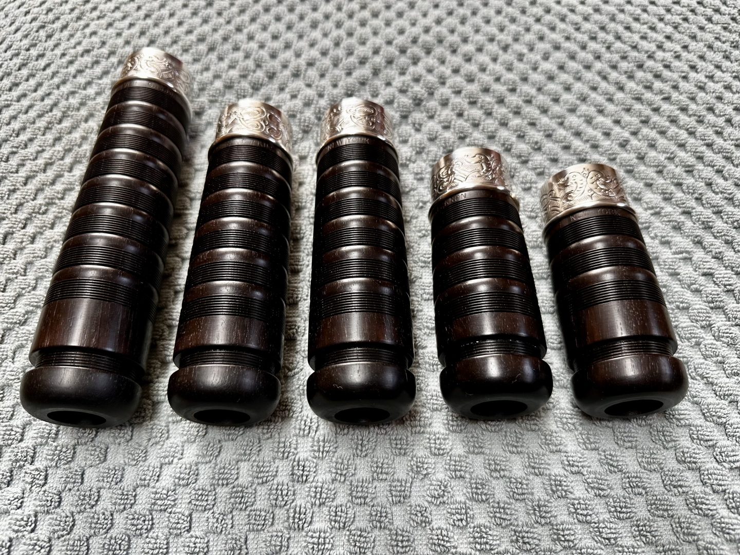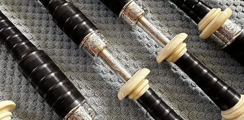 Hand turned, combed and beaded from African Blackwood and feature stunning hand chased silver ferrules, tuning slides and one-piece drone caps along with the original blowpipe mouthpiece sleeve. Each silver piece is stamped & hallmarked by British silversmiths Dalman & Narborough in Birmingham, England and dated to 1992. Projecting mounts are made from Charlies premium imitation ivory. Matching blackwood chanter with imitation sole also included. (No modifications)