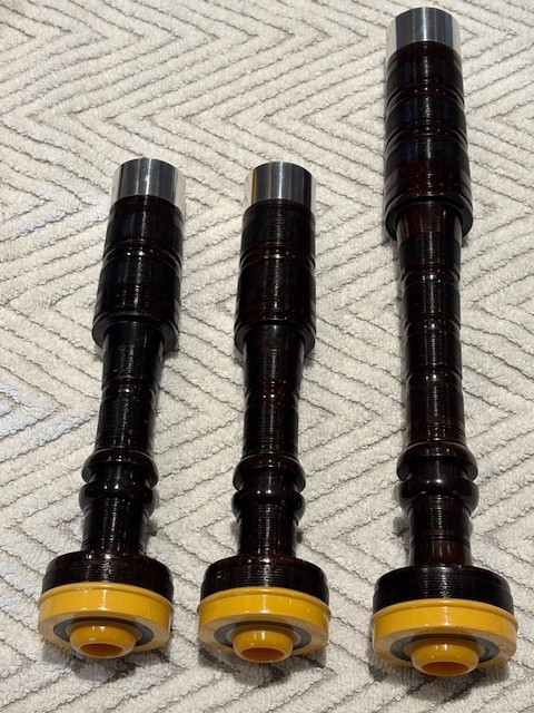 Lovely stand of 1970’s Matt Marshall turned R. G. Lawrie Blackwood bagpipes. Combed and beaded with imitation projection mounts, ring caps and bushings. A few of the original ferrules were missing, so they have all been professionally replaced. The drones and stocks are in incredible condition for their age, arrow straight and beautiful wood grain.
