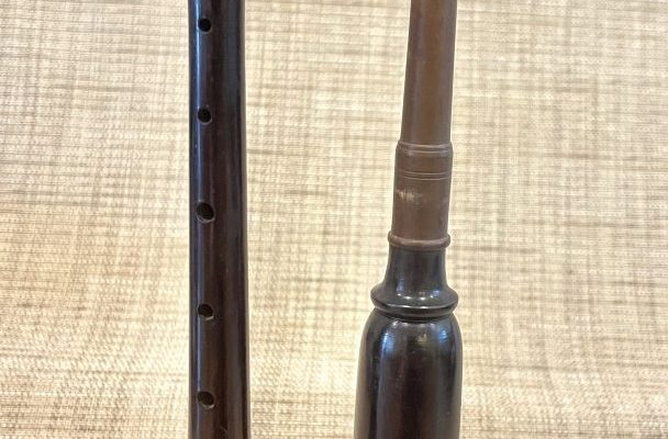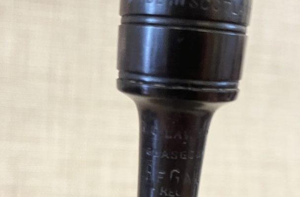 Mid-Century African Blackwood Stamped R G Lawrie Regal Standard Practice Chanter. Good Condition. Wood is intact. Imitation Ivory Sole, Closed End Nickel Ferrule.