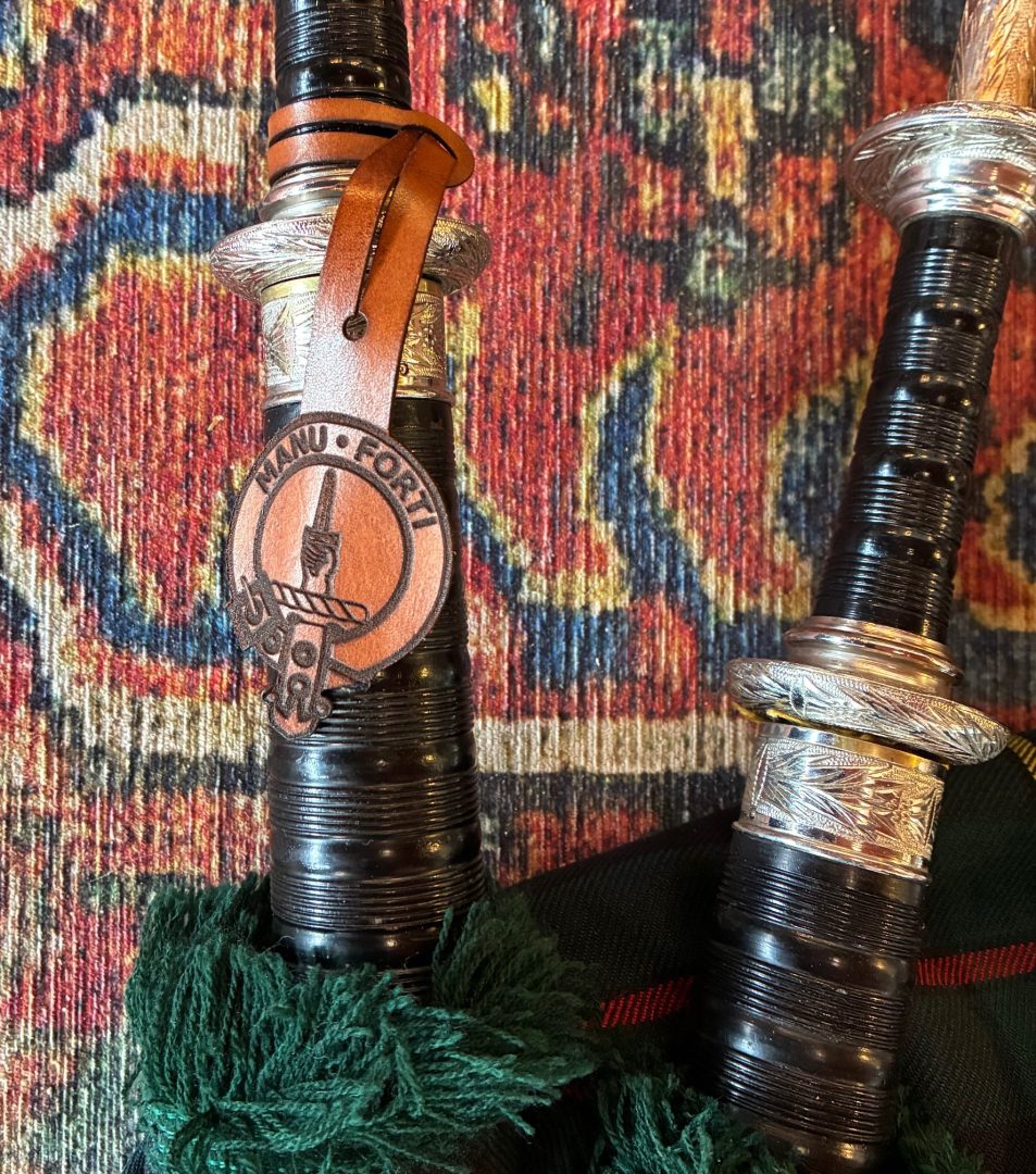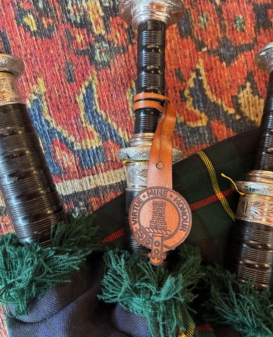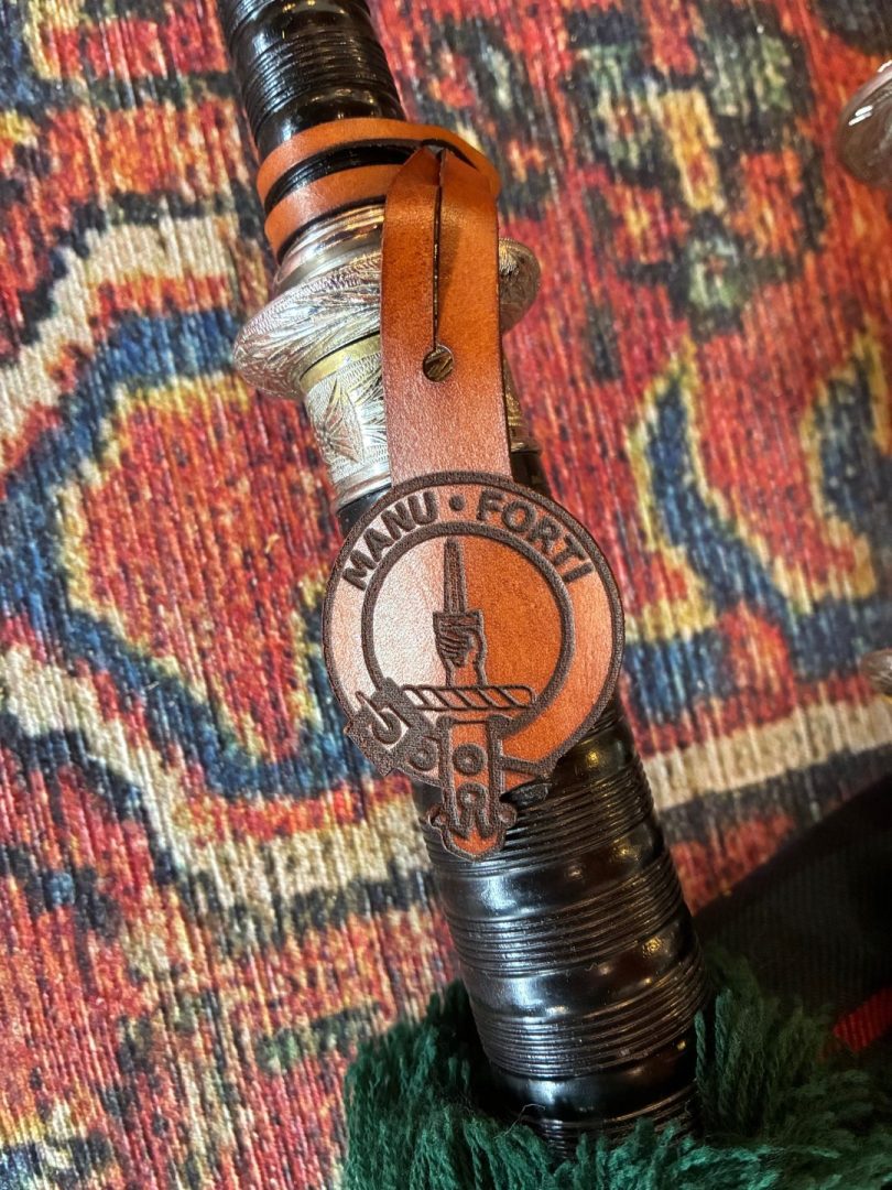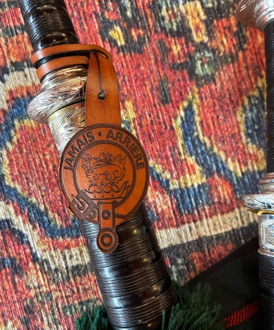 Custom-made leather clan badges for your bagpipe drones. Our drone badges will fit any Highland Bagpipe Drone or Small Pipe Drone. Made using top grain leather, embossed with your clan crest. The drone badges shown are for the Hamilton, Mackay, Douglas, and Maclean clans. The drone clan badges are finished by hand and will withstand rain, sun or snow.
