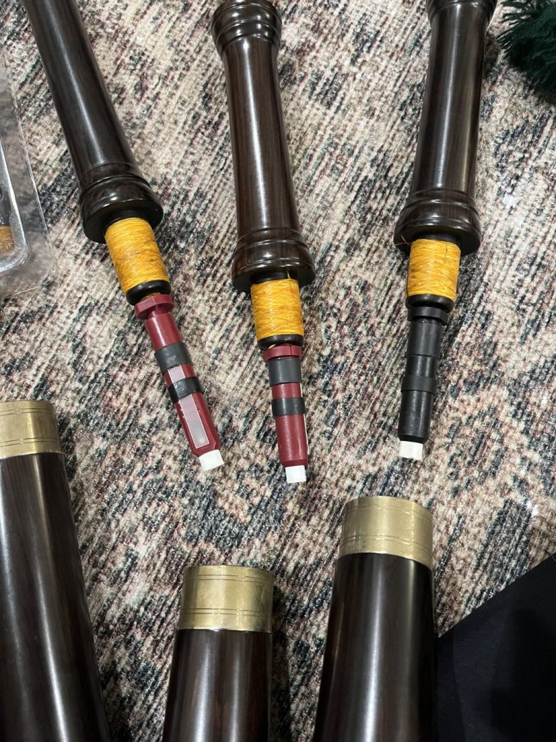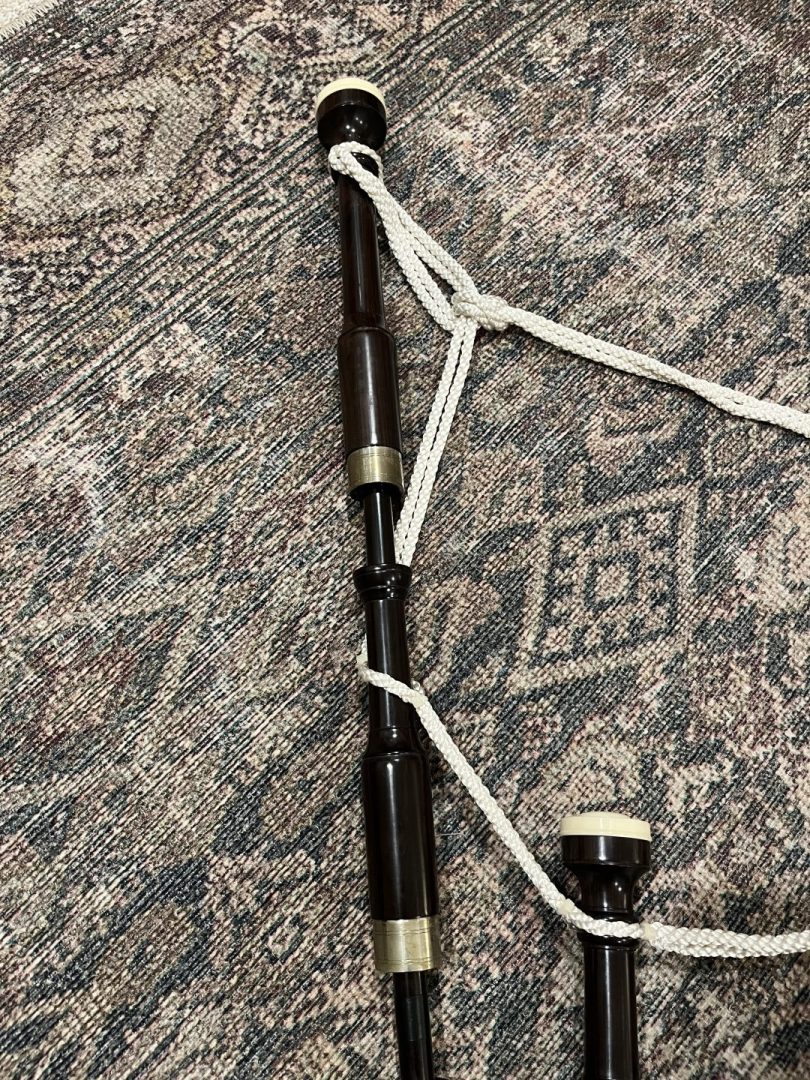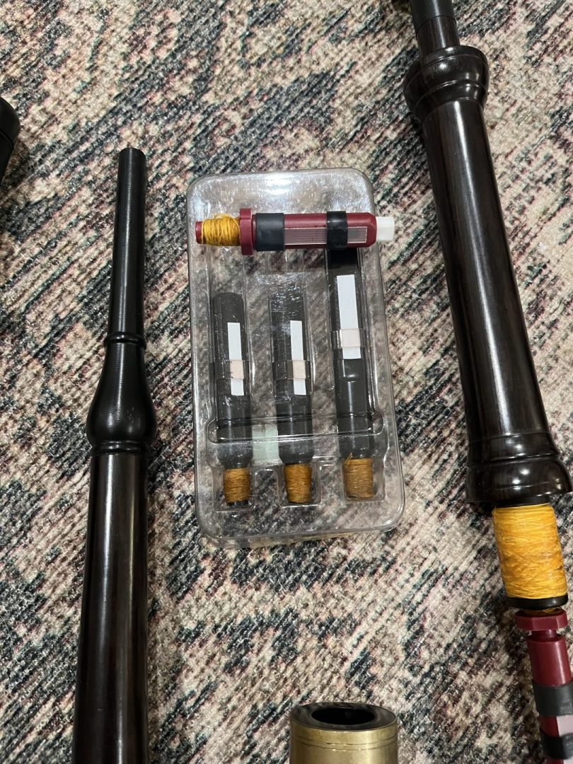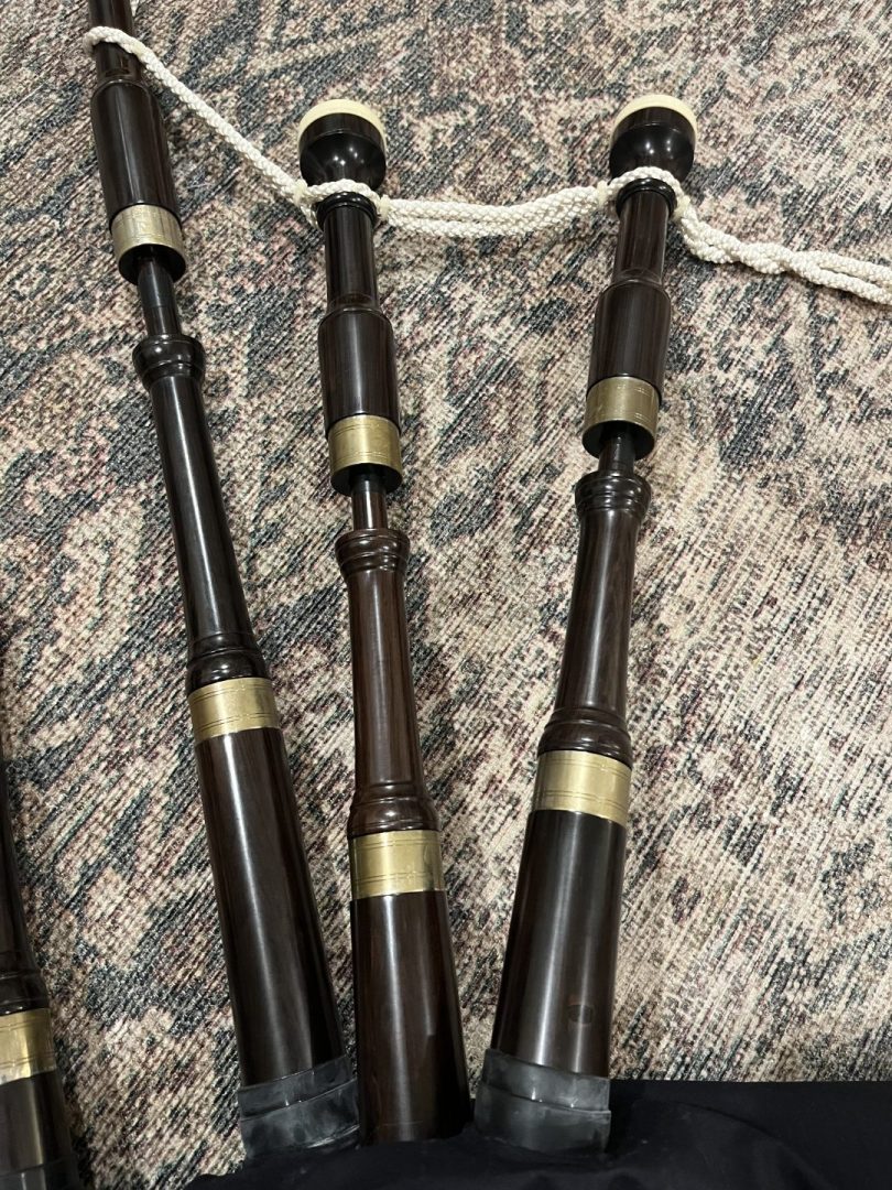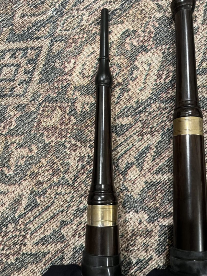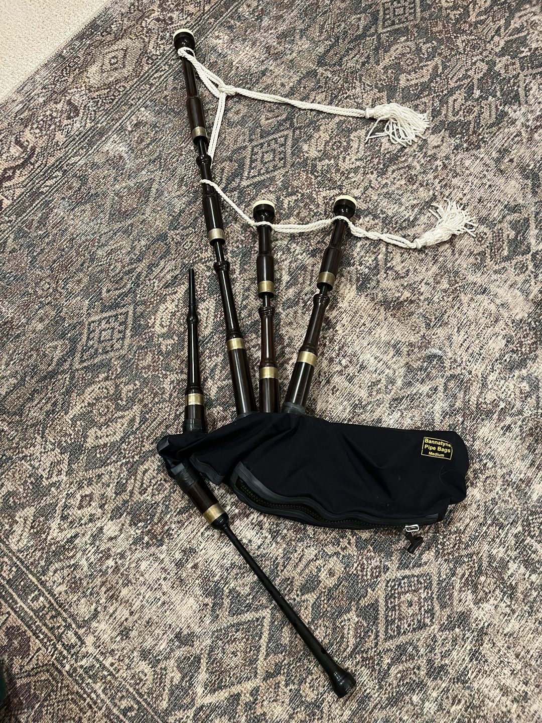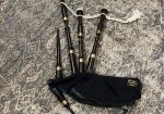 Bought these pipes back in late 2010 when I was playing in the pipe band in high school. I only used them for about 6 months and they have been in storage ever since. They work great, no sign of wear, just the nickel needing polishing. The bass drone does have a very very small chip in the imitation ivory, but no other damage or wear. I am not sure the exact model of McCallum as I purchased them through our pipe instructor at the time. They are McCallum African Blackwood, Plain turned. Bag is a Bannatyne Medium with the water trap. Possibly the classic collection from McCallum but not sure. Full set (no practice chanter) with extra drone reeds, bag cover, water trap. Shipping will be based on location and not included in price. Shipping to Canada is OK. Feel free to contact me with any questions.