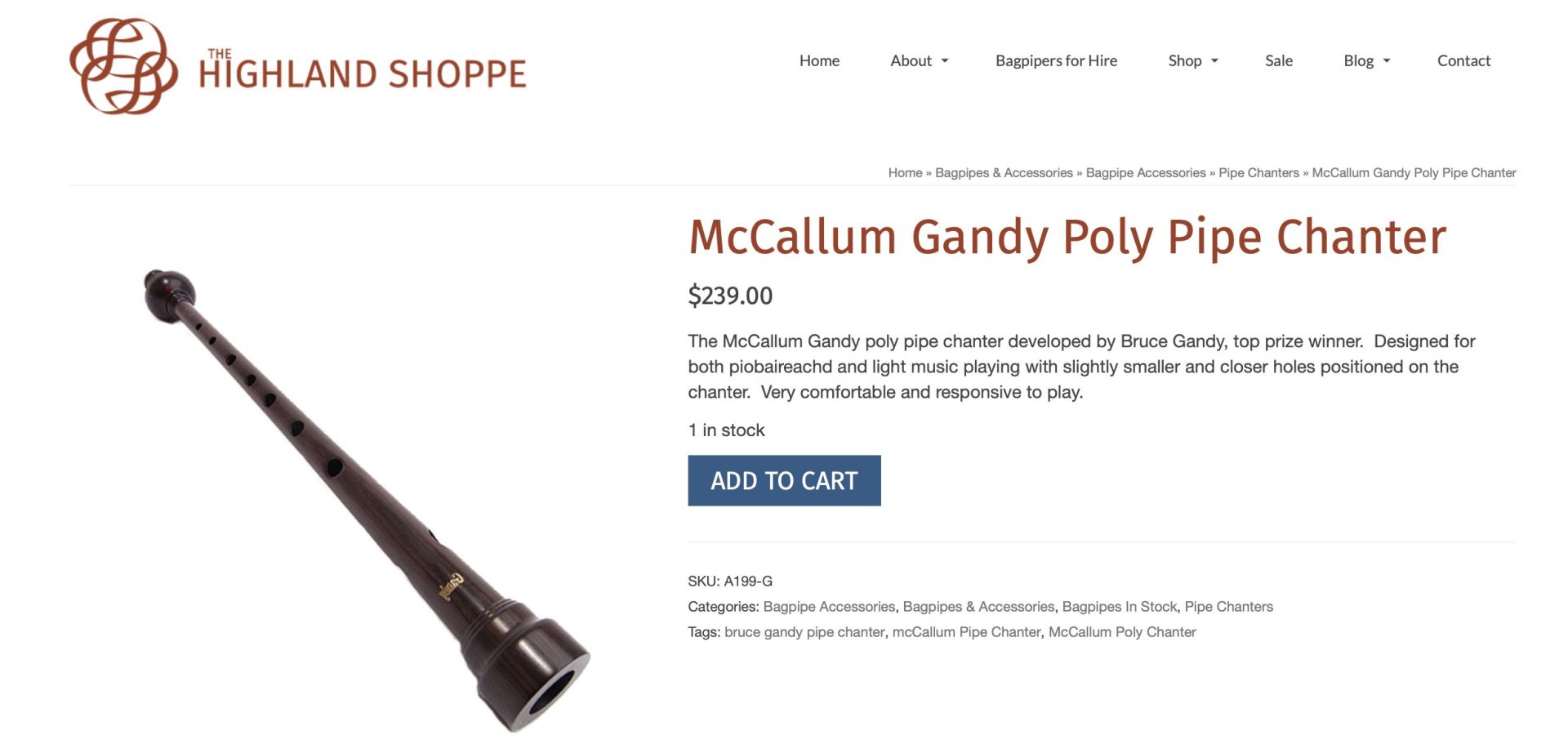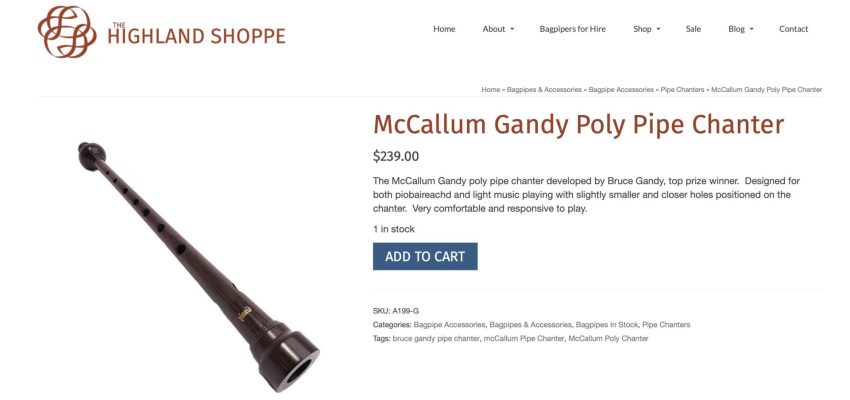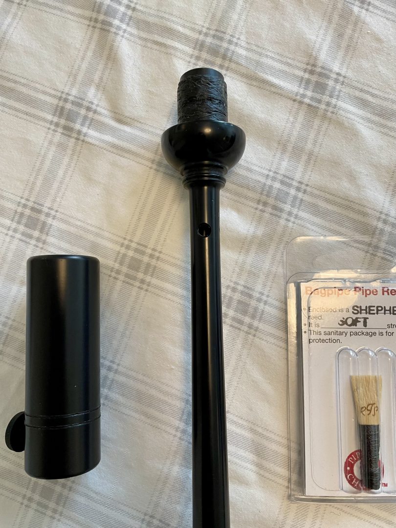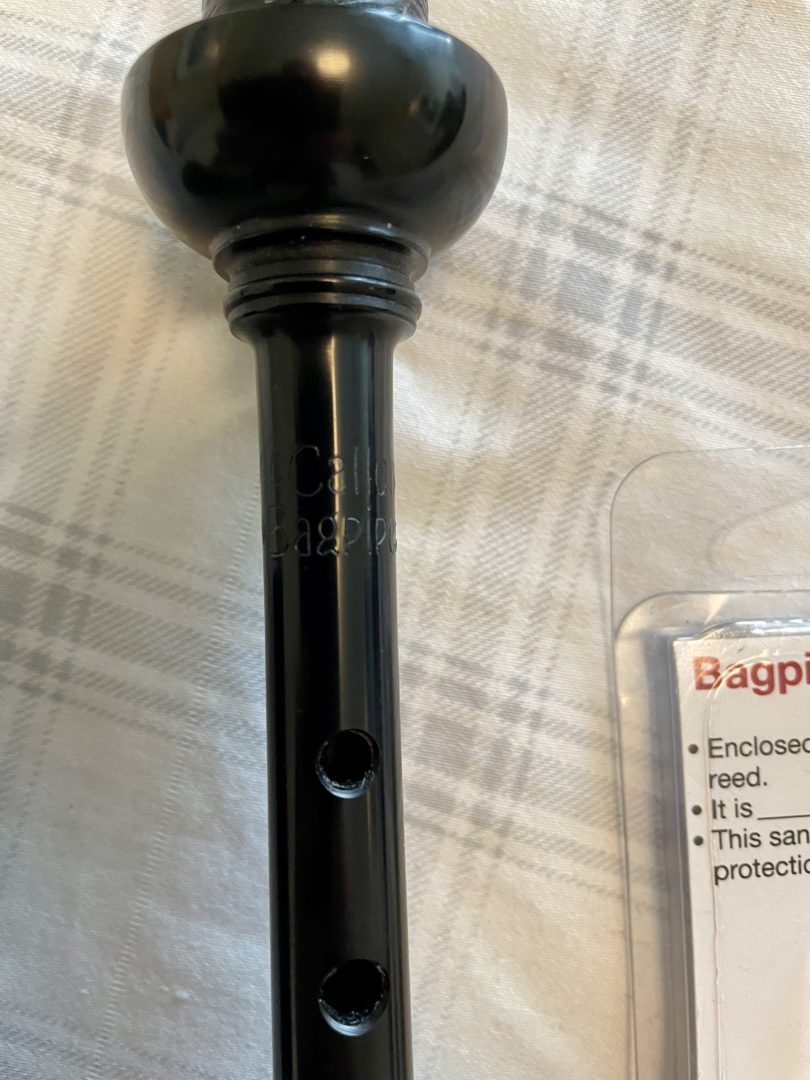 Basically new McCallum Gandy model polypenco bagpipe chanter, complete with new Shepherd easy strength reed, and chanter cap. Came with a set of pipes, and I already have one of these great chanters. Comfortable hole spacing and hole size, and pitches easily in the 478-482 range. $150 Canadian including shipping and insurance, or for my US friends add $25 for the tariff (or $130 US total shipped with tariff). Compare vs. new pricing.