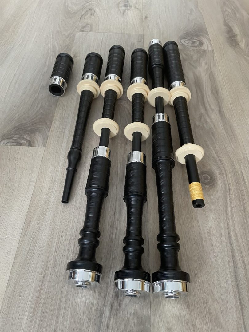 As new, maybe played twice, a McCallum polypenco P2 model bagpipe. Alloy ferrules and ring caps, with imitation ivory mounts. No bumps, bruises, or issues in this set-so little use that the original hemp is intact! These sets are virtually indestructible, lightweight, easy to reed, and sound fantastic. Great sets for travel, band, foul weather, and for students. Compare vs. new at $1150 Canadian plus shipping and taxes, this set is $875 Canadian including shipping and insurance in N. America. For my American friends, add $100 Canadian for your tariff (tax), so a total of $975 Canadian, or approximately $710 US.