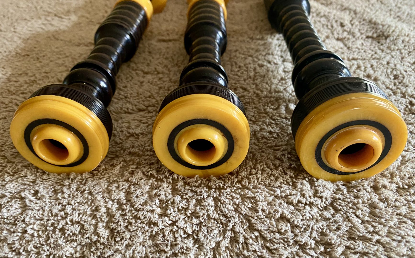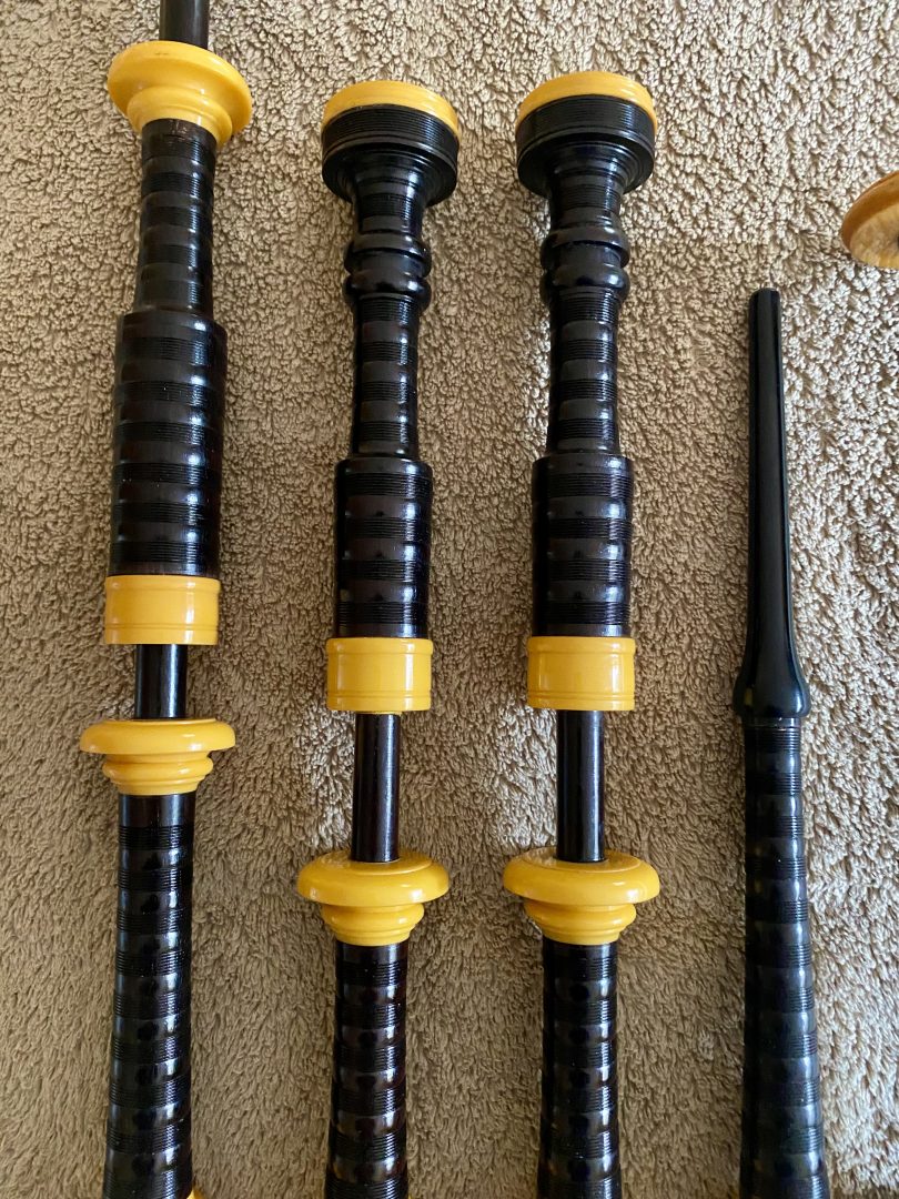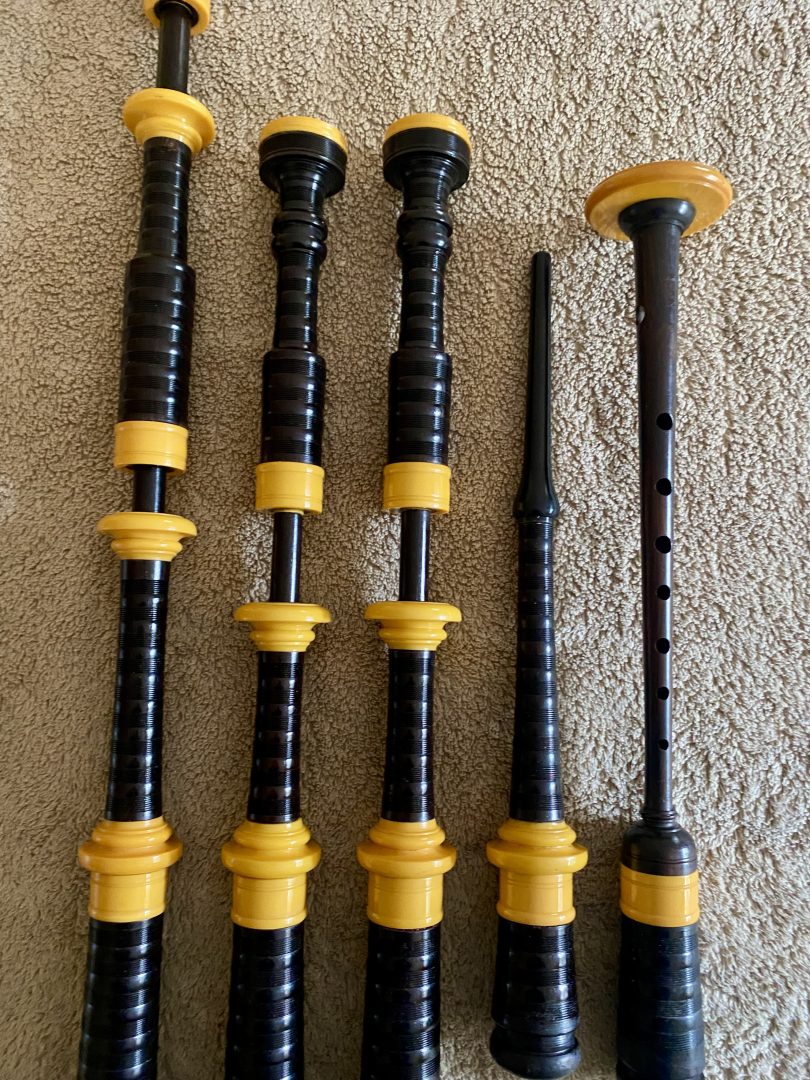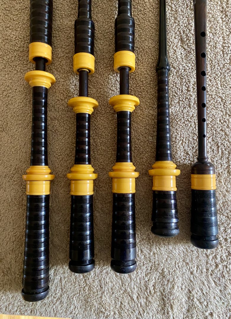 African Blackwood R G Hardie bagpipes with imitation mounts, ferrules and ring caps.