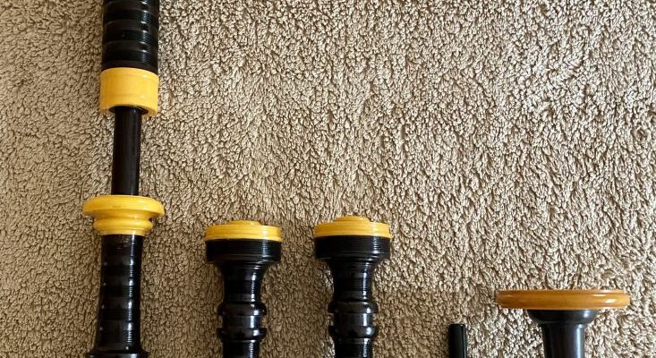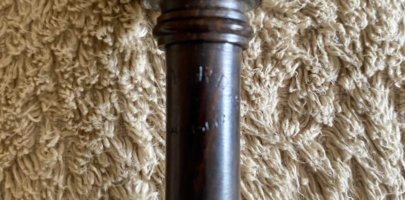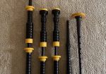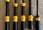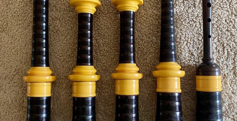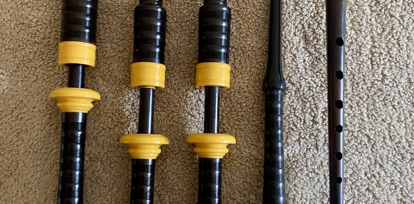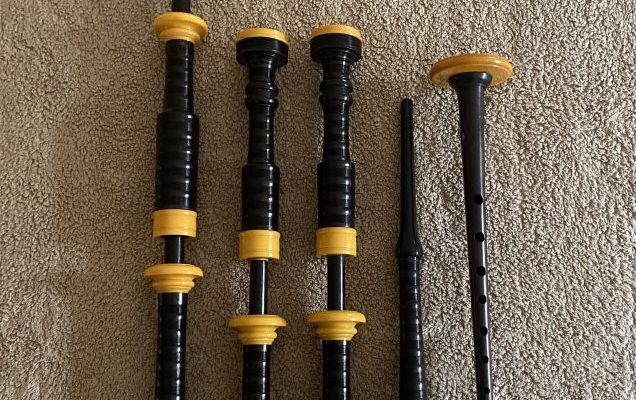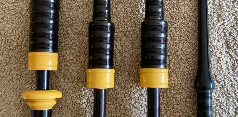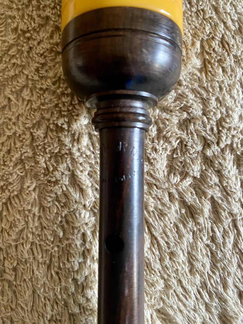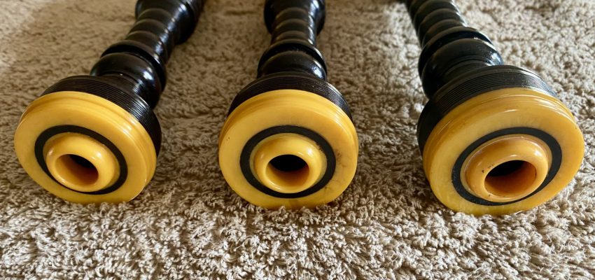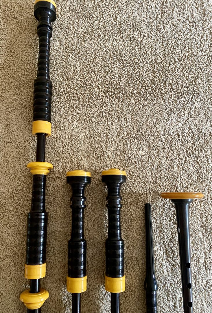 African Blackwood R G Hardie bagpipes with imitation mounts, ferrules and ring caps.