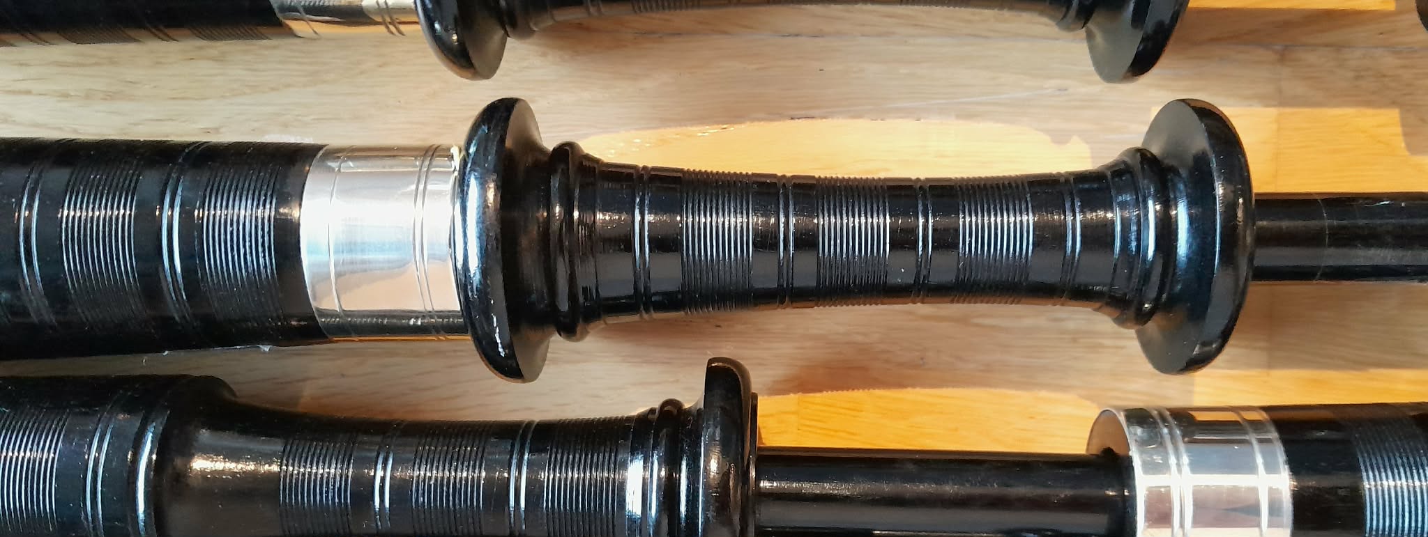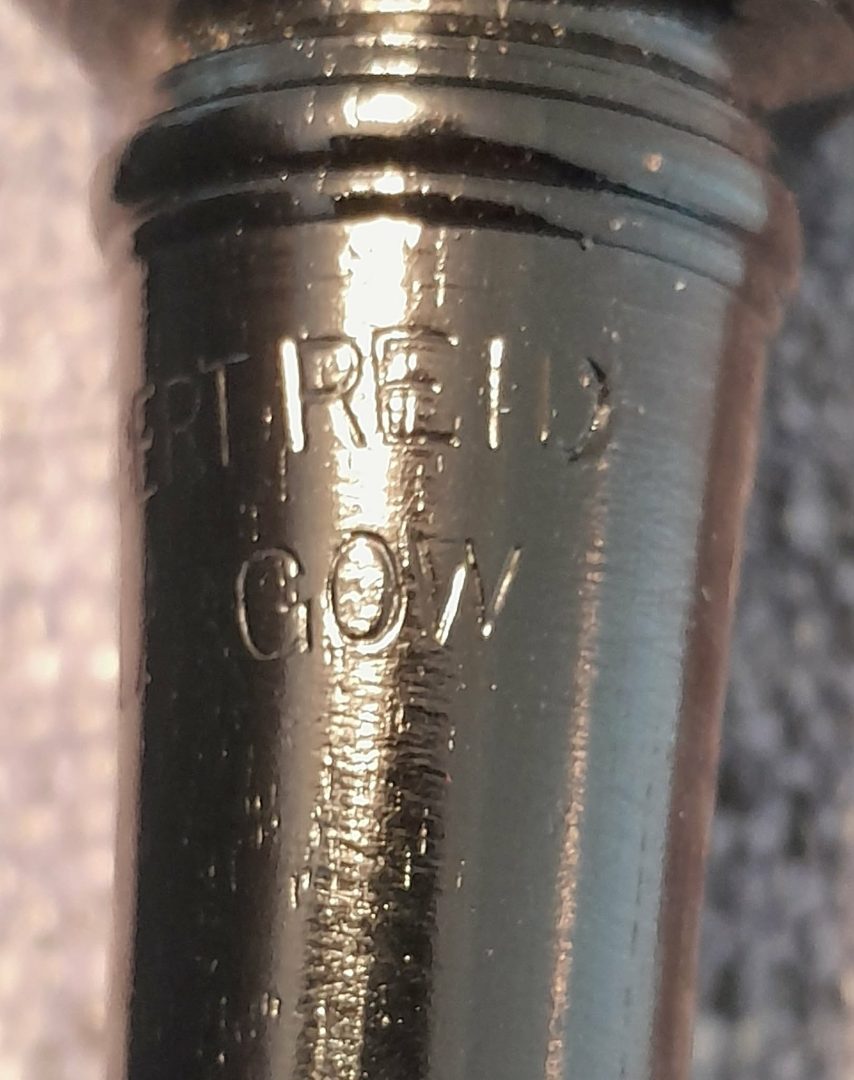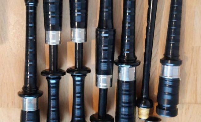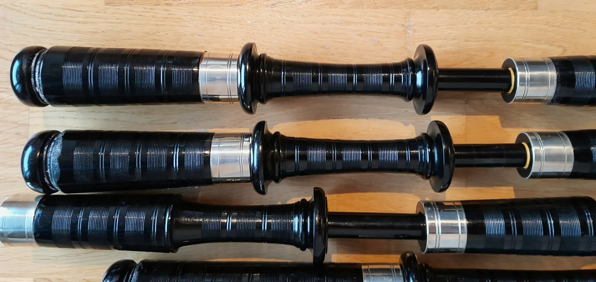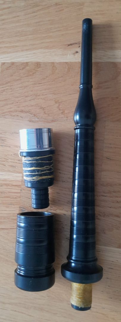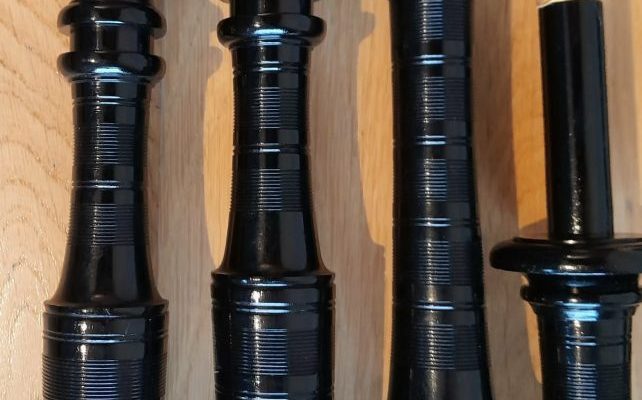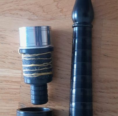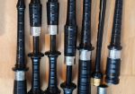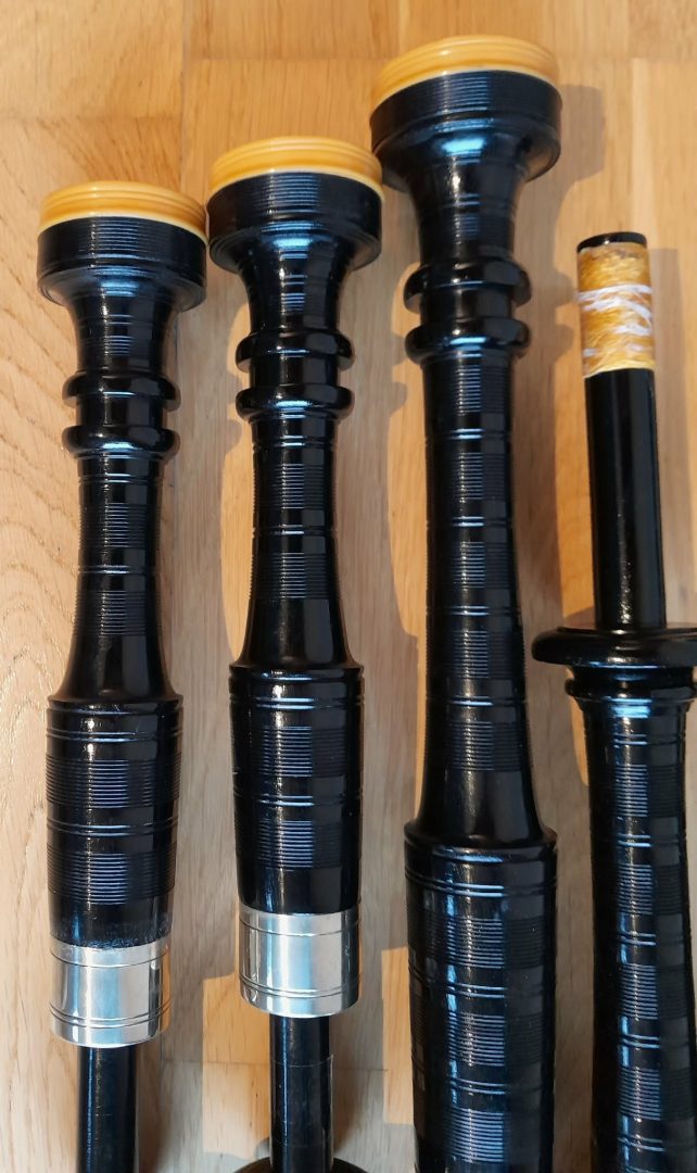 Presenting here a rare find indeed. Robert Reid (The king of pipers) African blackwood, nickel and catalin set from 1940s. These had never been put into regular play before I bought them a few months ago. I am told by “Source bagpipes” that they were part of a collection held by the Reid family that was sold off a few years ago. They show absolutely no sign of use. Even the original Bakelite mouthpiece doesn’t have a mark on it. I have gently brought them back to life with short periods of play and a very light oiling of the bores. They have been kept in a humidity controlled case. I am including a poly “Big Bore” blowpipe and split stock to give the buyer the option of not using the original if so desired. The original RR blackwood blowstick and stock are in perfect condition. There is a surface crack in one mount on the bass bottom section. It was there when I received the pipes and has not moved. Selling a sticks, stocks, extra blowpipe and stock and the original RR. chanter which play nicely at Bb flat (466). Shipping with tracking and insurance is £27 gbp. Paypal preferred. Price = £895 gbp or 1035 euro.