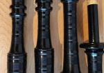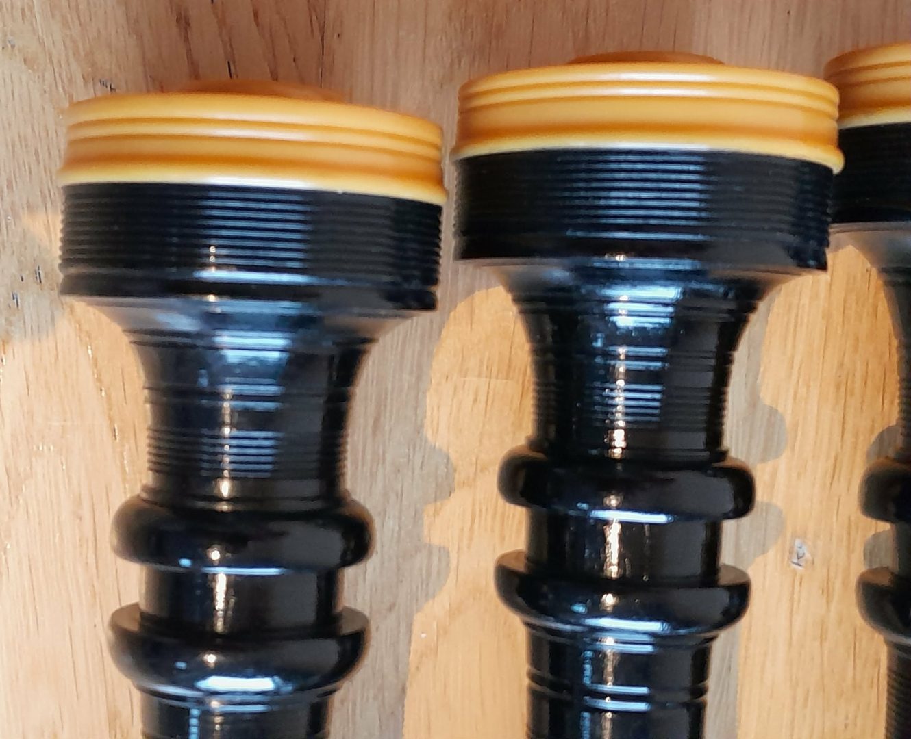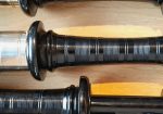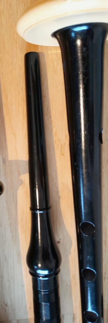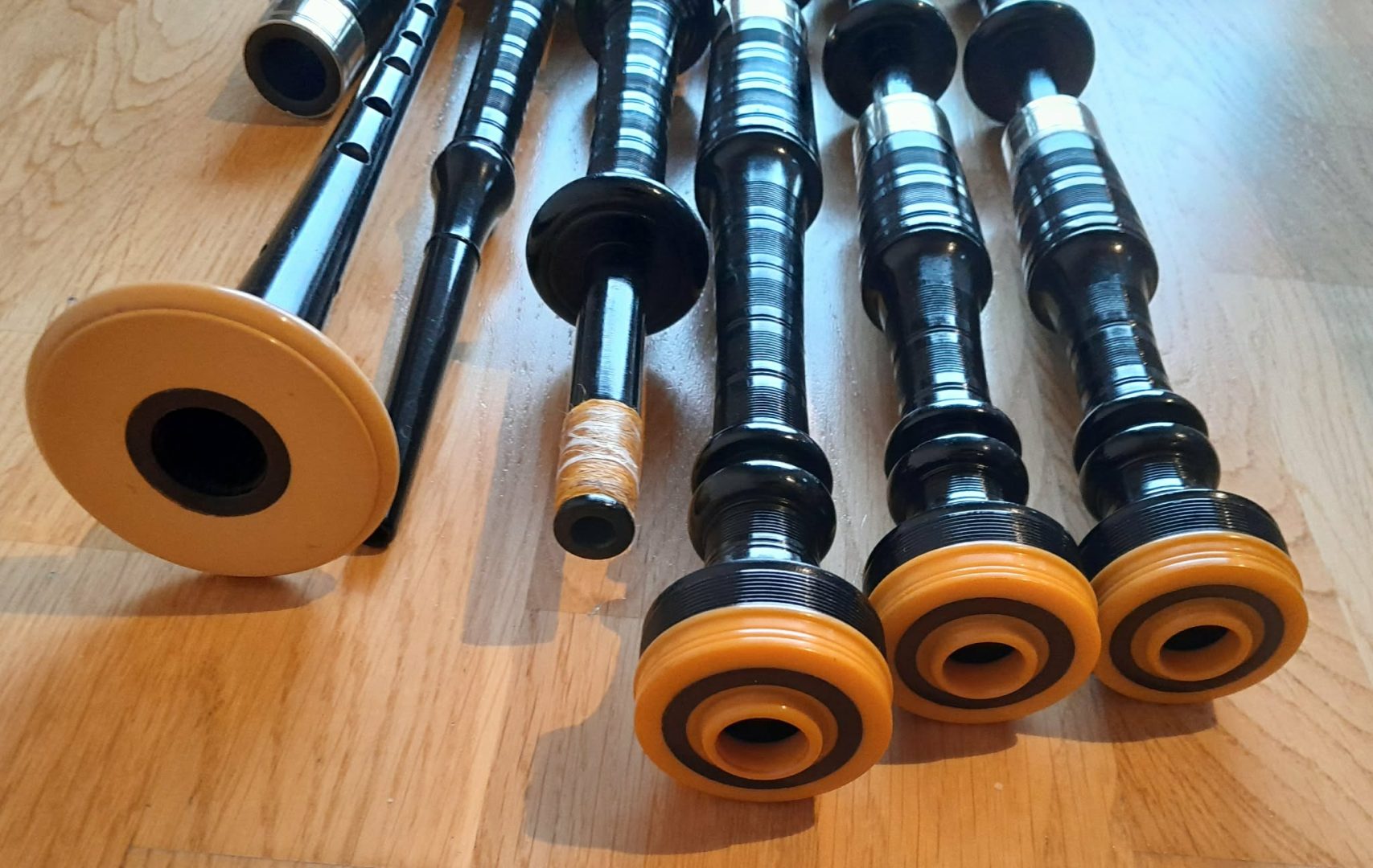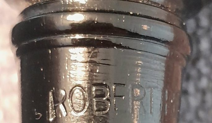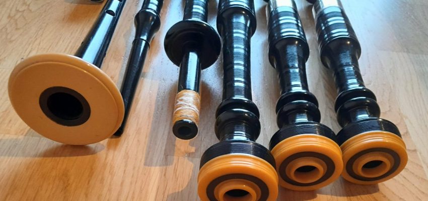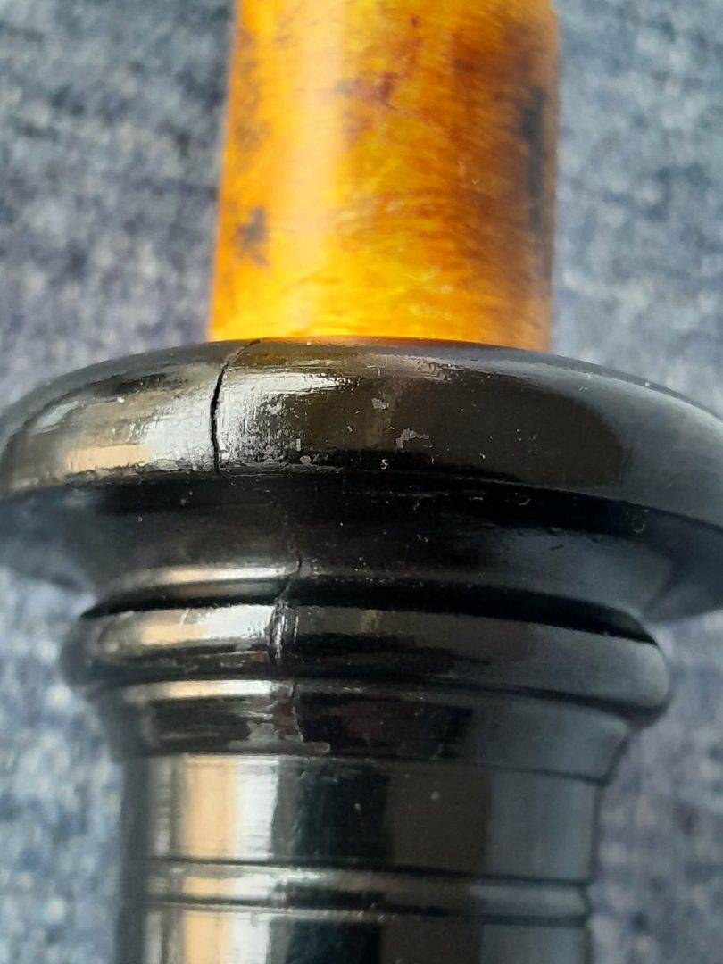 Presenting here a rare find indeed. Robert Reid (The king of pipers) African blackwood, nickel and catalin set from 1940s. These had never been put into regular play before I bought them a few months ago. I am told by “Source bagpipes” that they were part of a collection held by the Reid family that was sold off a few years ago. They show absolutely no sign of use. Even the original Bakelite mouthpiece doesn’t have a mark on it. I have gently brought them back to life with short periods of play and a very light oiling of the bores. They have been kept in a humidity controlled case. I am including a poly “Big Bore” blowpipe and split stock to give the buyer the option of not using the original if so desired. The original RR blackwood blowstick and stock are in perfect condition. There is a surface crack in one mount on the bass bottom section. It was there when I received the pipes and has not moved. Selling a sticks, stocks, extra blowpipe and stock and the original RR. chanter which play nicely at Bb flat (466). Shipping with tracking and insurance is £27 gbp. Paypal preferred. Price = £895 gbp or 1035 euro.