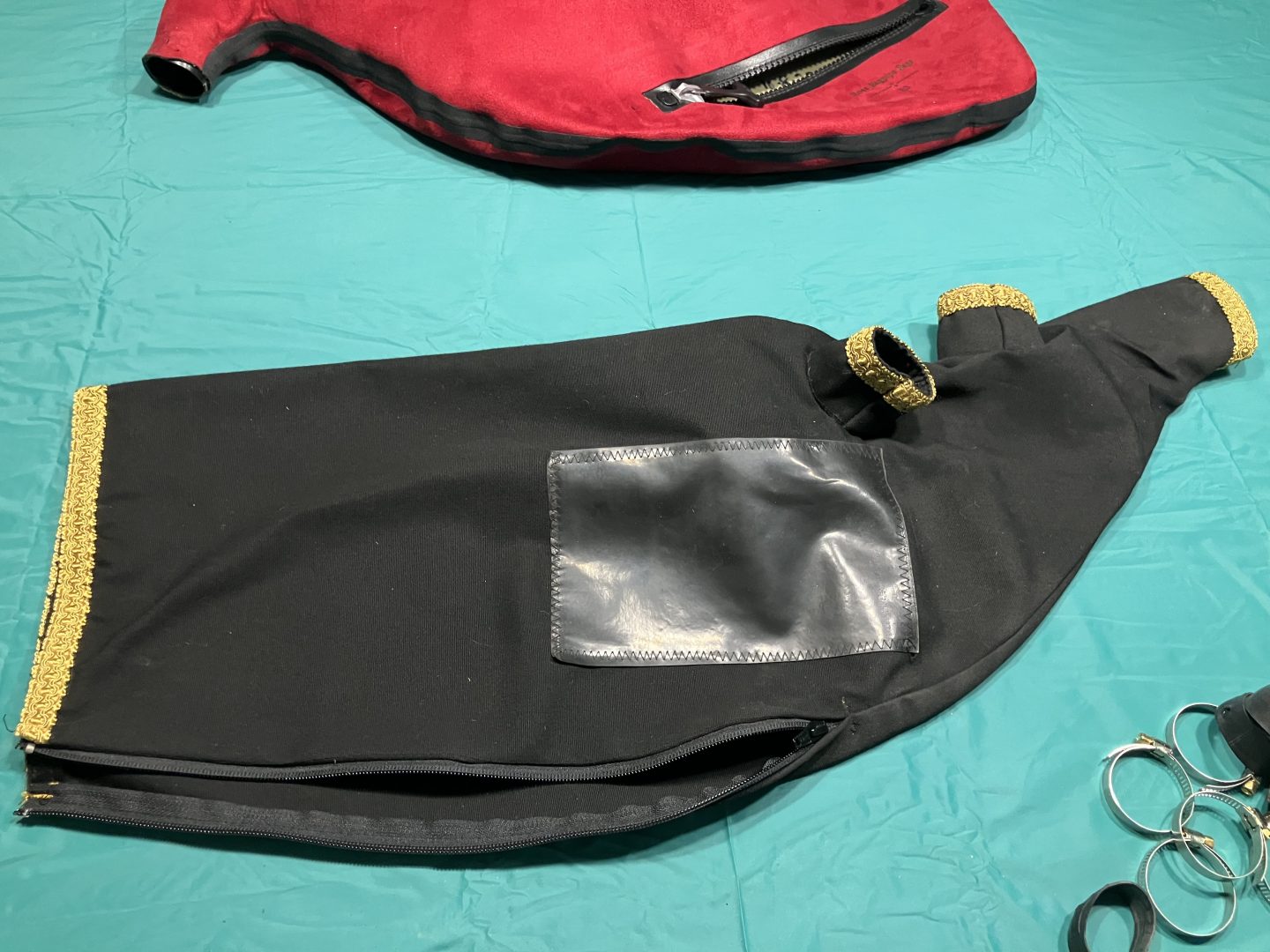 A very clean bag and cover. No damage. Never used in parades or in hot, humid summer conditions.