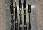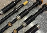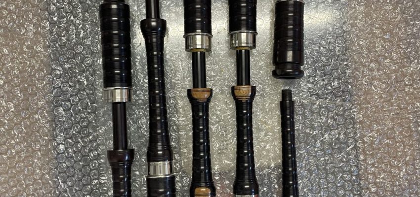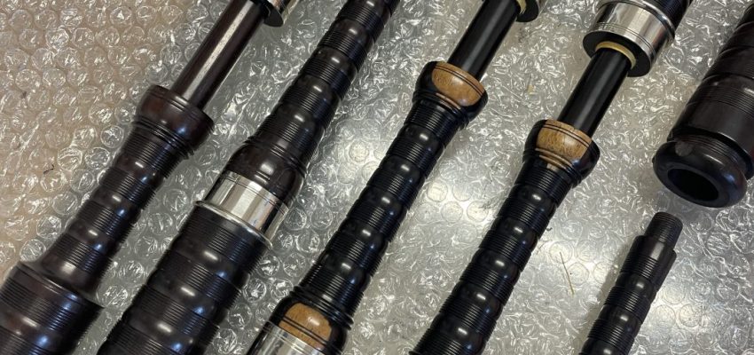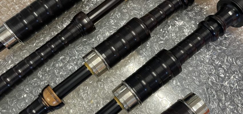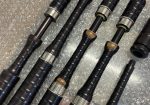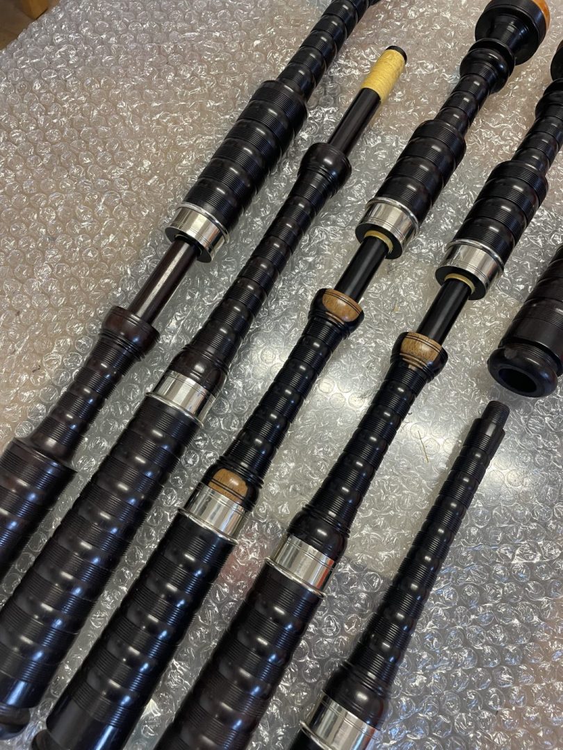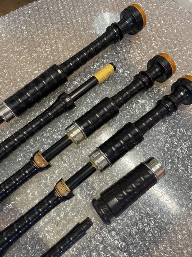 Set of Starck bagpipes. Full combed and beaded, button mounts, nickel ferrules with Catalin Ringcaps and bushes