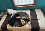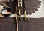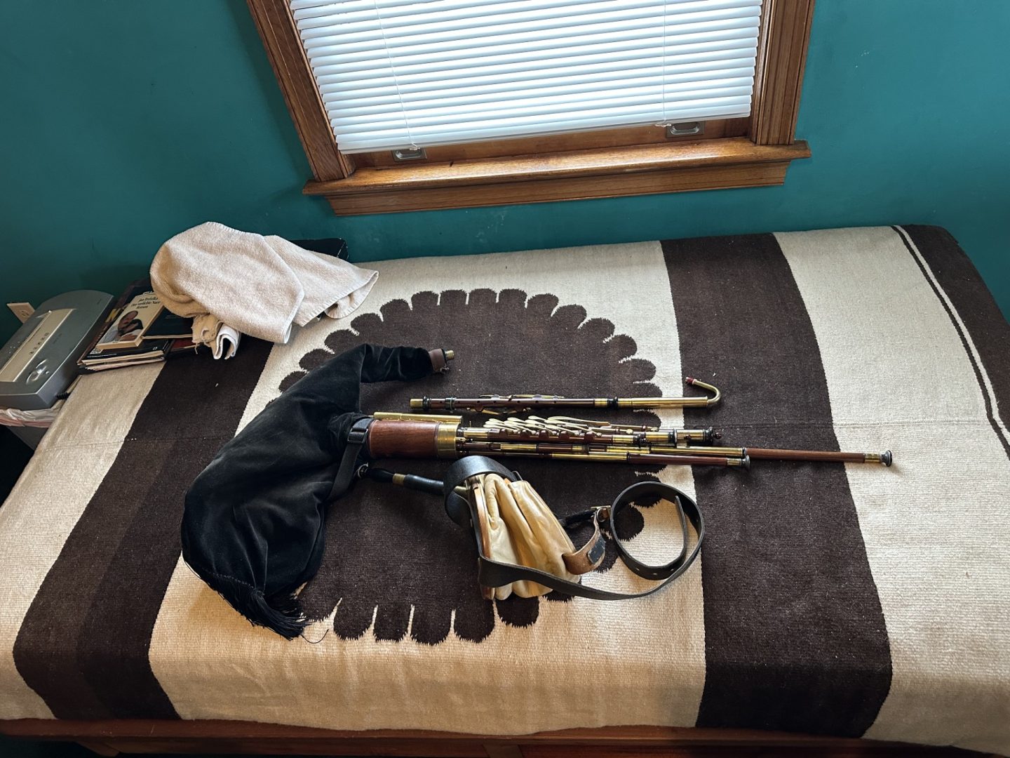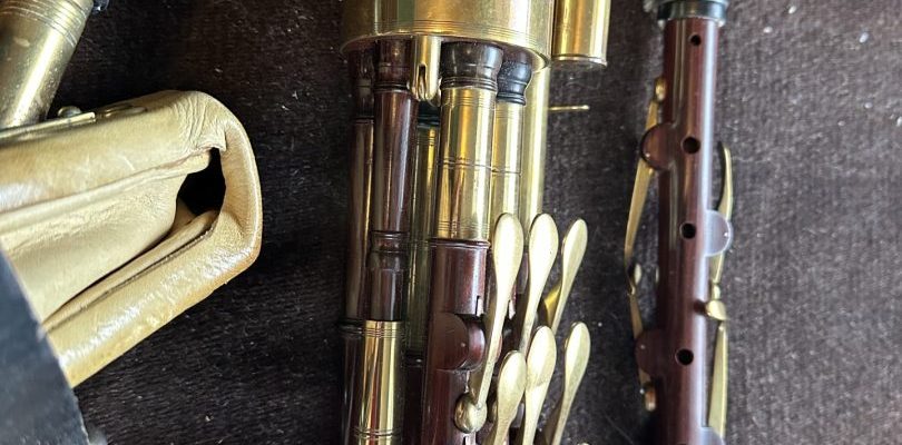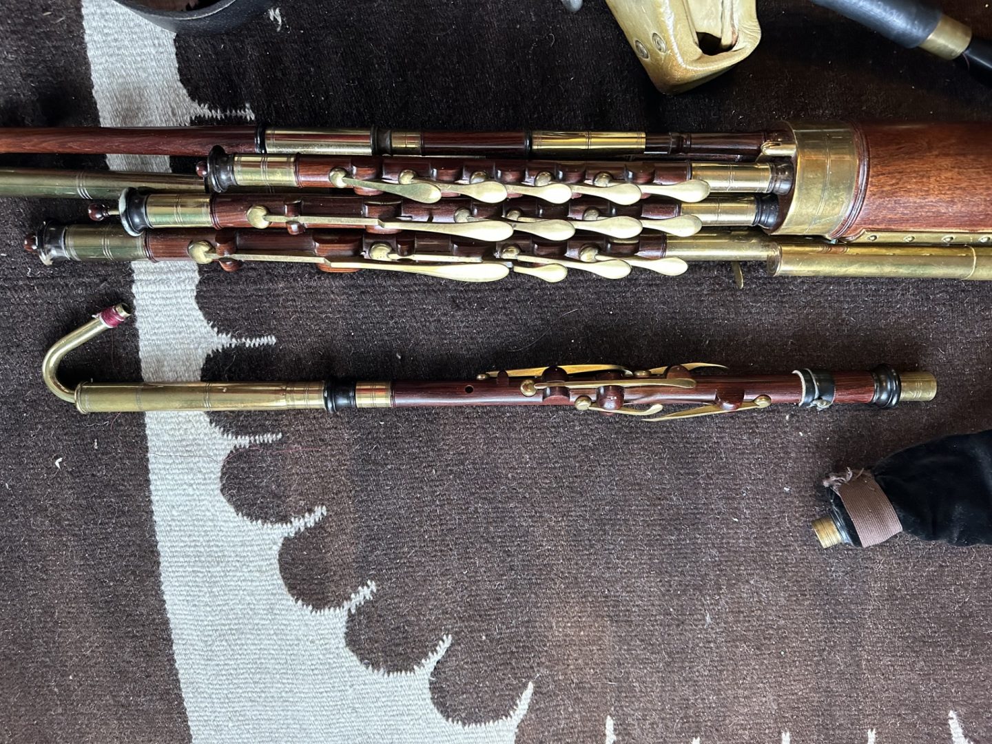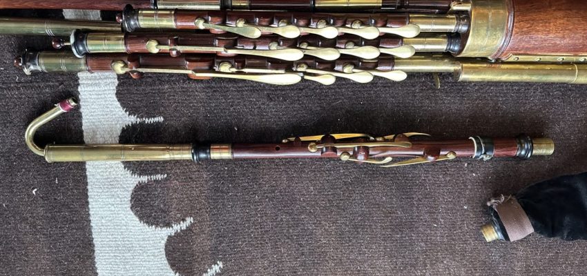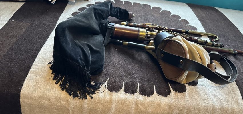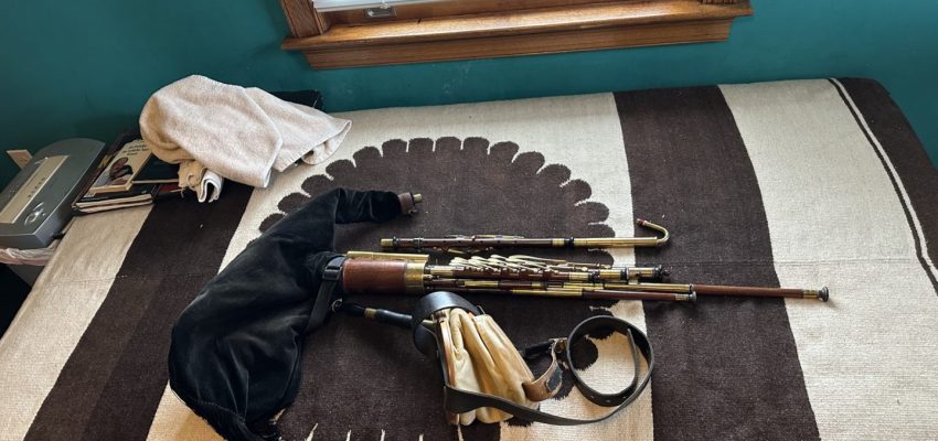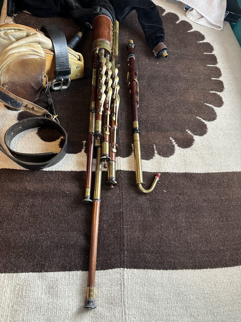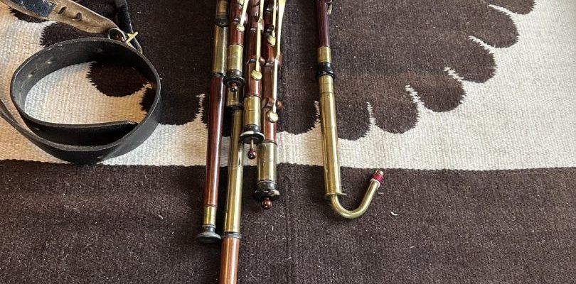 A full set of Uilleann pipes made by pioneering American uilleann pipe maker David M. Quinn in the Key of C. incorporating his superbly executed signature turnings. This set was commissioned upon the return of Quinn from Asia to the U.S. around the turn of the 20th century. Purchased virtually new in 1999 it has Serial #9901 on stock. 5-key chanter with horn mounts, brass keys, and brass reed cap. Pipes and mainstock are of perfectly matched, straight-grained medium-dense cocobolo wood with no evidence of pin Knots or other imperfections of any kind. The timber is immaculately polished and beautifully trimmed in premium Asian river water buffalo horn sourced from that which Quinn brought when he moved back to the U.S. Natural horn fittings are predominately black with the occasional streak of mocha and amber. Brass ferrules throughout. The drones are fashioned with hand-soldered, tapered drone slide ferrules, with no evidence of cracking at the wood lined mortice ends. The bass drone features a cannister type loop, and is on the “straight out” variety, accented proportionally to the tenor and baritone drones in natural horn terminuses. Of special note is the bass regulator extension which incorporates a back-turned bass regulator reed cap for comfort and ease of play. Regulator keys are of the standard teardrop salt spoon style in neatly turned wood blocks. Springs are perfectly matched and firm, key travel is optimal, lateral play is minimal, and the geometry feels quite smooth overall, with no annoying high or low keys, and excellent availability of individual key touches. Natural horn fittings are found on individual pipes at the tenon ends at the main stock. The transverse drone stop switch is in perfect order and easily accessible. Padded bellows are of fine straight grain spruce or similar variety soft wood with an unusual asymmetrical or paisley shaped clapper design, featuring a hinge swooping higher to more closely follow the ergonomic movement of the players shoulder and to avoid interference of the bellows hinge with the main body of pipes. Yellow leather lined bellows are slightly stained, with water buffalo horn valve, and are the original bellows with this set of pipes. A large bag with matching fitments is airtight. This set has a light feel, a soft tone, and is relatively easy to blow. No major leaking or damage. Slight oxidation as the set has been in use for many years, yet it has minimal wear and an honest patina. Overall, this is an exquisite example of the pipe maker’s art by one of the foremost turners in the history of Uillean pipe making, and it exemplifies the confidence and long honed skills of a master craftsman at the height of his career. Still contains some original and stable reeds by Benedict Koehler, as well as a four year old Bigley chanter reed and two register reeds. The instrument was always played in a smoke-free environment. The set includes a professional grade aluminum musical instrument carrying case.