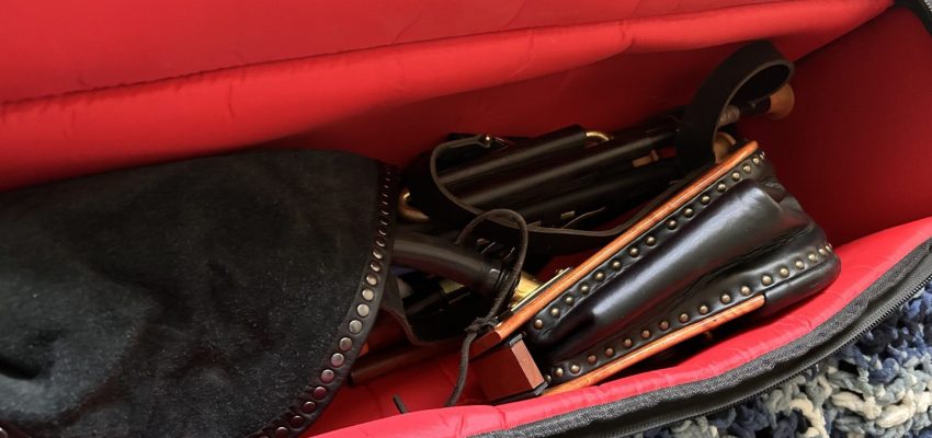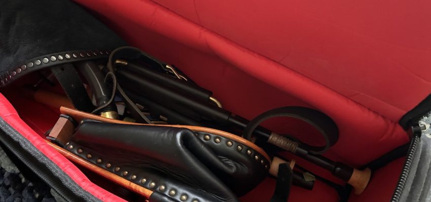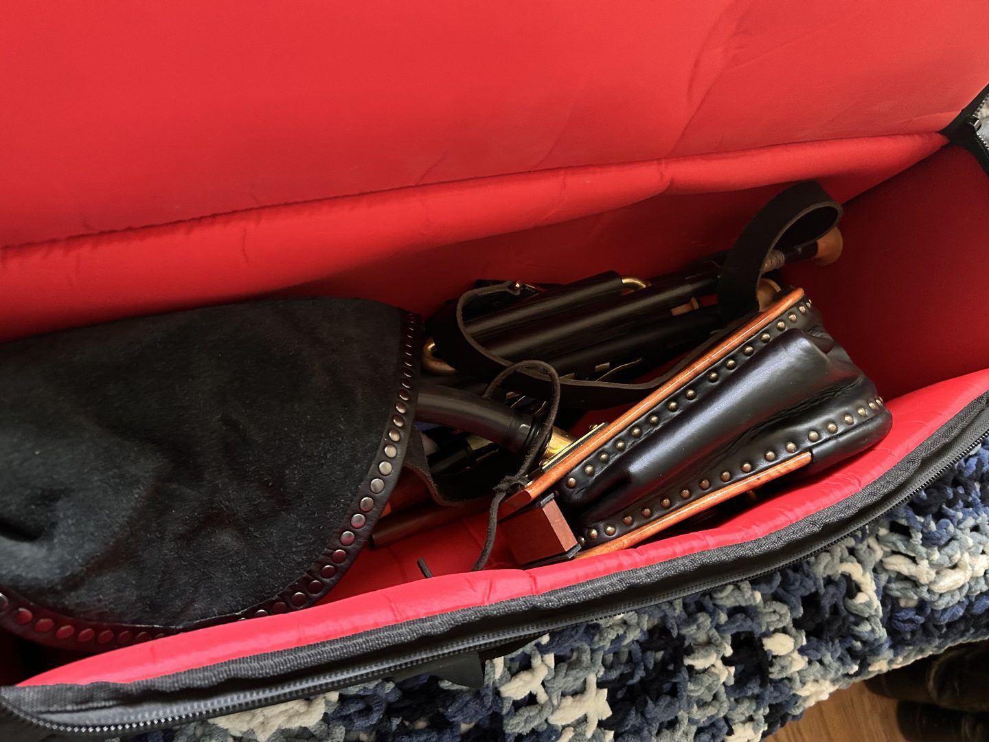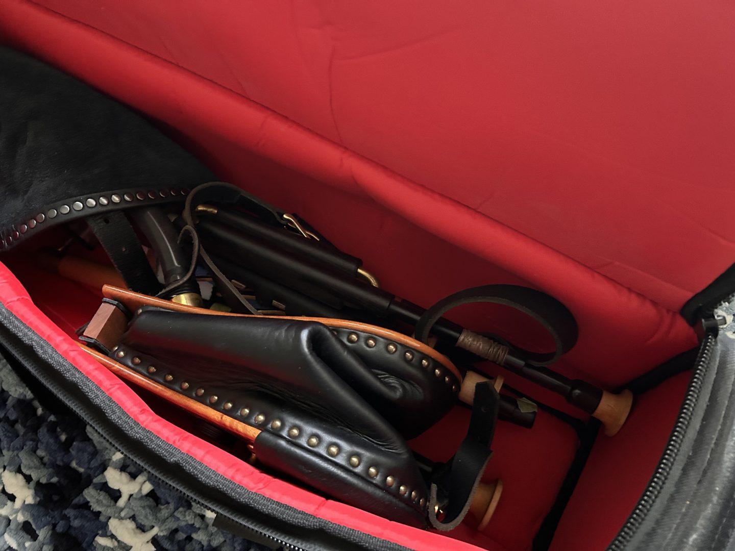 3/4 set concert pitch in “D” Joe Kennedy Irish Uillieann Bagpipe set with McConnell Cherrywood bellows and leather bag.