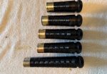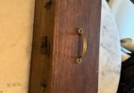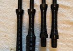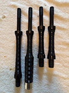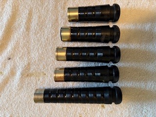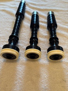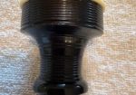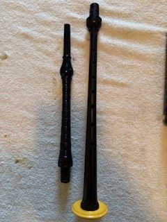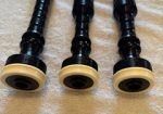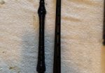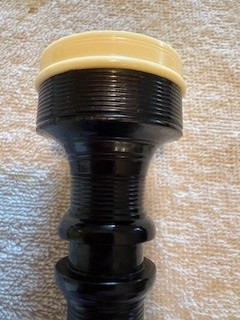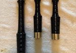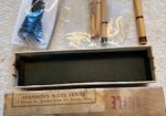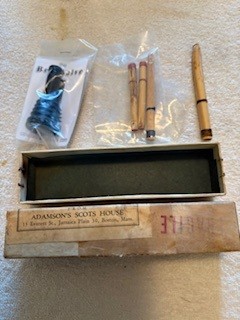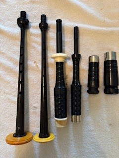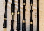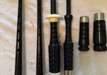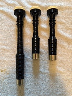 A beautiful set of 1940’s era Henry Starck button-mount parlour (7/8) bagpipes. The pipes are slightly smaller than a standard set, I have a picture of sections beside their full-size counterpart. The combing and beading are deep and well-defined. All parts are original, although the ring caps needed to be replaced and Dunbar did that work. The pipe chanter is stamped “Boosey & Hawkes Ltd. LONDON”, the retailer of the set. The ferrules have some tarnish and the chanter stock ferrule is a replacement that is a bit short. The set includes a brand new Bannatyne synthetic medium bag with tie-in cord, as the stocks are too narrow for modern grommet bags, and a new Beck blowpipe valve.