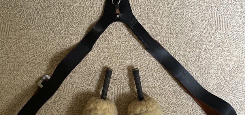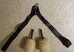Vintage L&M Highland Cross Belt single hook bass drum harness. Black leather, silver buckle, cast metal anchor hook . Also am including a vintage pair of Rnnie Brown bass mallets, known as the “Canadian Hammer”