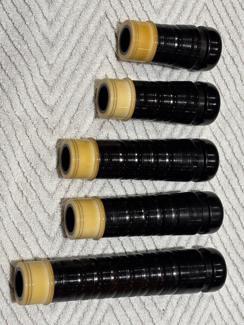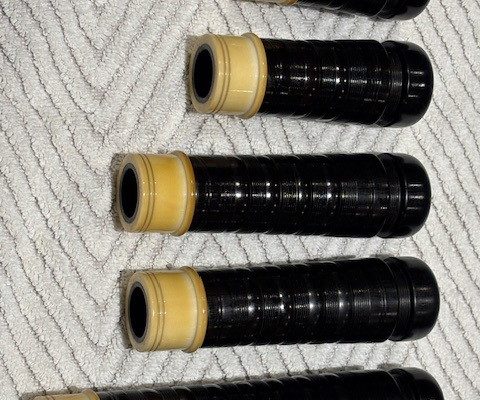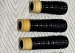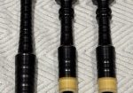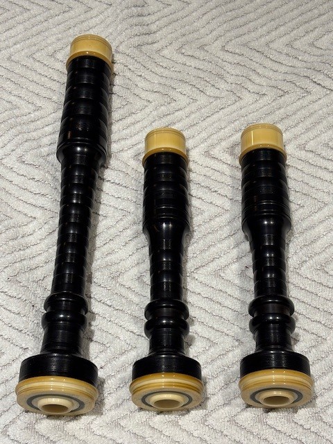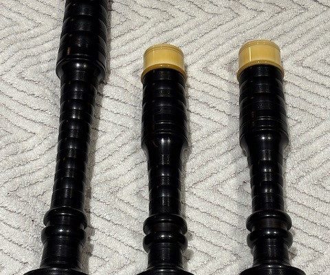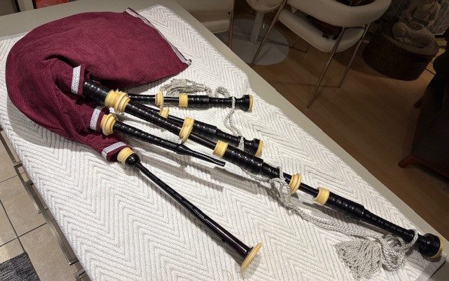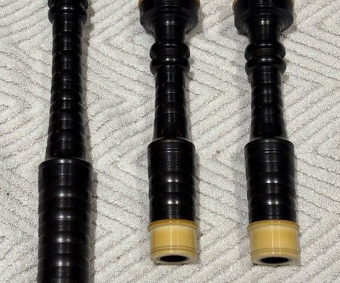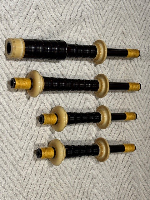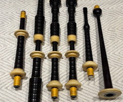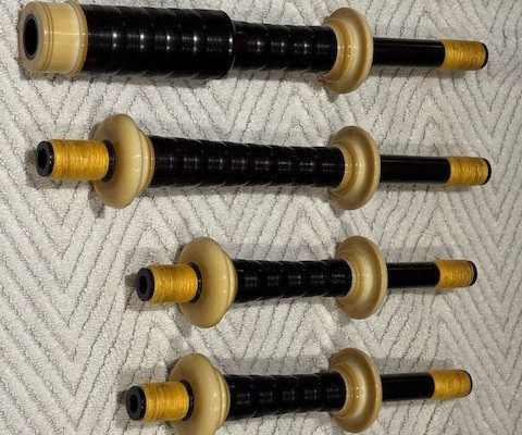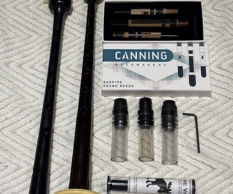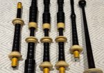 A rare opportunity to own a stunning set of vintage Peter Henderson bagpipes. These drones date to the mid-sixties when Greig Sharp, as shop manager, brought the brand back to prominence. Fully combed and beaded blackwood, retrofit with Naill aged imitation ivory projection mounts, ferrules, ring caps and bushings (no CITES issues). Had Naill strip and refinish the wood while they were there (receipts provided). The drones are stamped “P Henderson Ltd.” below the cord guides on all three drone tops and also just below the projection mount on the bass mid-section. The pipes come with the original pipe chanter, as well as an R. G. Hardie Infinity polypenco pipe chanter with cap. A set of Canning Drone reeds are also included.