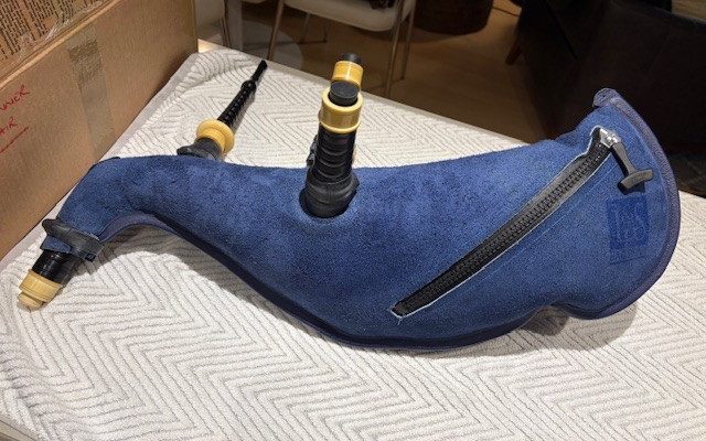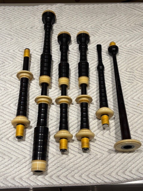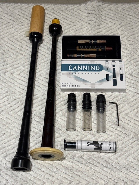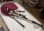 The pipes are in excellent condition, free of any chips or cracks, and the bores are smooth and laser straight, producing a classic Henderson sound, with harmonious tenors and dominant bass. The pipes come with a Lee & Sons zippered cowhide pipe bag (will probably need seasoning, as it sat around a while), an installed moose valve, a set of Hylands inline adjustable drone valves (not installed), a zippered bag cover and matching cords.